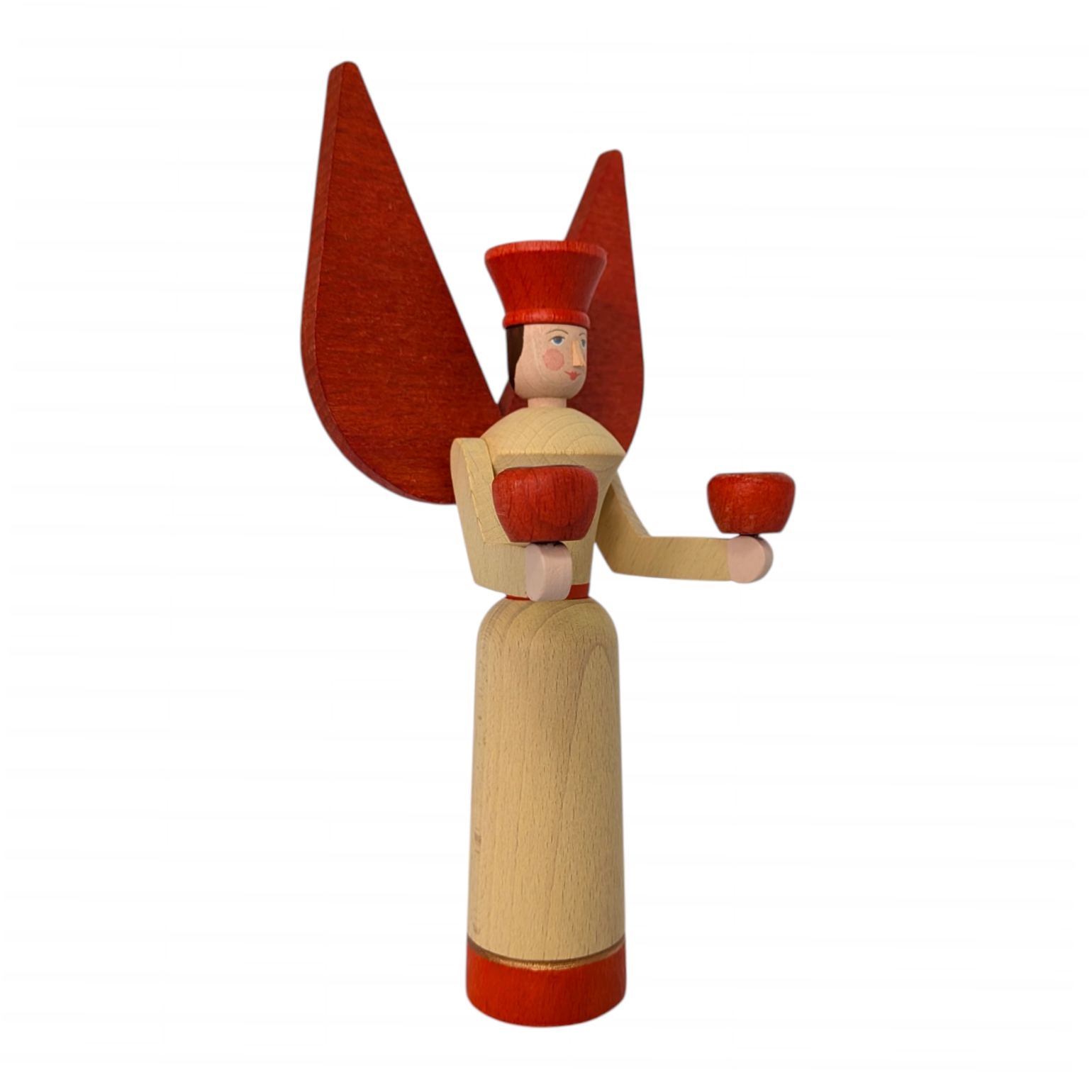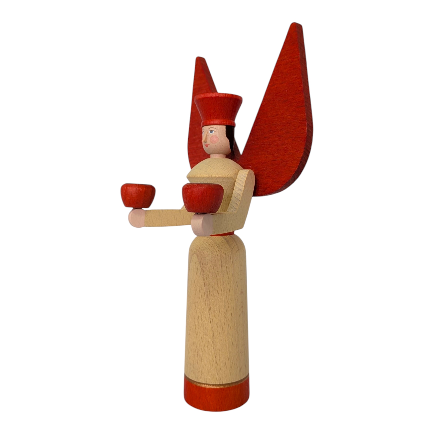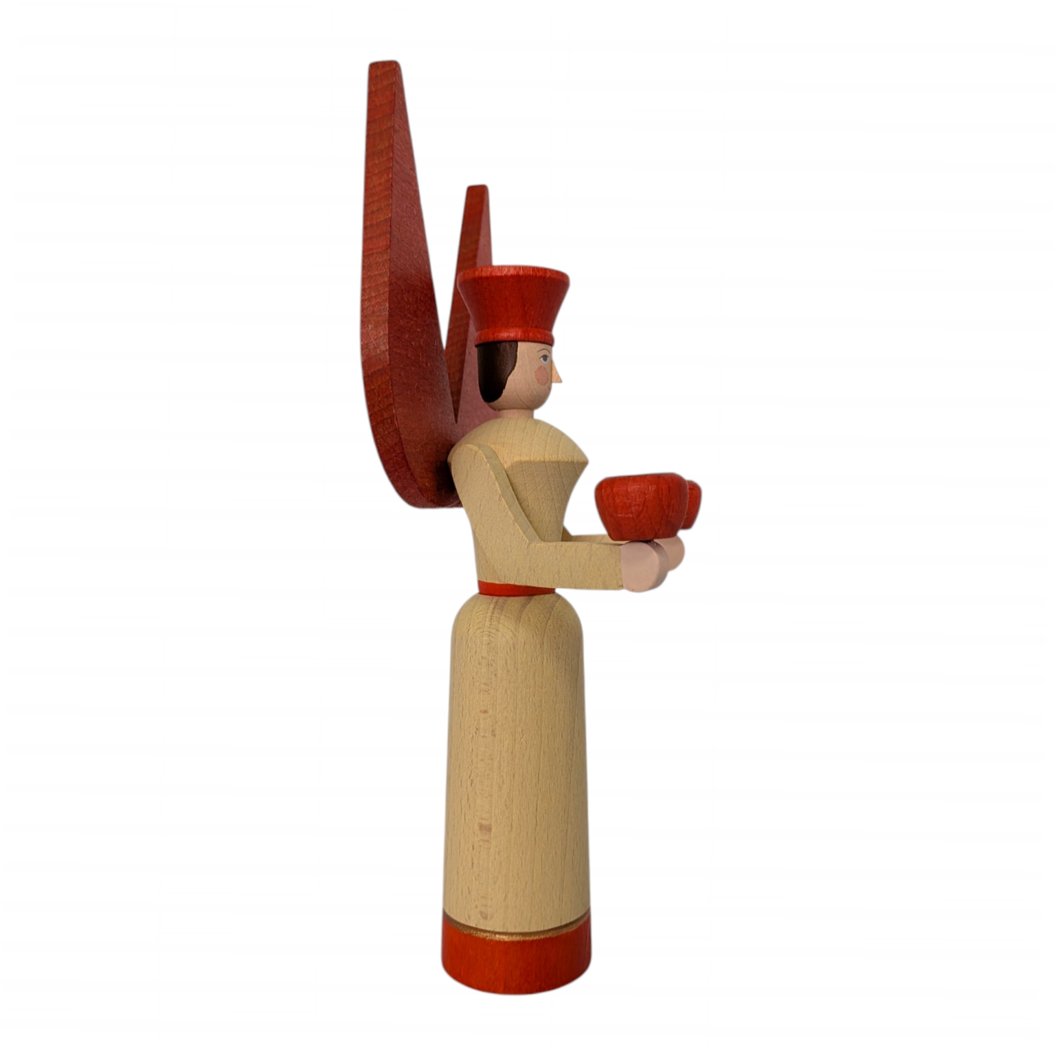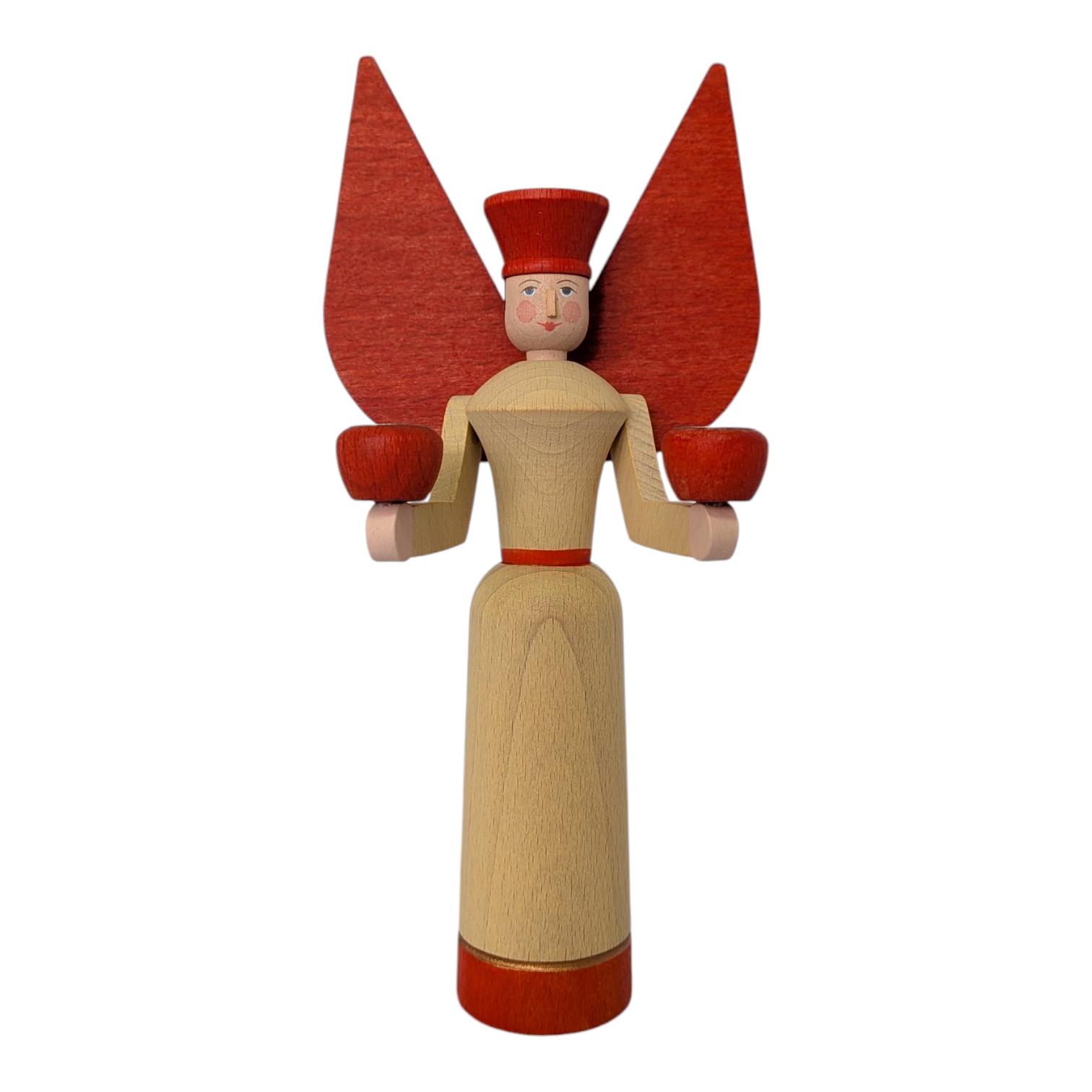 The angel is turned from natural beechwood. Its surface displays the warm, creamy grain of the wood. No two pieces are alike. A red band accentuates the waist. The base is also a rich red.