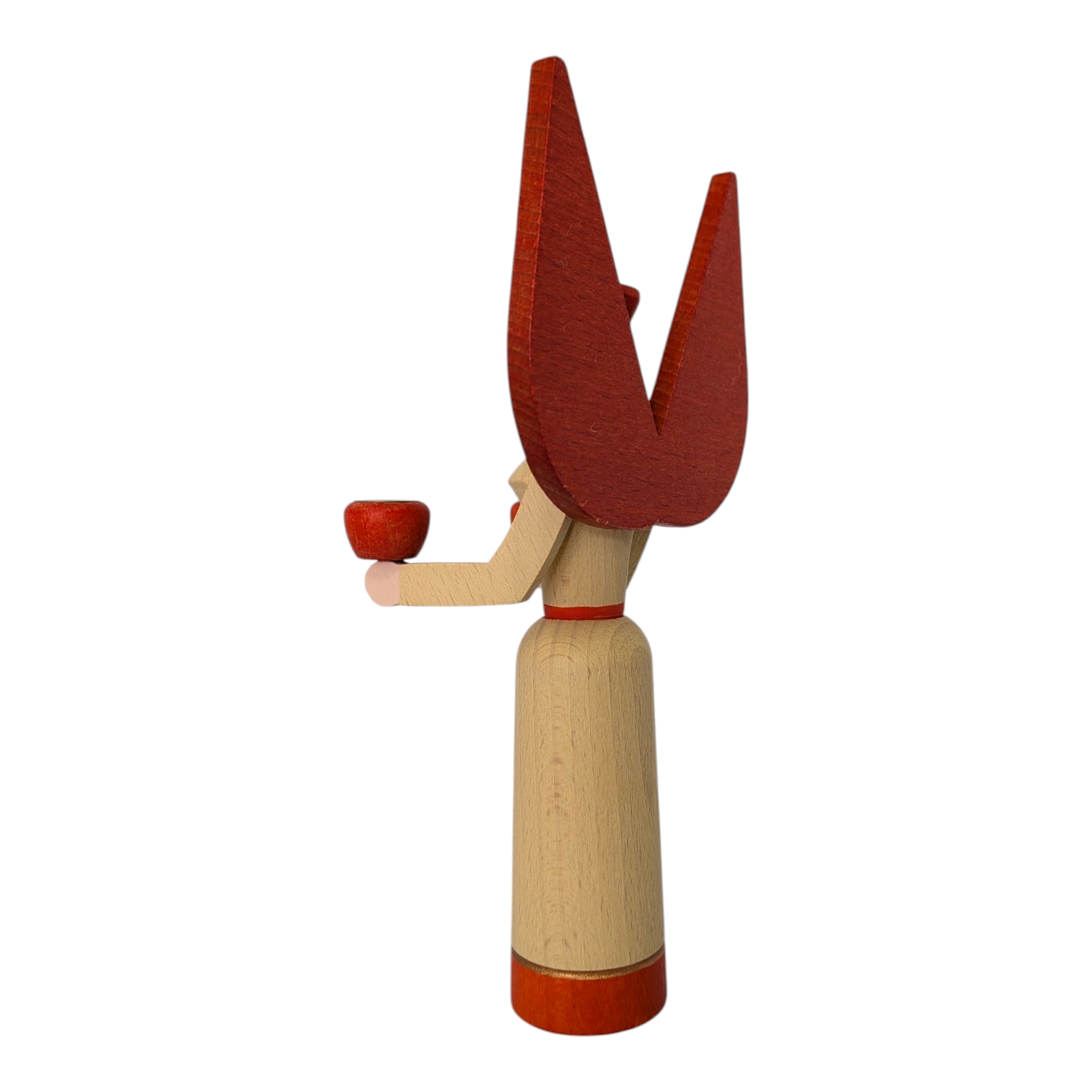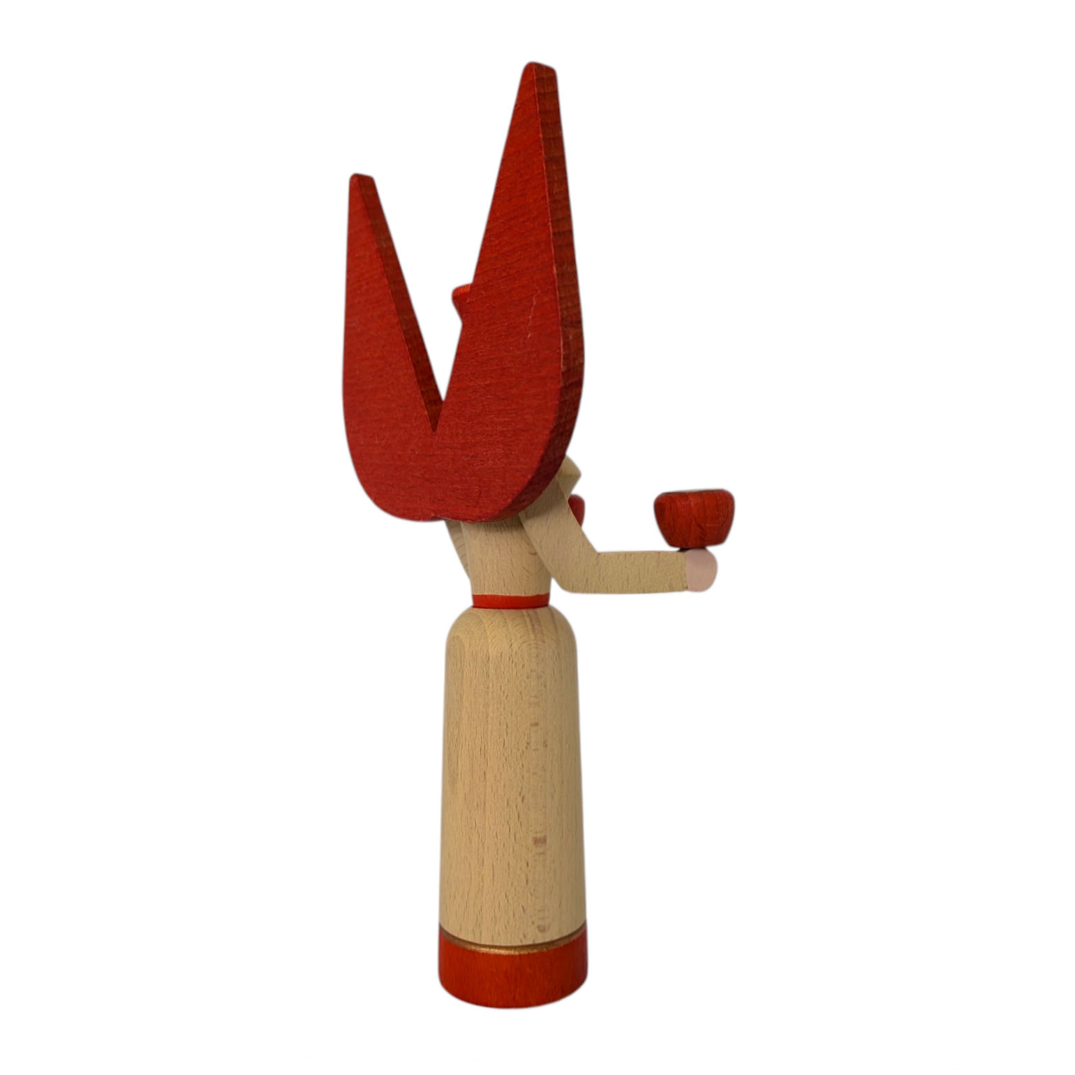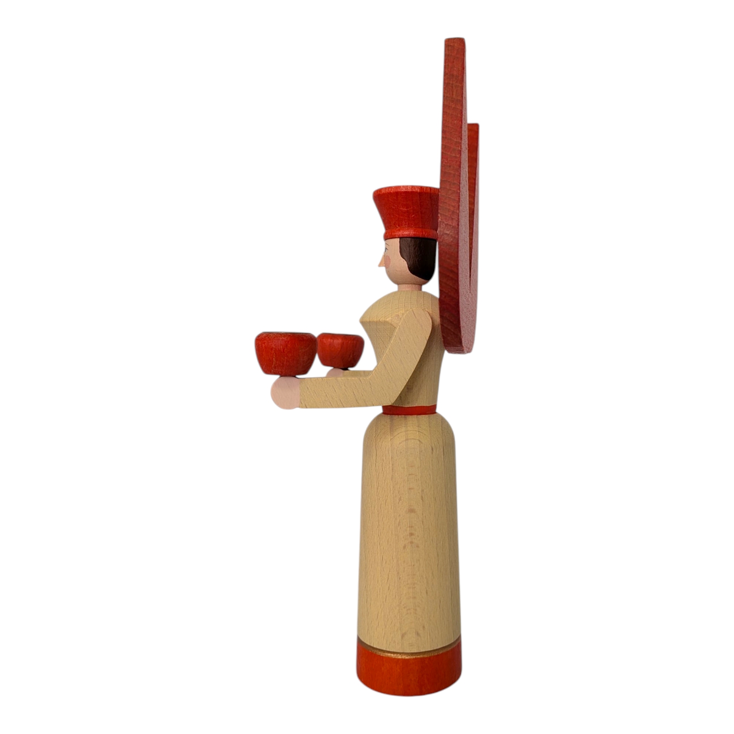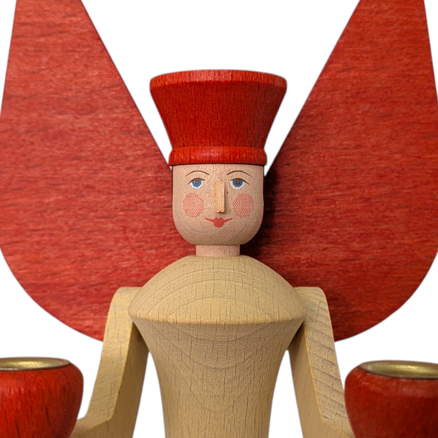 The angel is turned from natural beechwood. Its surface displays the warm, creamy grain of the wood. No two pieces are alike. A red band accentuates the waist. The base is also a rich red.