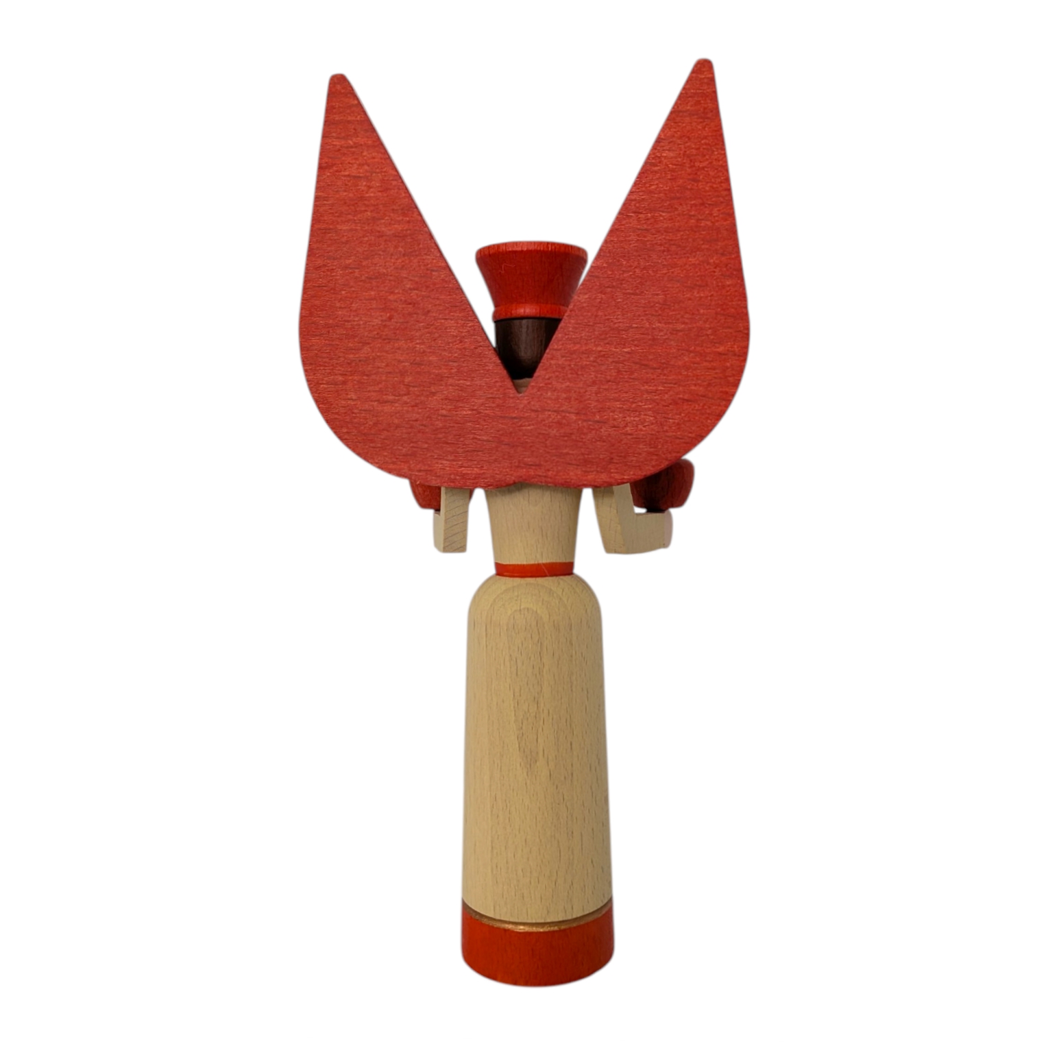 The large, curved wings are the centerpiece of the figure. They soar high above the head. Painted a deep red, they sometimes resemble flames, sometimes wide-open wings. The face is meticulously hand-painted: blue eyes, delicately rosy cheeks, and a friendly mouth. The angel wears a turned red cap on his head – a nod to the caps worn by miners in the Ore Mountains.