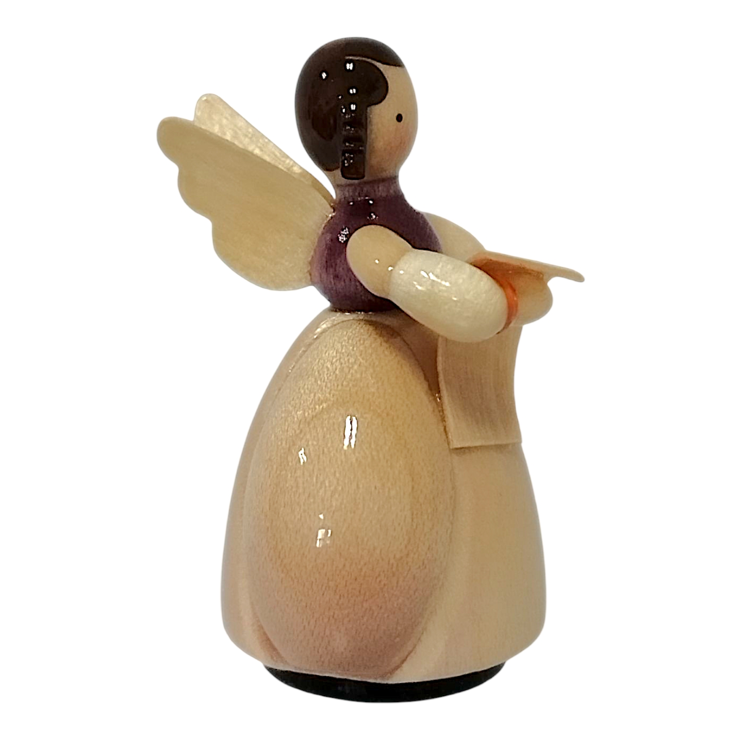 The little soloist wears a dark, shimmering violet bodice. In his hands, he reverently holds an open songbook made of wafer-thin, light wood veneer. His arms embrace the sheet music with natural ease. Orange accents on his wrists add cheerful splashes of color. Two delicate, natural wood wings are attached to his back, lending the figure an almost floating elegance.
