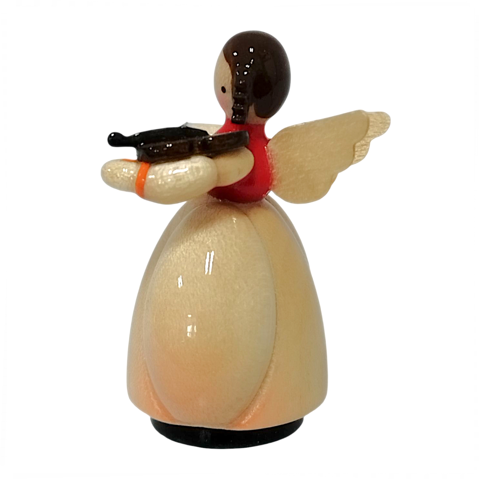 The little angel’s friendly face radiates a deep devotion to music. Two tiny eyes and a small red mouth lend her a childlike, naive, yet very refined charm. Her jet-black hair lies close to her body and ends in two neat braids at the sides. These loving details make each angel a truly unique piece of Erzgebirge craftsmanship. The design consistently follows the spirit of the Biedermeier period and emphasizes a peaceful, domestic idyll.