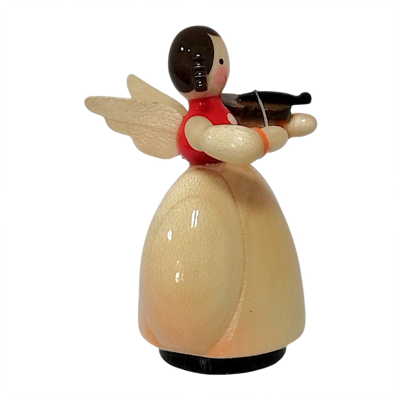 The little musician wears a top in a deep, classic shade of red. In her hands, she holds a delicately crafted violin made of dark wood. She elegantly rests the instrument against her chin and assumes a highly focused playing posture. In her other hand, she guides a wafer-thin bow across the suggested strings. Two dainty, natural wings made of light wood are attached to her back. These lend the figure a wonderful lightness and underscore her angelic character.