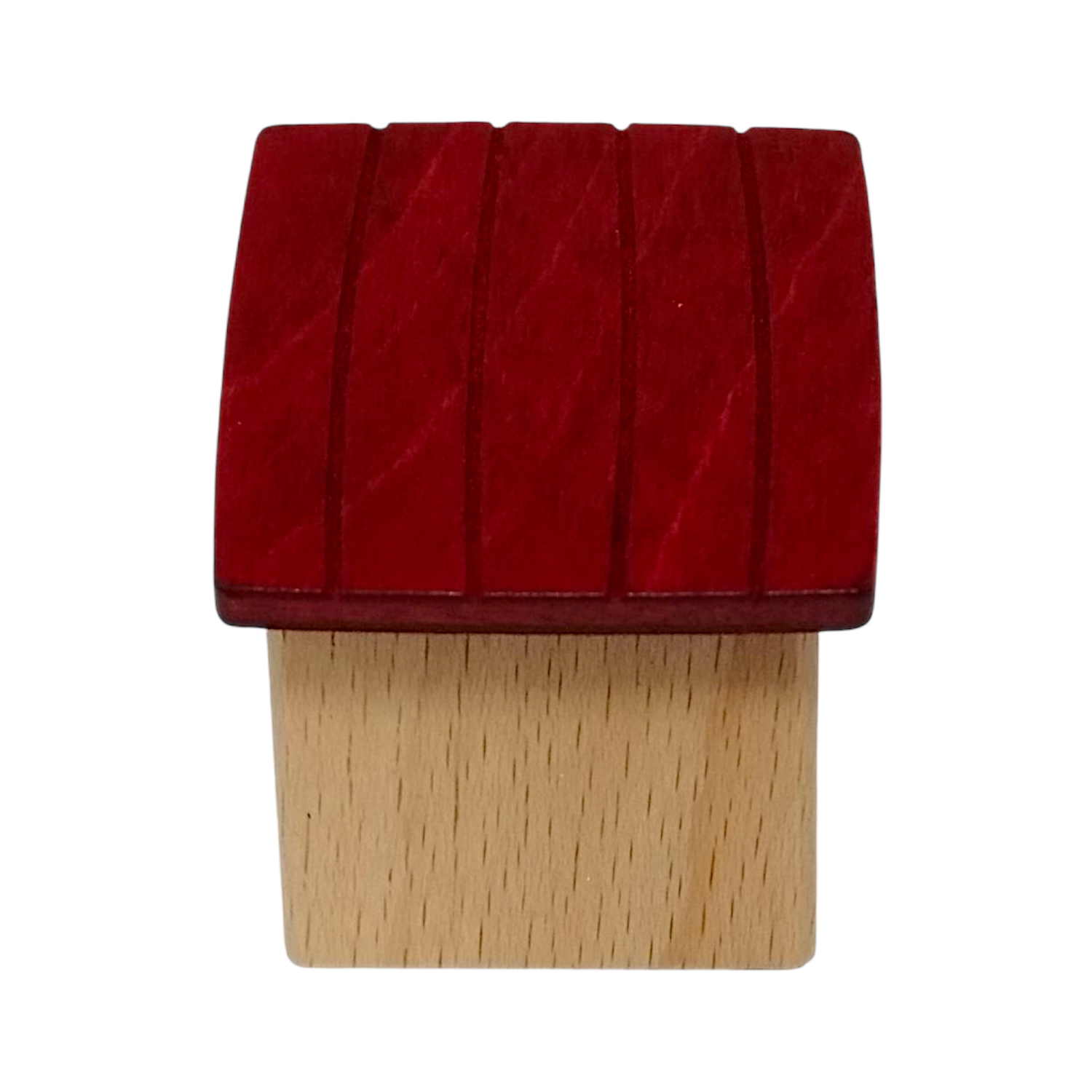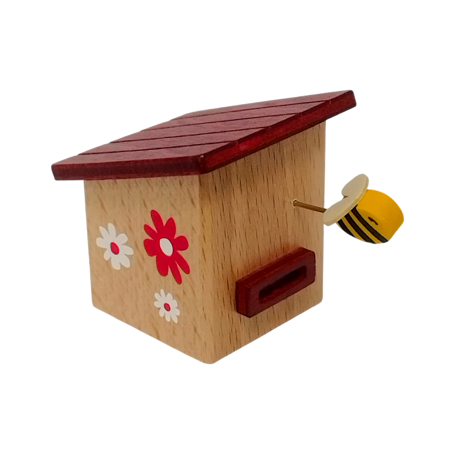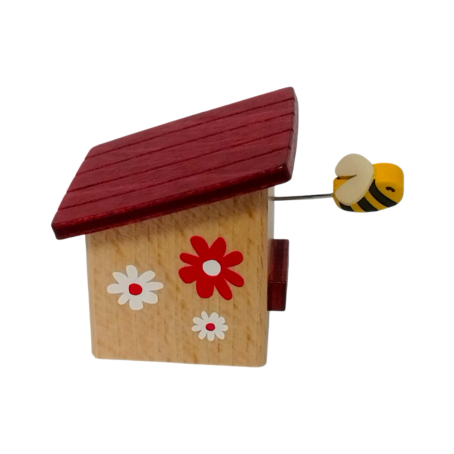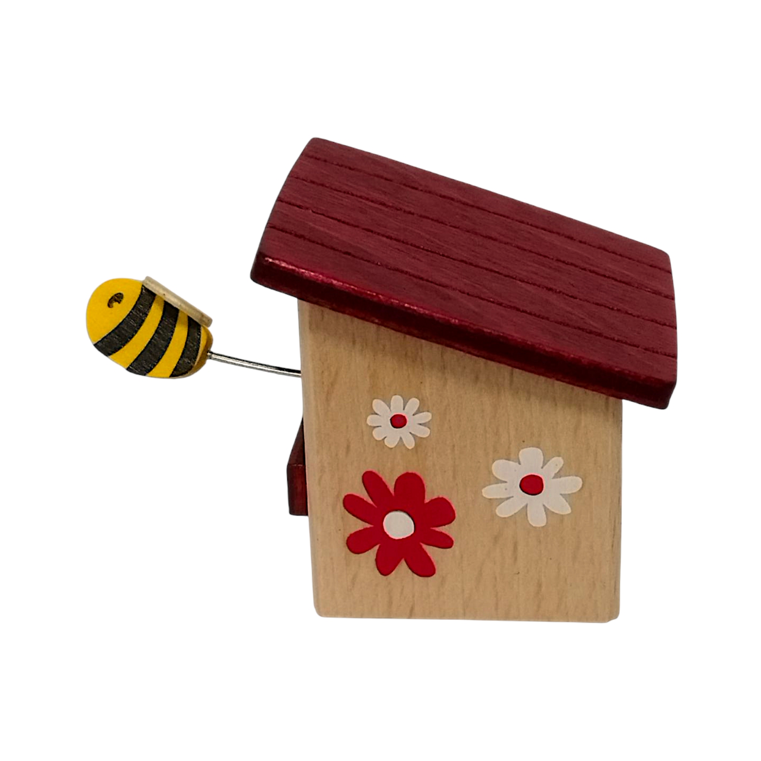 The small bee emerging from the house on a wire is particularly eye-catching. It features yellow and black stripes, a friendly design, and is a witty eye-catcher. The red-lacquered roof has a fine grain that brings the wood to life while simultaneously exuding stability. All corners are professionally finished, eliminating any sharp edges and ensuring every detail is comfortable to hold.