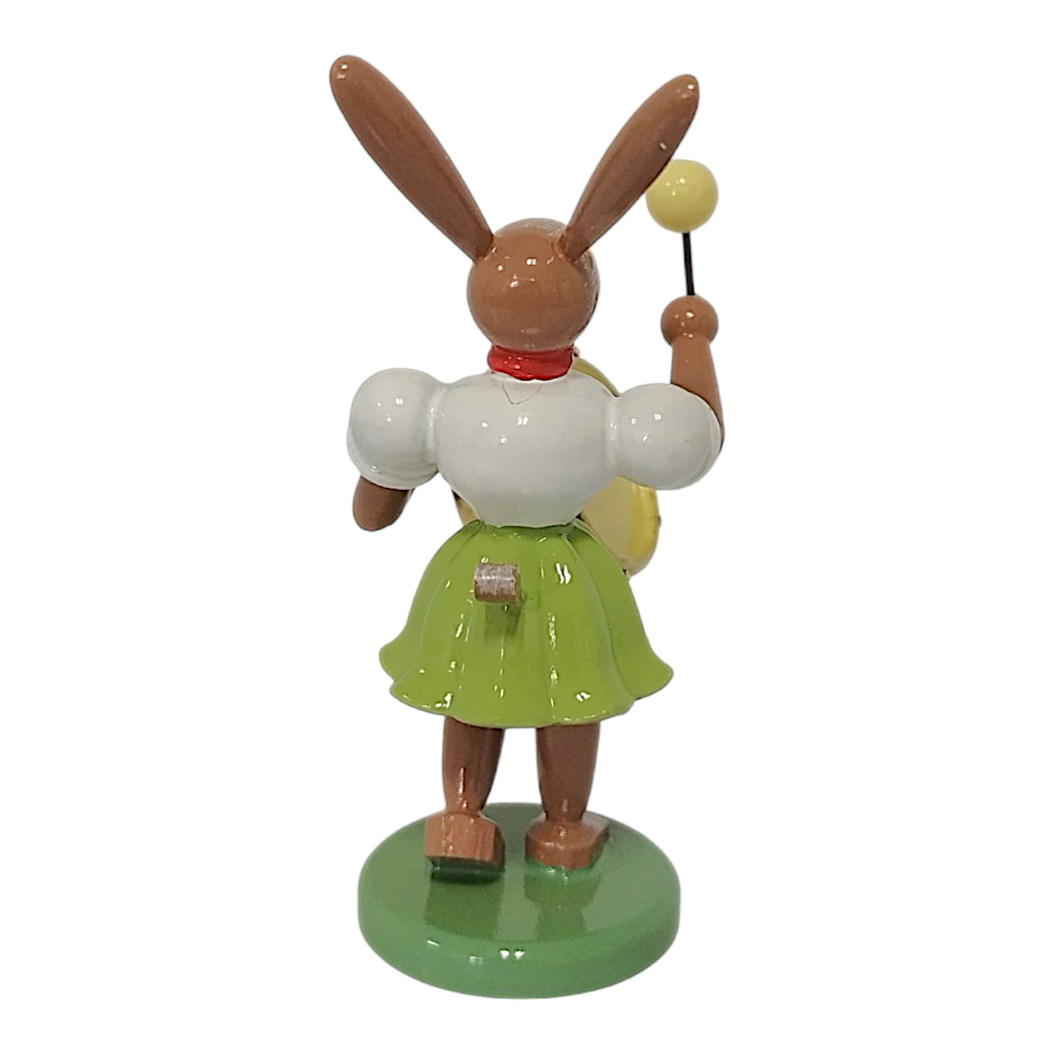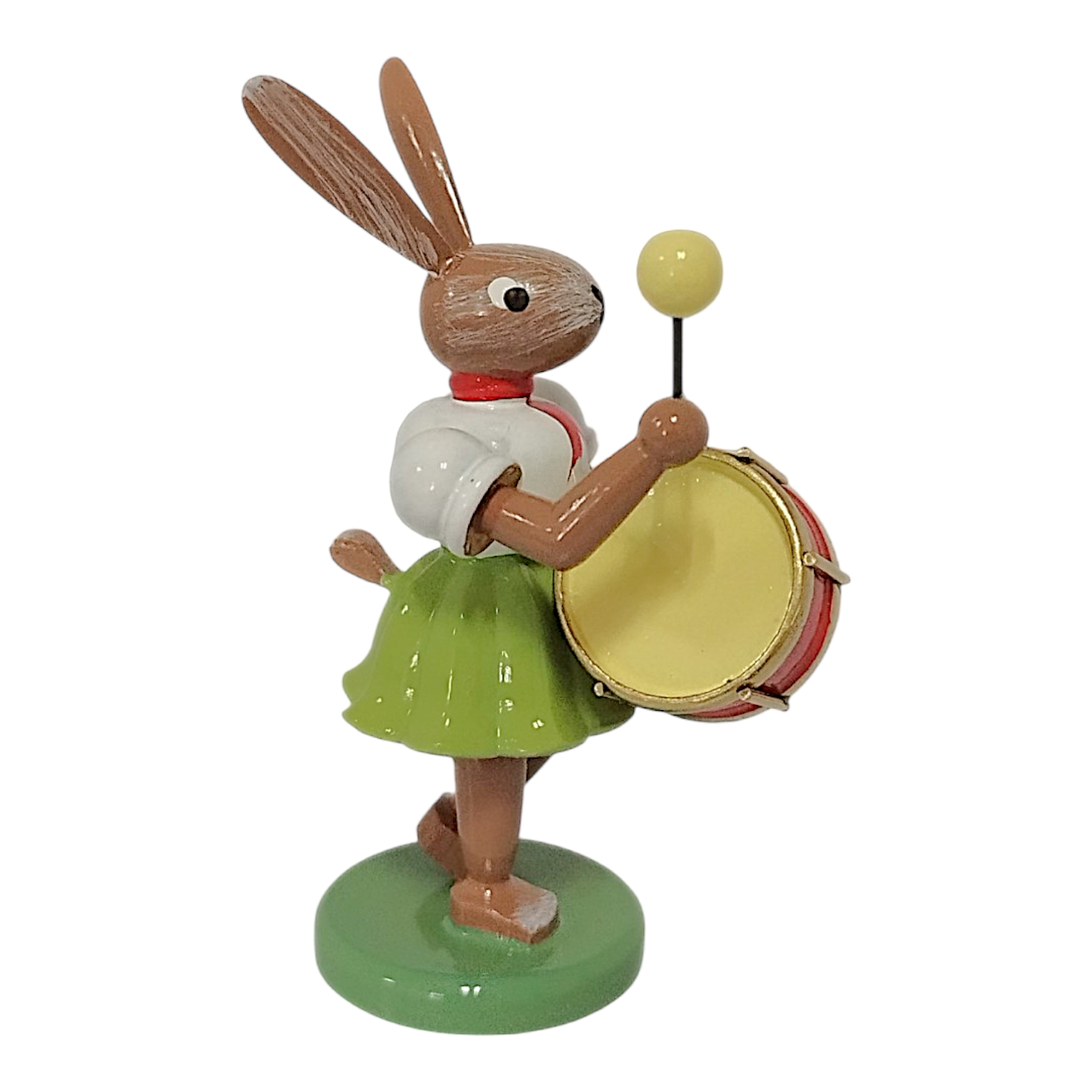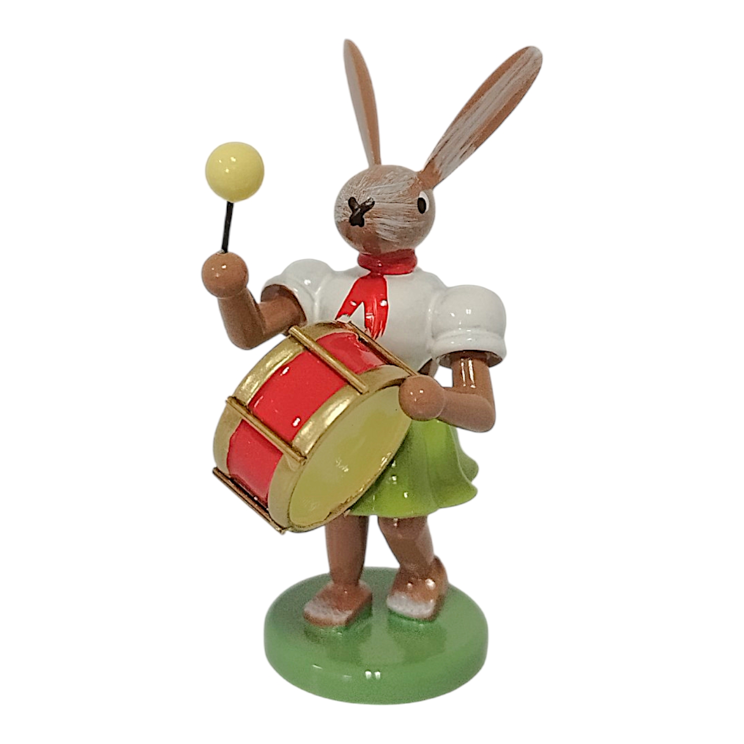 The characteristic pleated skirt, familiar to collectors worldwide from the famous angel series, is a particularly striking feature. In this version, the skirt shines in a fresh spring green, while the white top and red neckerchief create a classic contrast. This design element visually connects the Easter bunny to the renowned angel figurines and underscores the craftsmanship of the manufactory. The bunny proudly holds a striking timpani in front of his brown-glazed body. The instrument captivates with its vibrant red bowl and gold-colored hoops that shimmer elegantly in the light. In its right paw, the rabbit swings a mallet with a yellow head, lending the scene a delightful dynamism.