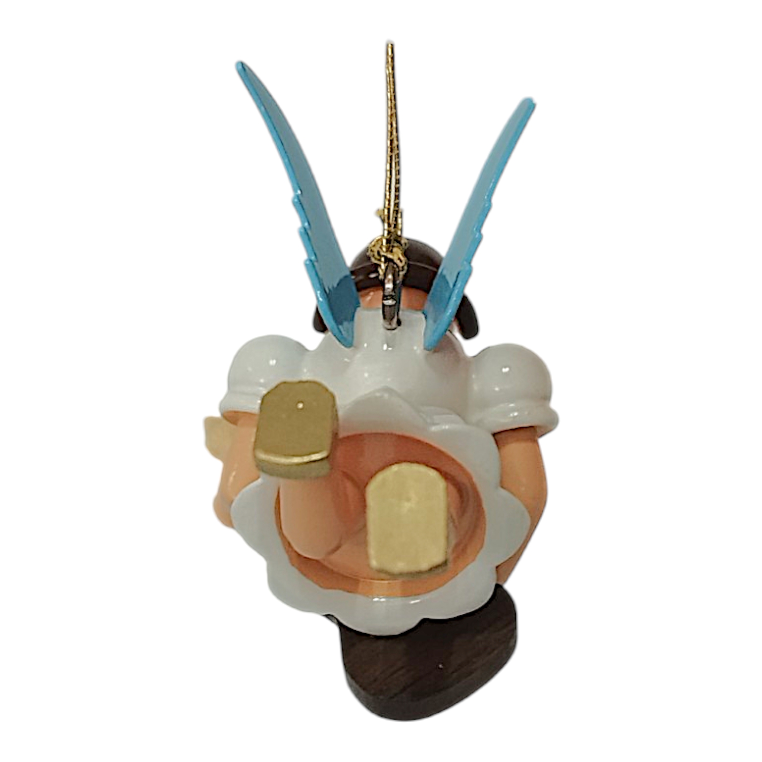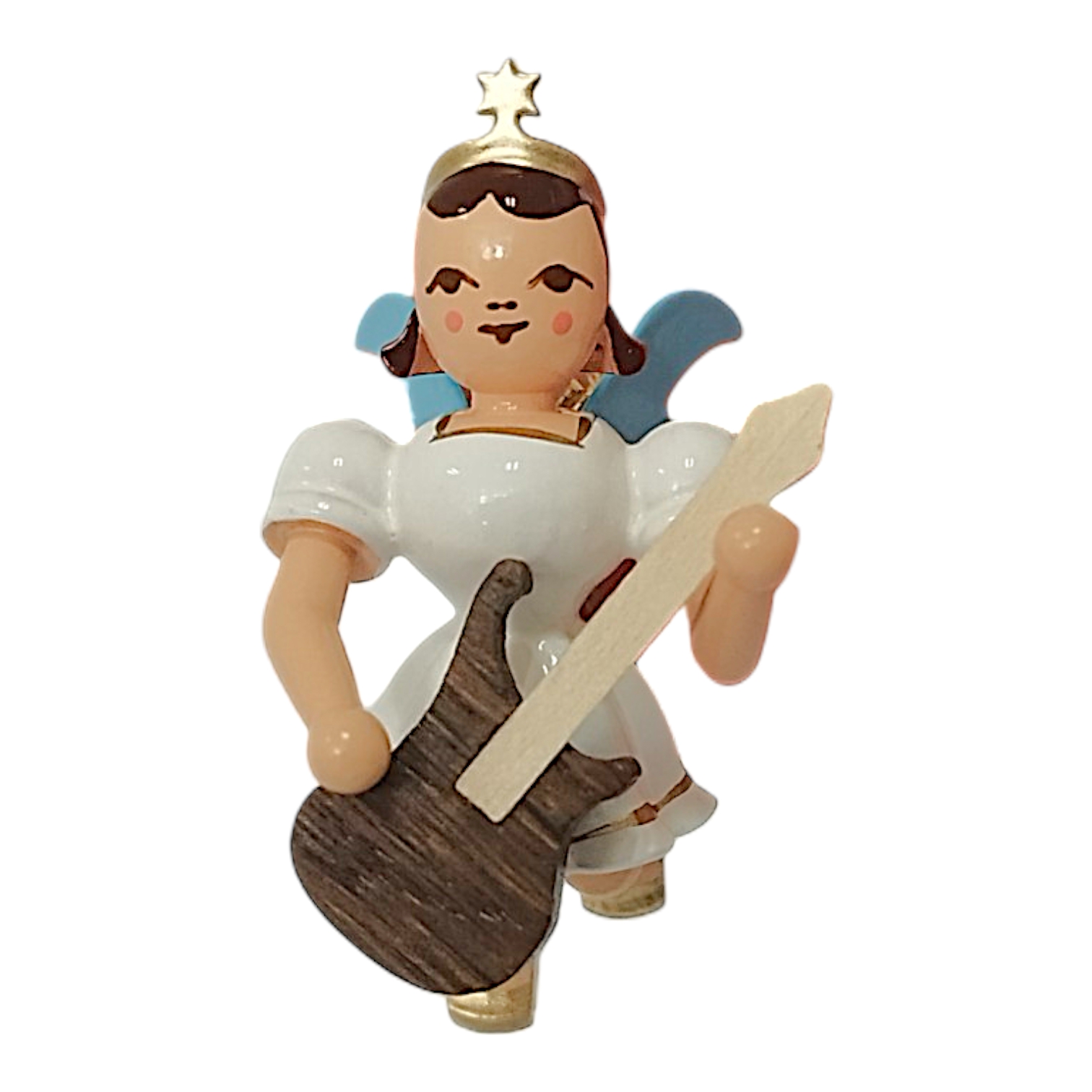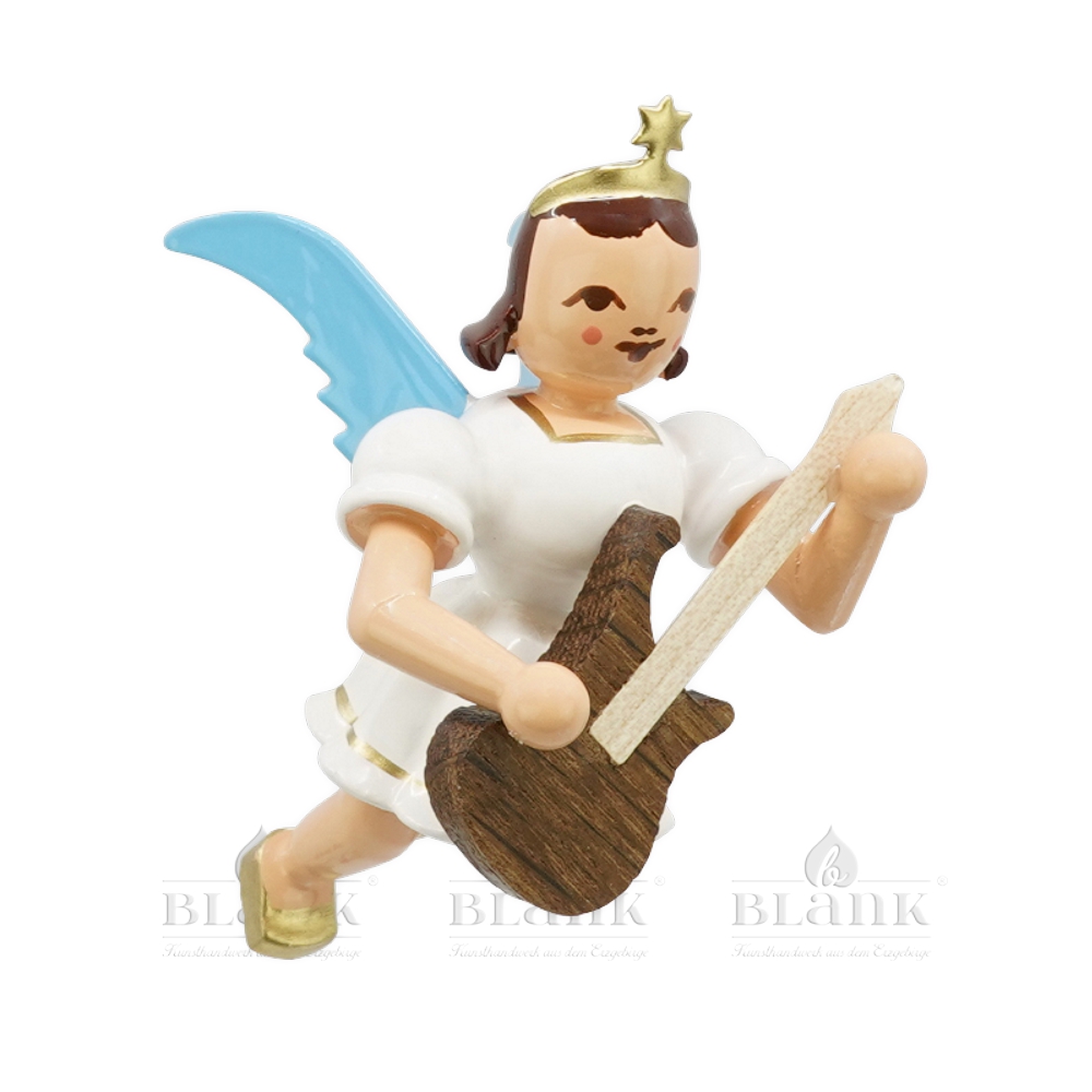 Freundlich blickt dieser kleine Schwebeengel von oben auf seine musizierenden Freunde hinab. Er ist sicher an einem goldenen Bändchen befestigt und begleitet das große Engelorchester aus luftigen Höhen mit seinen rockigen Klängen. In den Händen hält er stolz seine detailgetreu gestaltete E-Gitarre, die in kräftigen Farben einen tollen Kontrast zum weißen Faltenrock bildet.