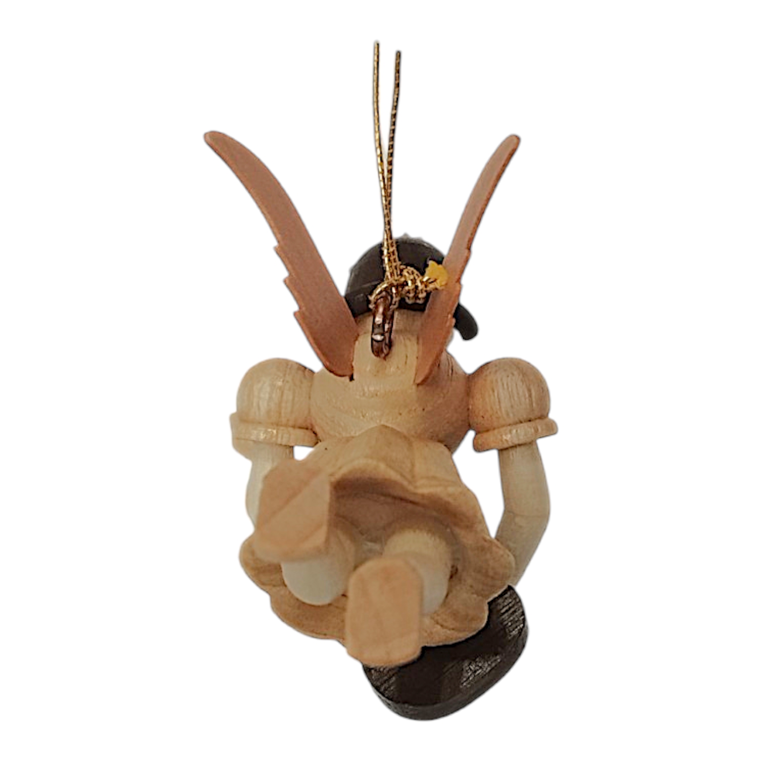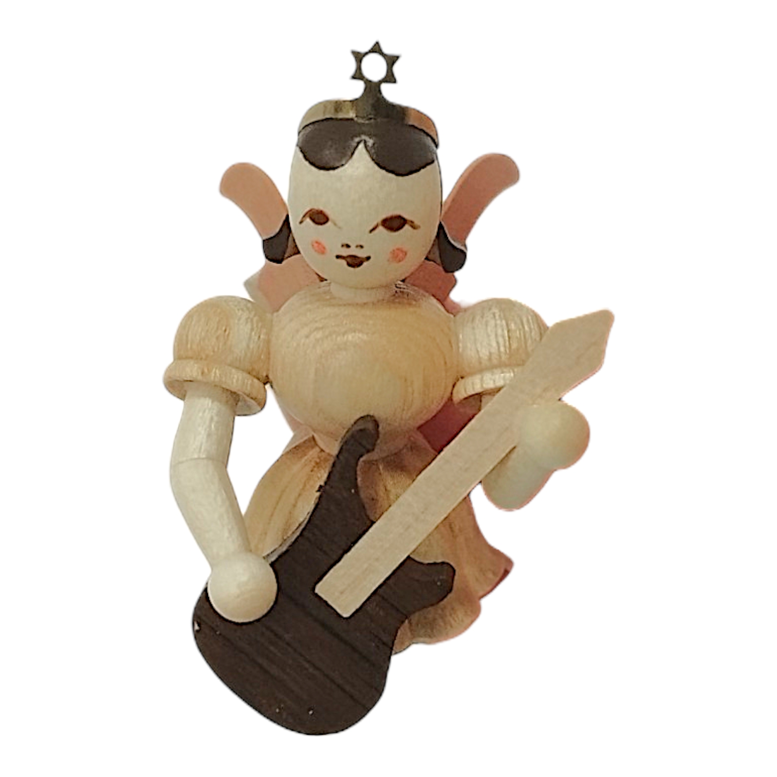Aren’t these little angels with their golden crowns simply lovely?! This little floating angel gazes down kindly at its musical friends. Securely attached to a golden ribbon, it accompanies the large angel orchestra from lofty heights with rockin’ tunes. The natural-colored figure, with its characteristic short pleated skirt, firmly holds its intricately crafted electric guitar.