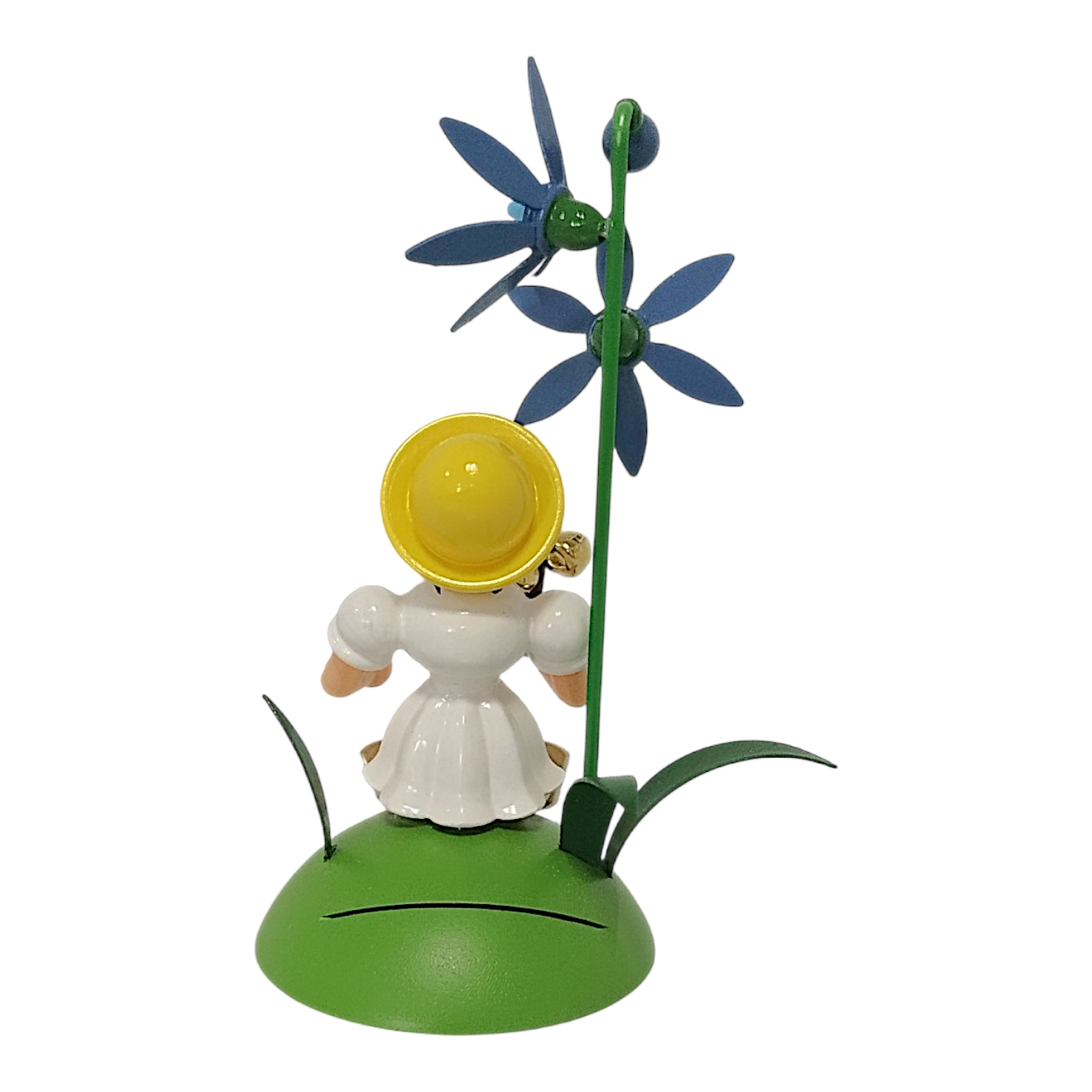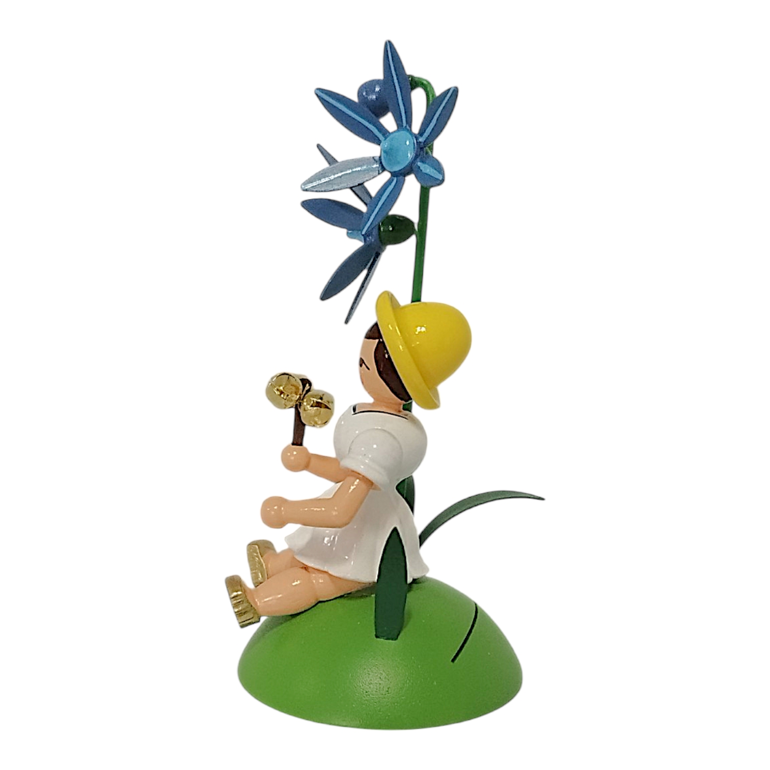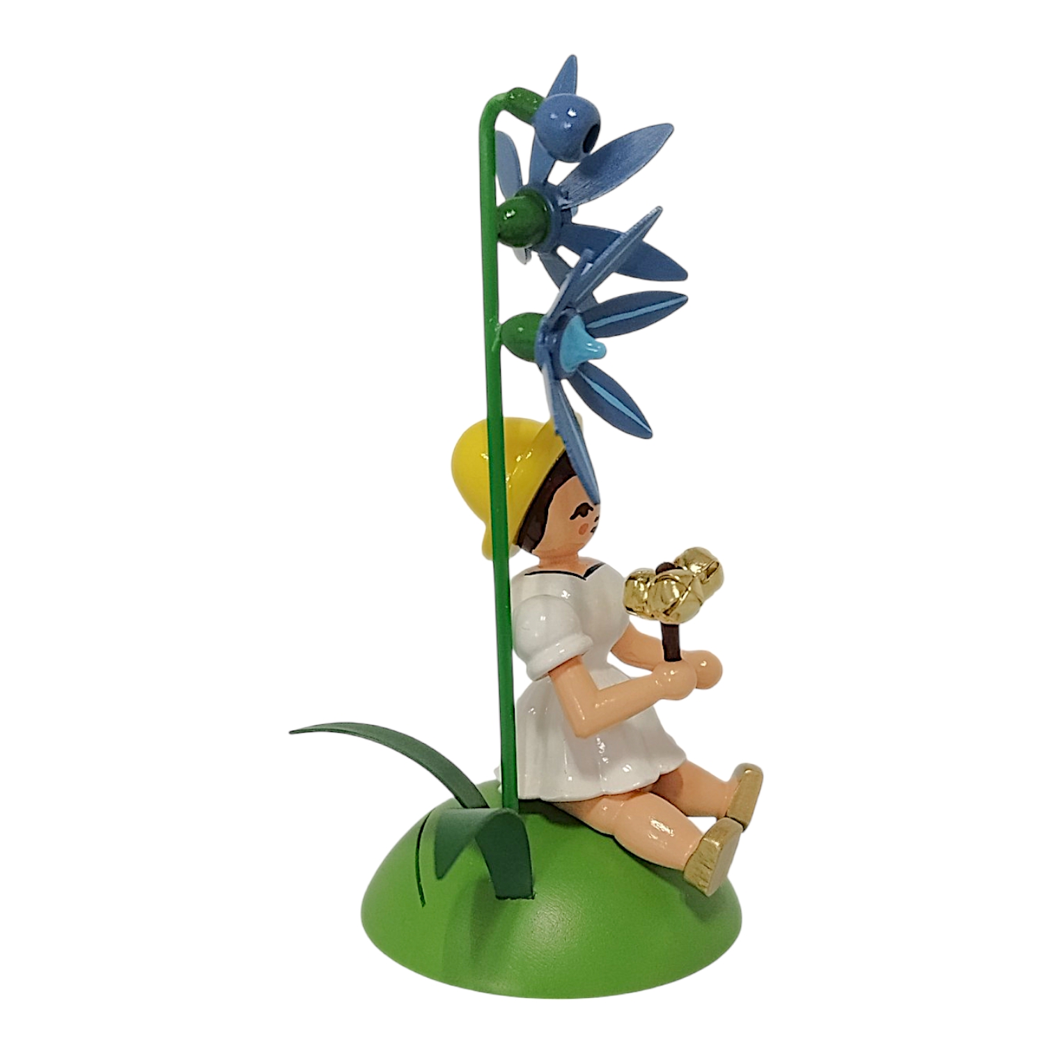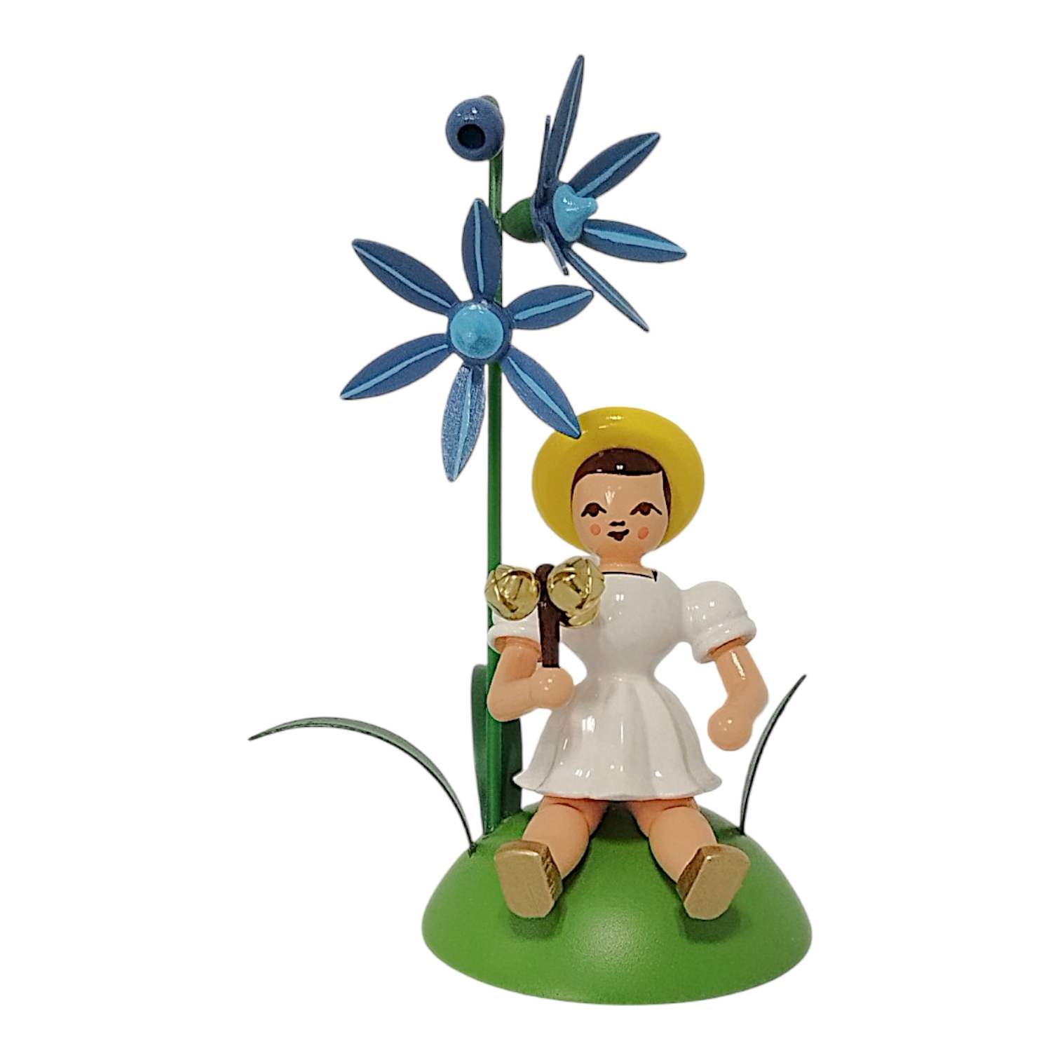 The characteristic pleated skirt, familiar to collectors worldwide from the famous angel series, is a particularly striking feature. In this version, the seated girl wears a dress in radiant white, creating a light, summery contrast to the green background. This design element visually connects the flower child to the classic angel figures and highlights the craftsmanship of the manufactory. The delicate figure proudly holds a small jingling staff with three gleaming golden bells as she rests beside a finely crafted bluebell. The blossom glows in a vibrant blue, instantly revealing the botanical inspiration behind its precisely shaped petals. The long, rich green stem and the delicate leaves at the base perfectly complete this nature-inspired scene.