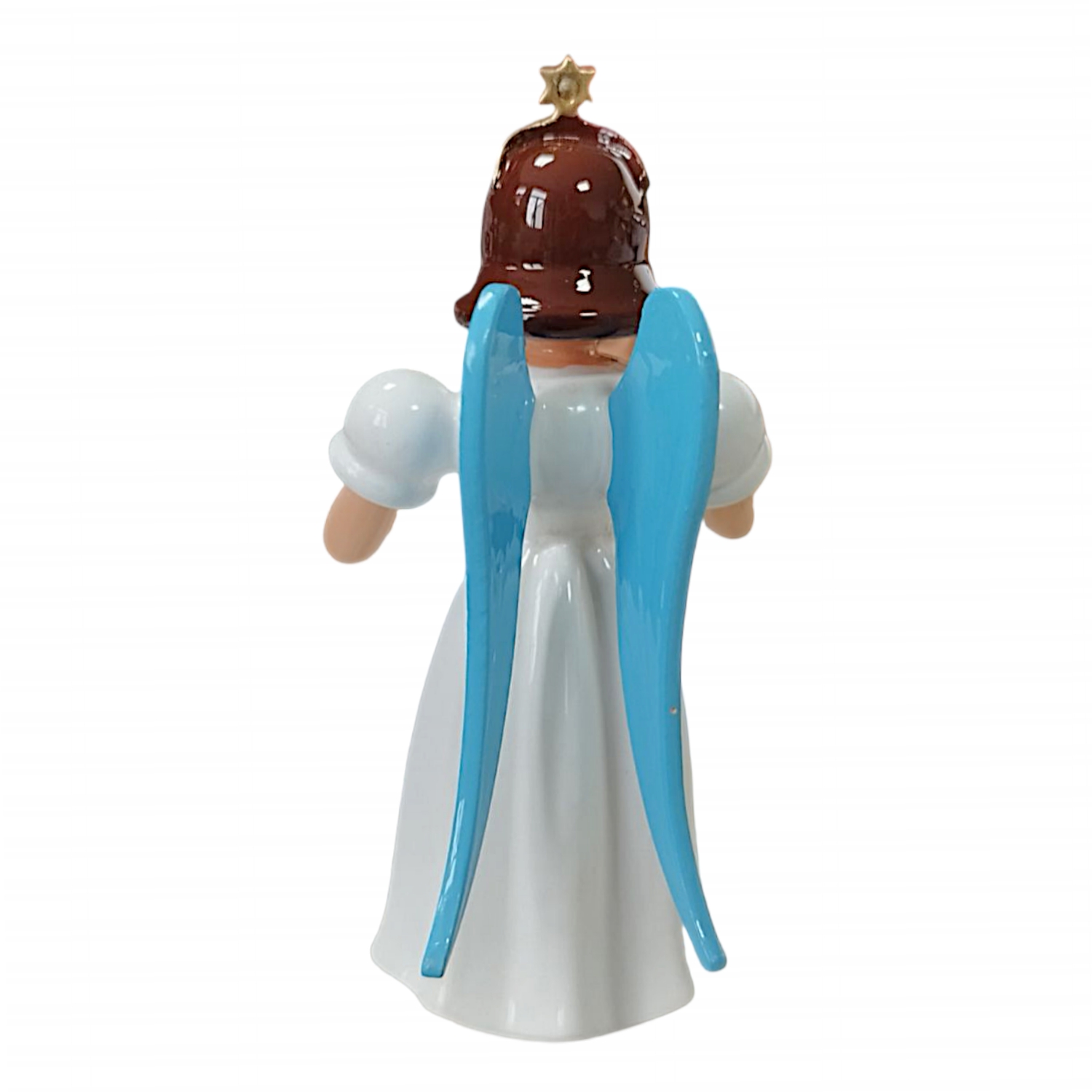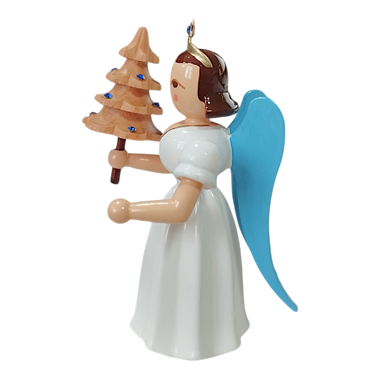 The angel wears a classic, white pleated long skirt, which is refined with hand-painted gold accents. In his hands he holds a detailed tree that is decorated with high-quality Preciosa crystals. These crystals sparkle in the light and create a festive atmosphere. The angel’s wings shine in a soft blue and give the figure a heavenly aura. A small golden star on the angel’s head complements the overall picture and adds an additional highlight.
