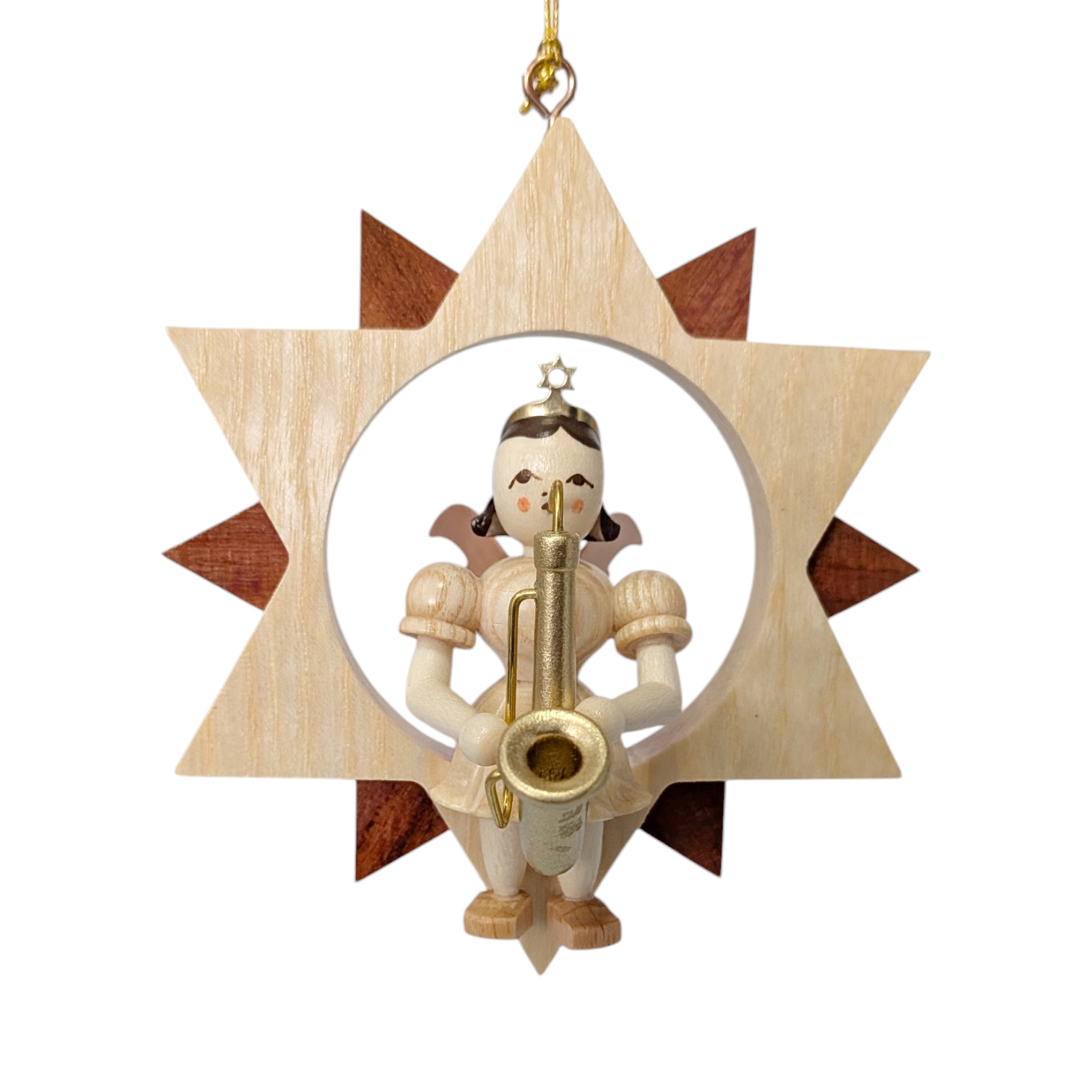 This unique short-skirted angel in a star with a saxophone combines natural beauty with traditional craftsmanship.