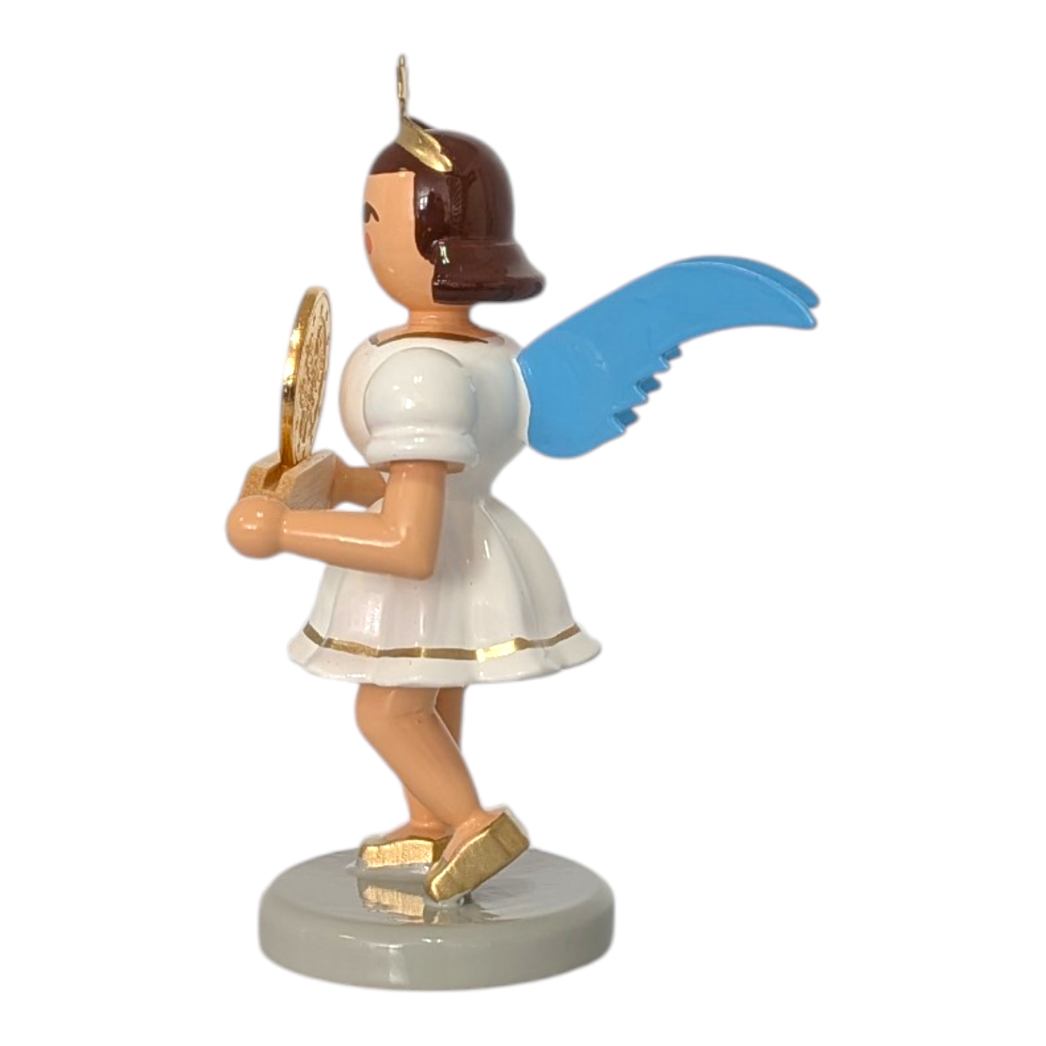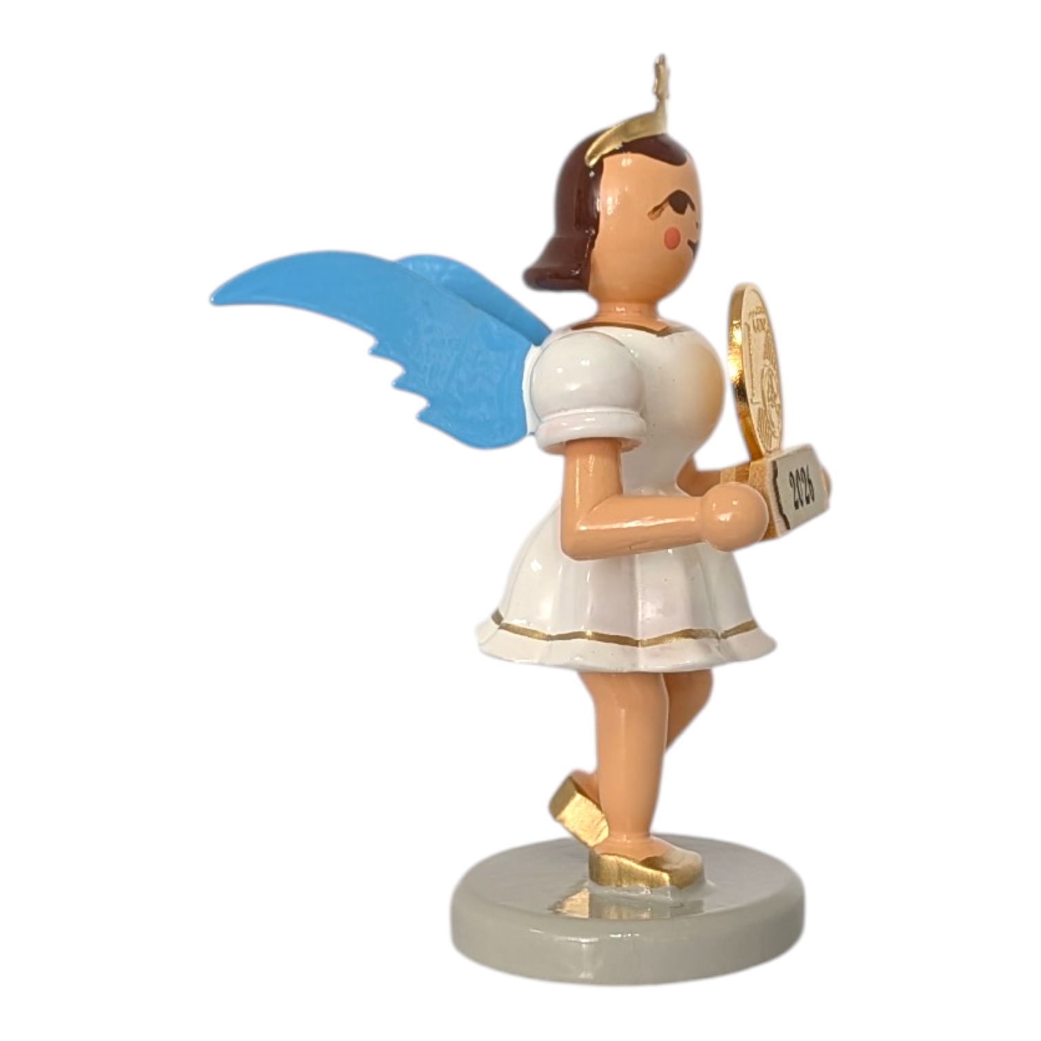 The characteristic pleated skirt, the hallmark of the world-famous angel series, is particularly striking. In this version, the dress shines in pure white, embellished with fine gold trim on the skirt and sleeves. This design feature underscores the masterful craftsmanship of the manufactory and gives the figure its distinctive silhouette. Gold-shimmering shoes perfectly complete the festive look.