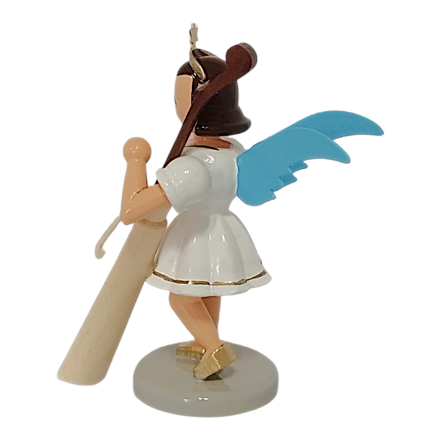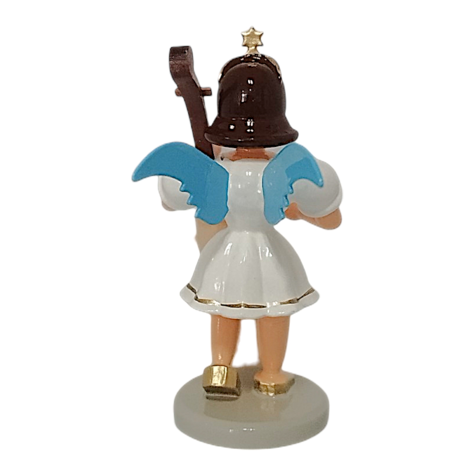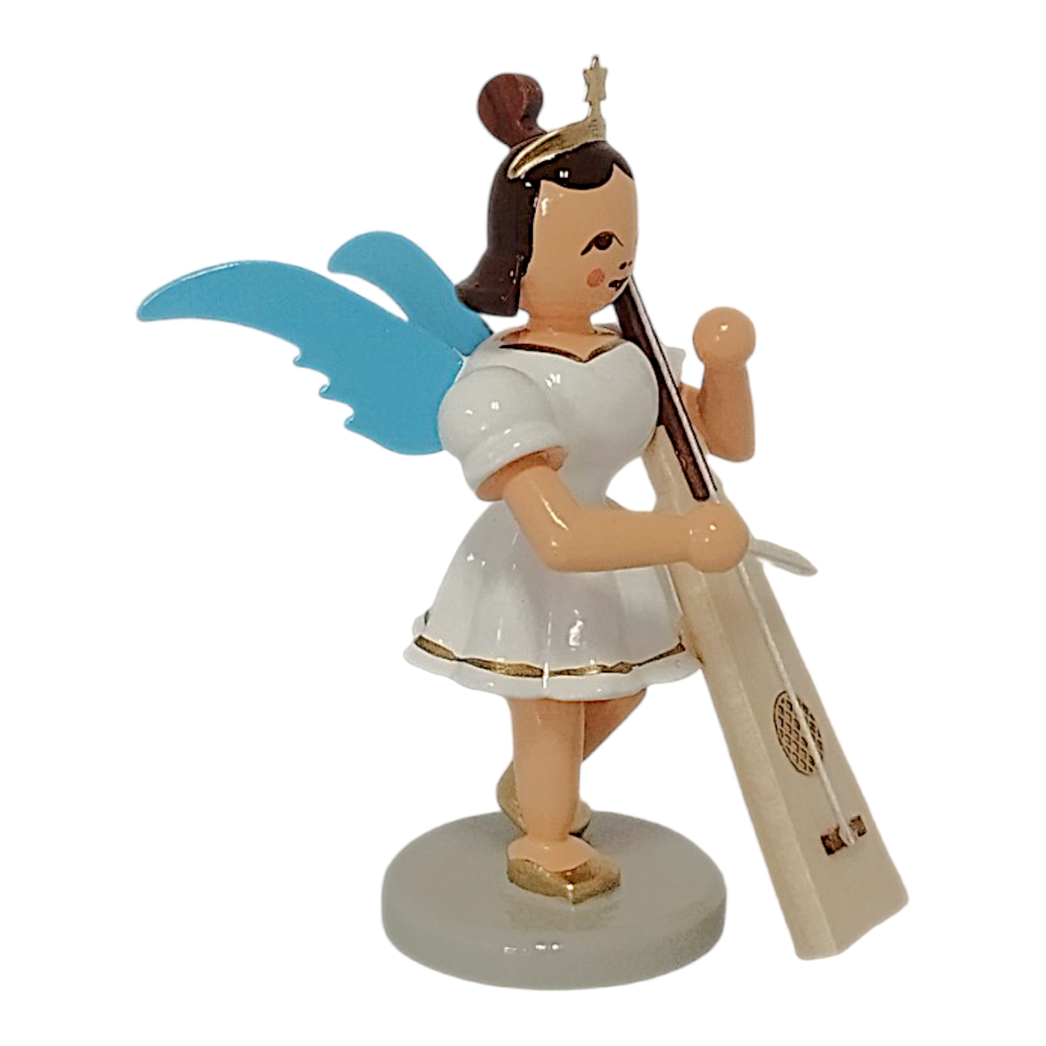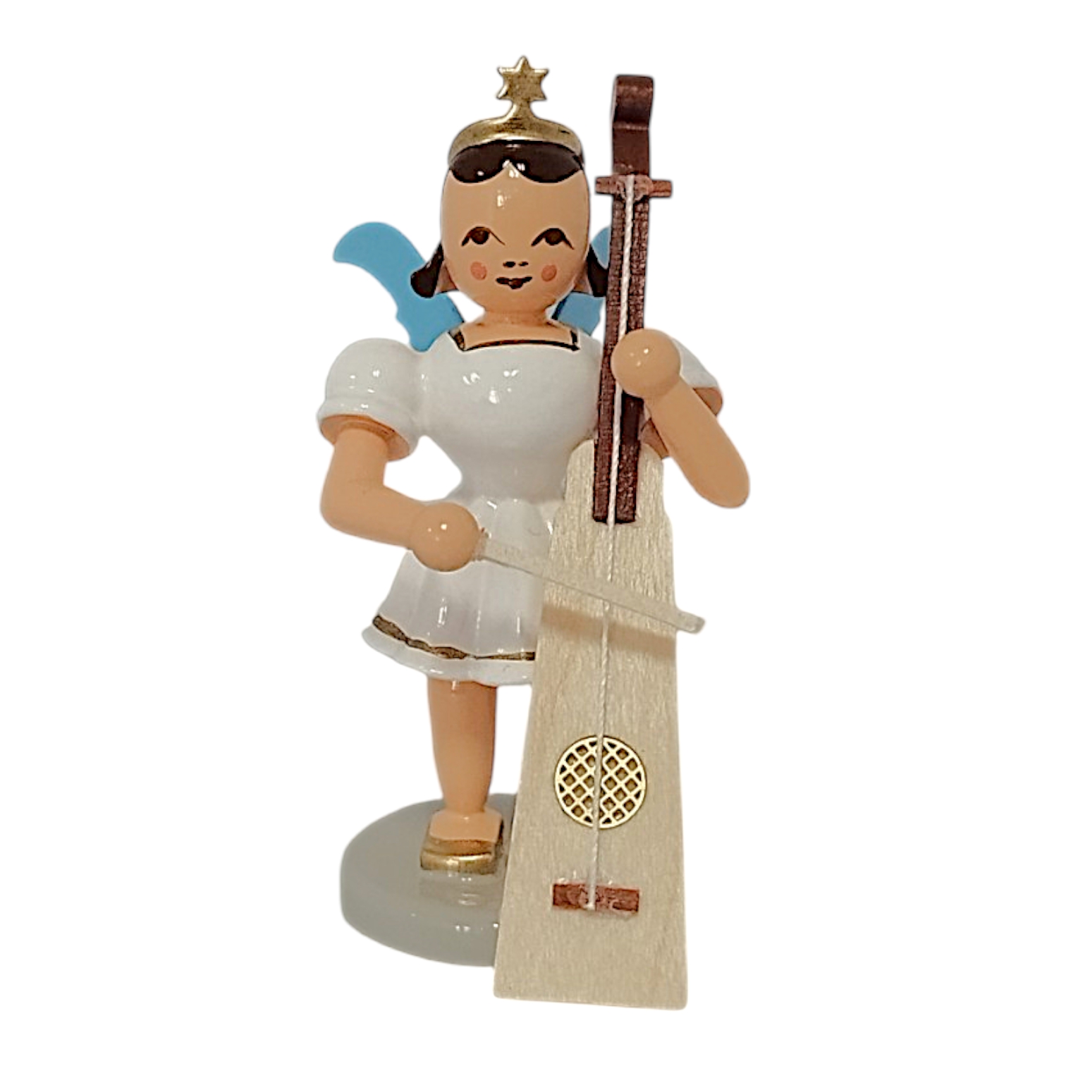 The pleated skirt, a hallmark of the world-famous angel series, is particularly striking. In this version, the dress shines in pure white and is embellished with delicate gold trim on the skirt and sleeves. This design element underscores the masterful craftsmanship of the manufactory and lends the angel its distinctive silhouette. The angel proudly holds a filigree-crafted trumscheit in front of its body. This stringed instrument captivates with its light-colored body and dark neck, while a delicate gold lattice ornament adds an extra touch of elegance. The angel holds the bow in its right hand, lending the piece a wonderful, musical dynamism. The delicate, blue-glazed wings provide a gentle color contrast.