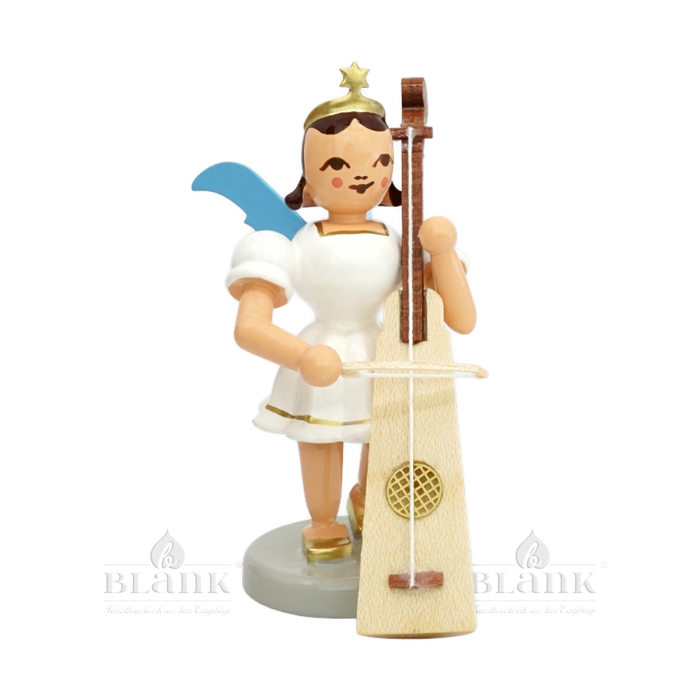 This musical short-skirted angel with a trumscheit, from Blank Kunsthandwerk, adds an extraordinary and historical instrument to your celestial orchestra. The skilled artisans from Grünhainichen in the Ore Mountains craft this figure with the utmost precision and meticulous attention to detail. In this colorful version, they employ an elegant paintwork technique that perfectly highlights the festive radiance of the little musician. A friendly face with rosy cheeks and a gentle smile gazes out from beneath the golden diadem adorned with the characteristic star.
