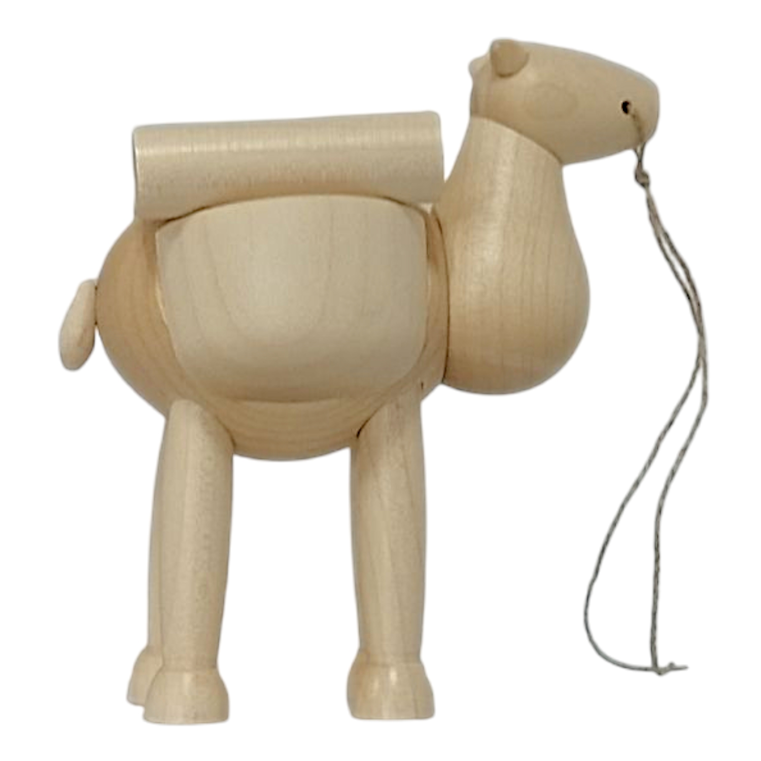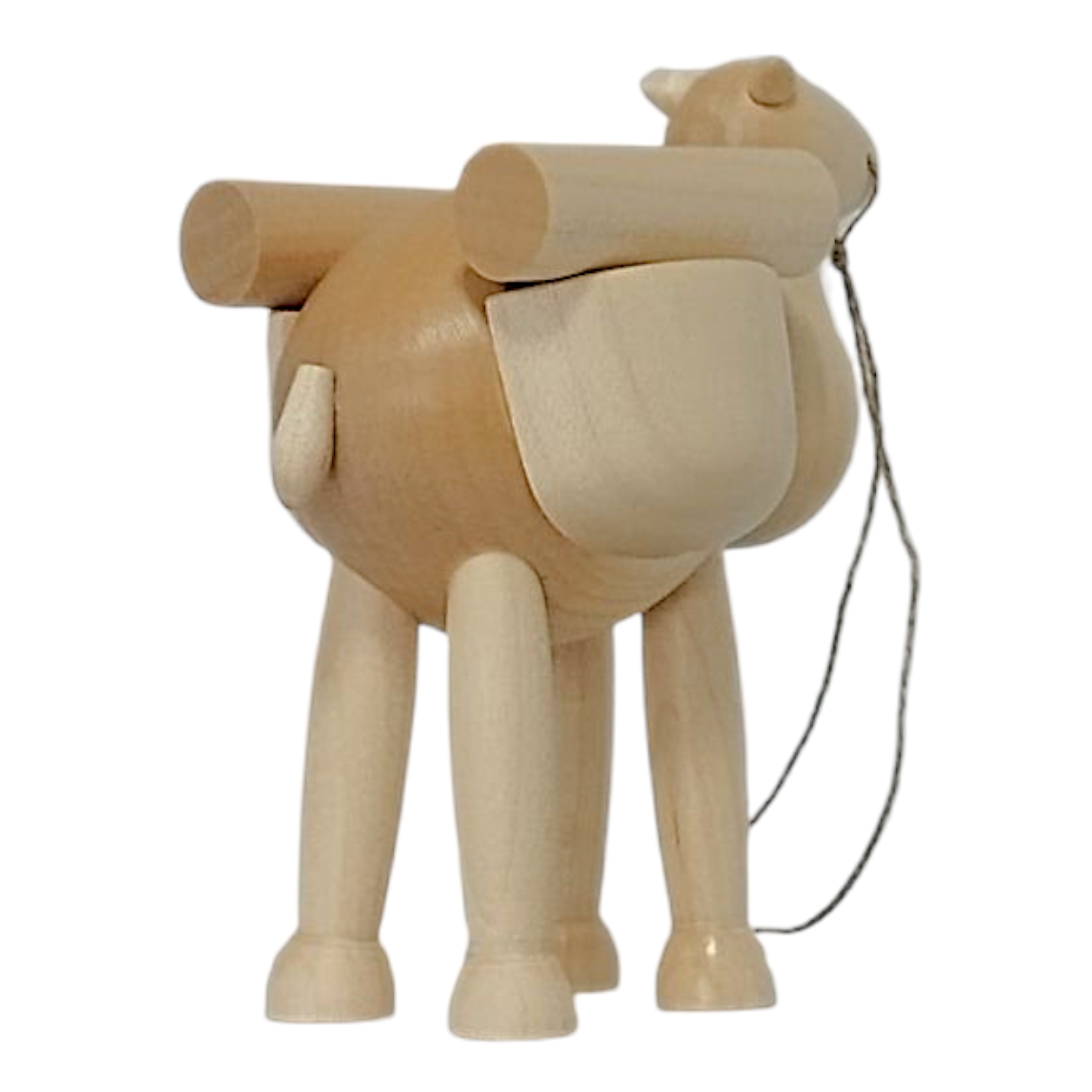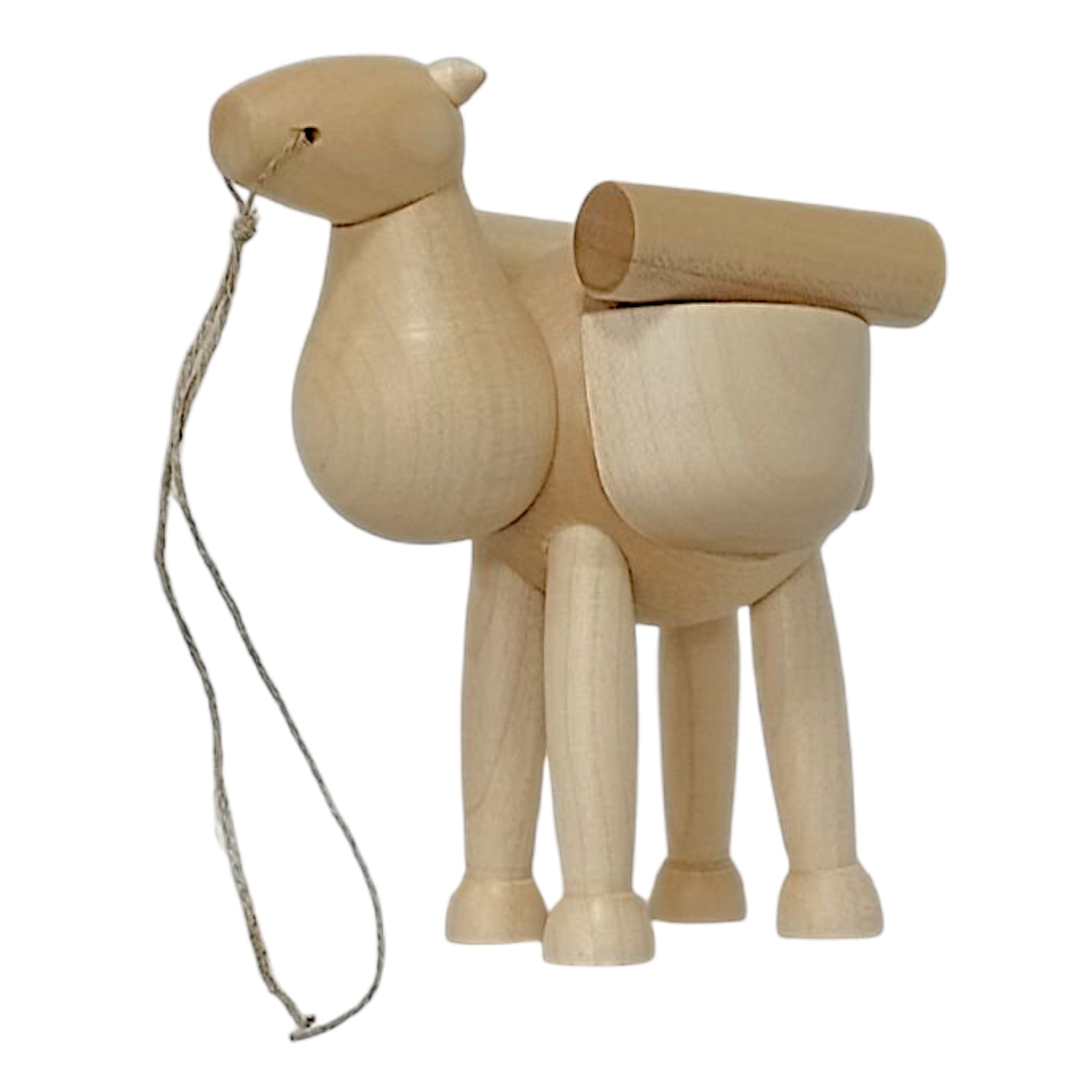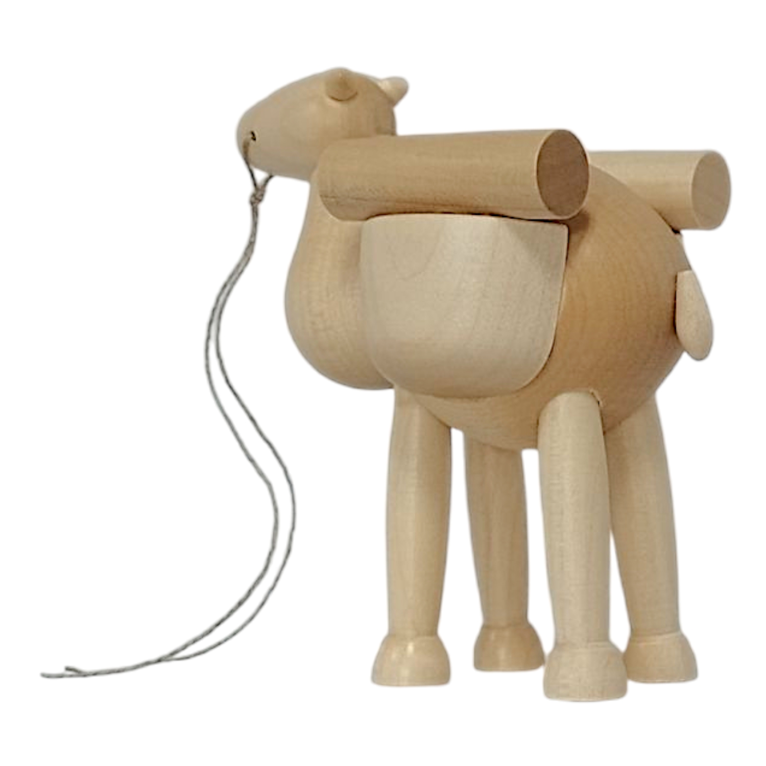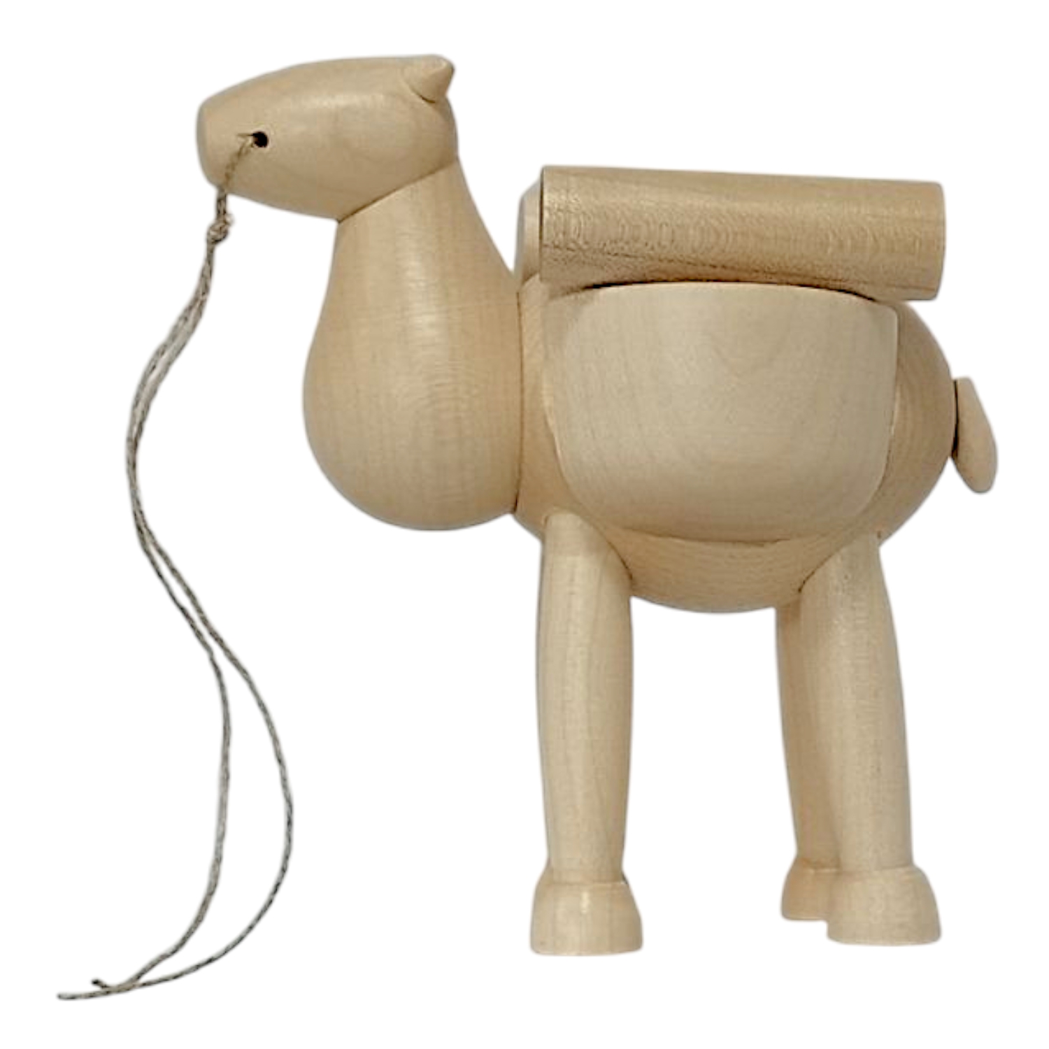 The natural-colored camel symbolizes the journey through the desert and carries carefully crafted luggage that blends harmoniously into the overall picture. The design is deliberately minimalist to give the wood and its lines a special expressiveness. Despite its simplicity, the figurine exudes vibrancy and character. Small accents, such as the lifelike tail and the characteristic head shape, give the camel a charming expression.