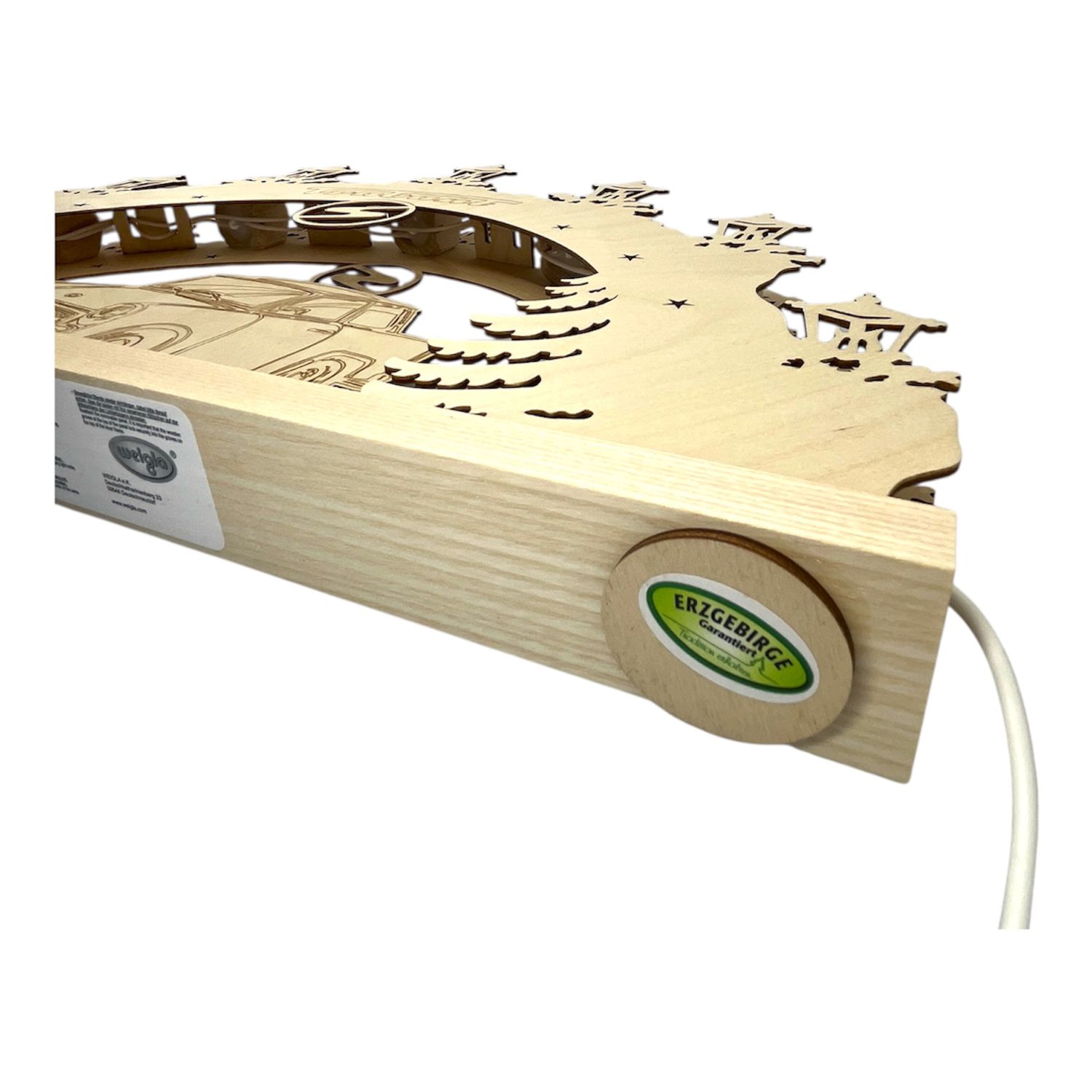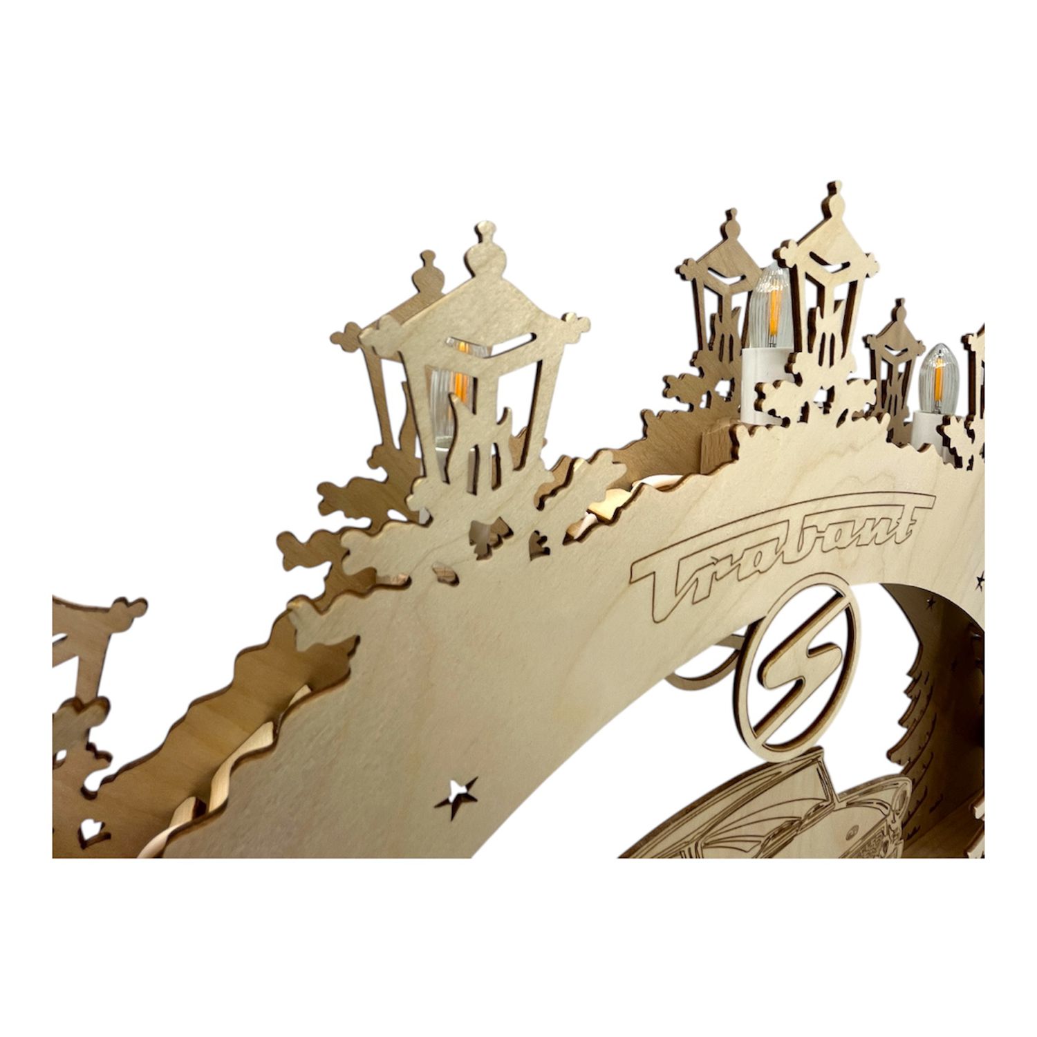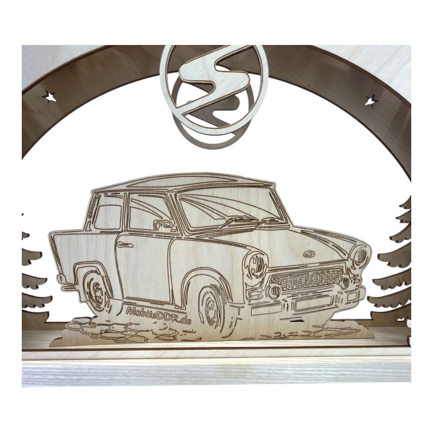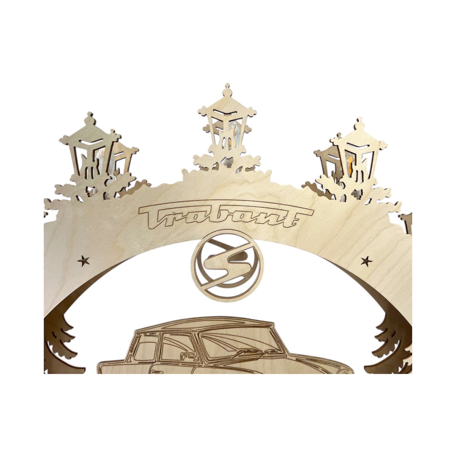 Measuring 52 cm wide and 32 cm high, this candle arch is a true eye-catcher in any room. The elaborate laser-cutting technique depicts a detailed Trabant 601, framed by snow-covered fir trees, historic street lamps, and the classic candle arch – typical of the Erzgebirge region.