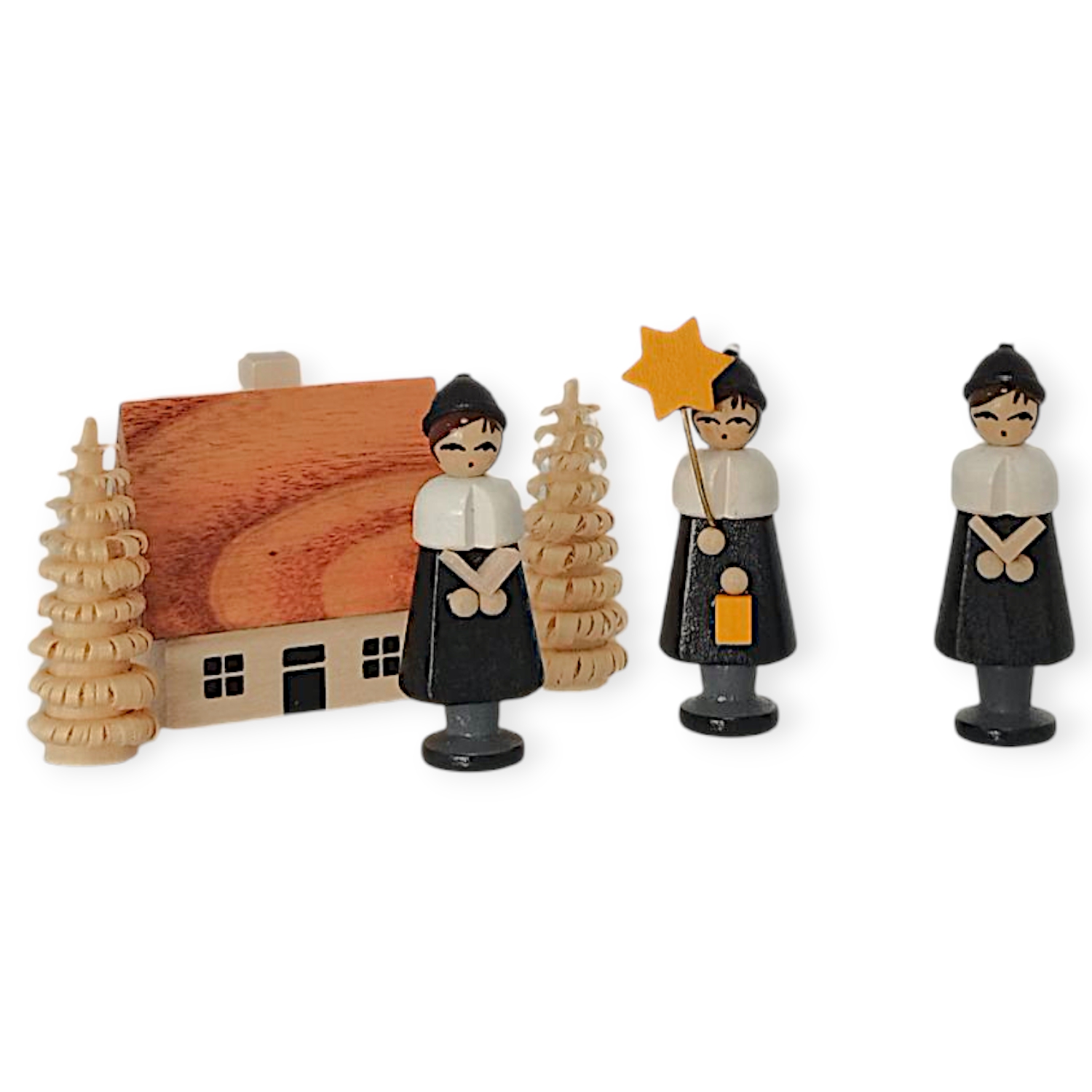 The Carolers in a woodchip tin from Knuth Neuber brings traditional Erzgebirge magic directly into the living room. The lovingly crafted woodchip tin contains detailed miniature figures depicting a classic Carolers group. Three singers wear black coats and pointed hats, one of whom holds a yellow star – a symbol of traditional carol singing in the Erzgebirge region. In addition to the singers, two delicately crafted trees and a small, rustic half-timbered house complete the set.