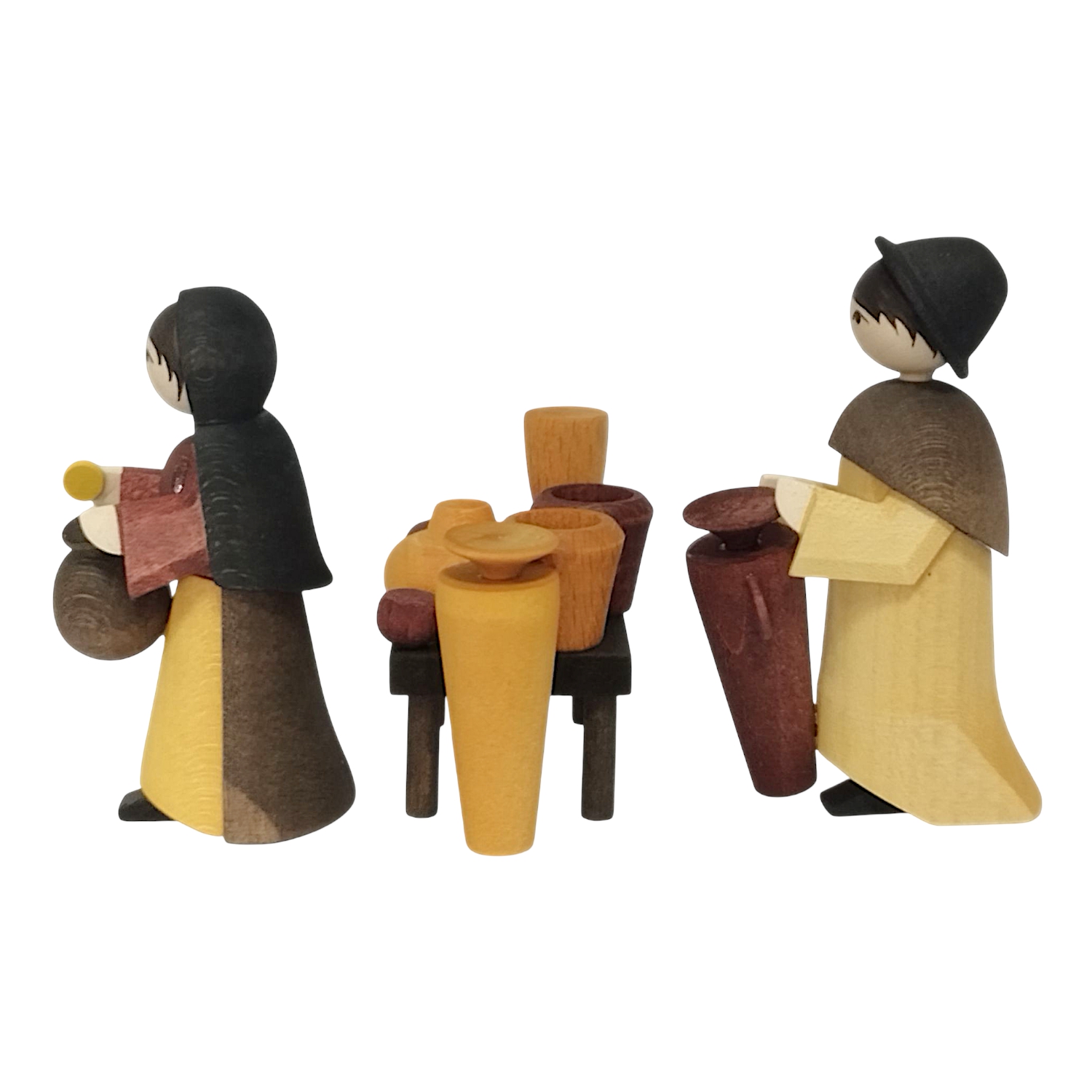 The figurines each stand approximately 7 cm tall. Their surfaces are carefully sealed with oil, which not only provides a pleasant feel in the hand but also highlights the natural wood tone. The scene tells of encounters, negotiations, and exchanges at the market stall—it arouses curiosity and invites the viewer to linger. Furthermore, the group of figurines can be wonderfully combined with other Ulmik nativity figures and used as a creative element in Christmas decorations.