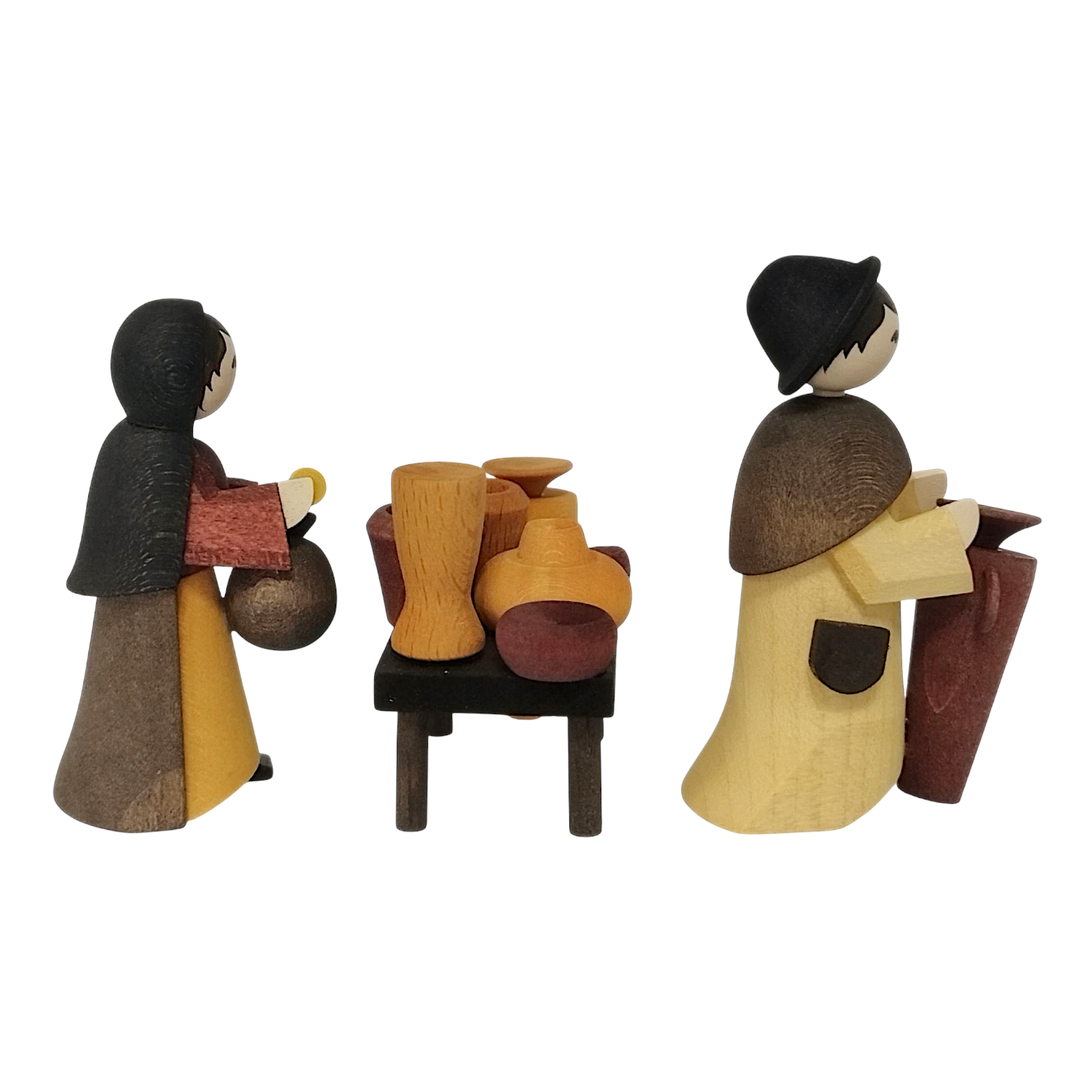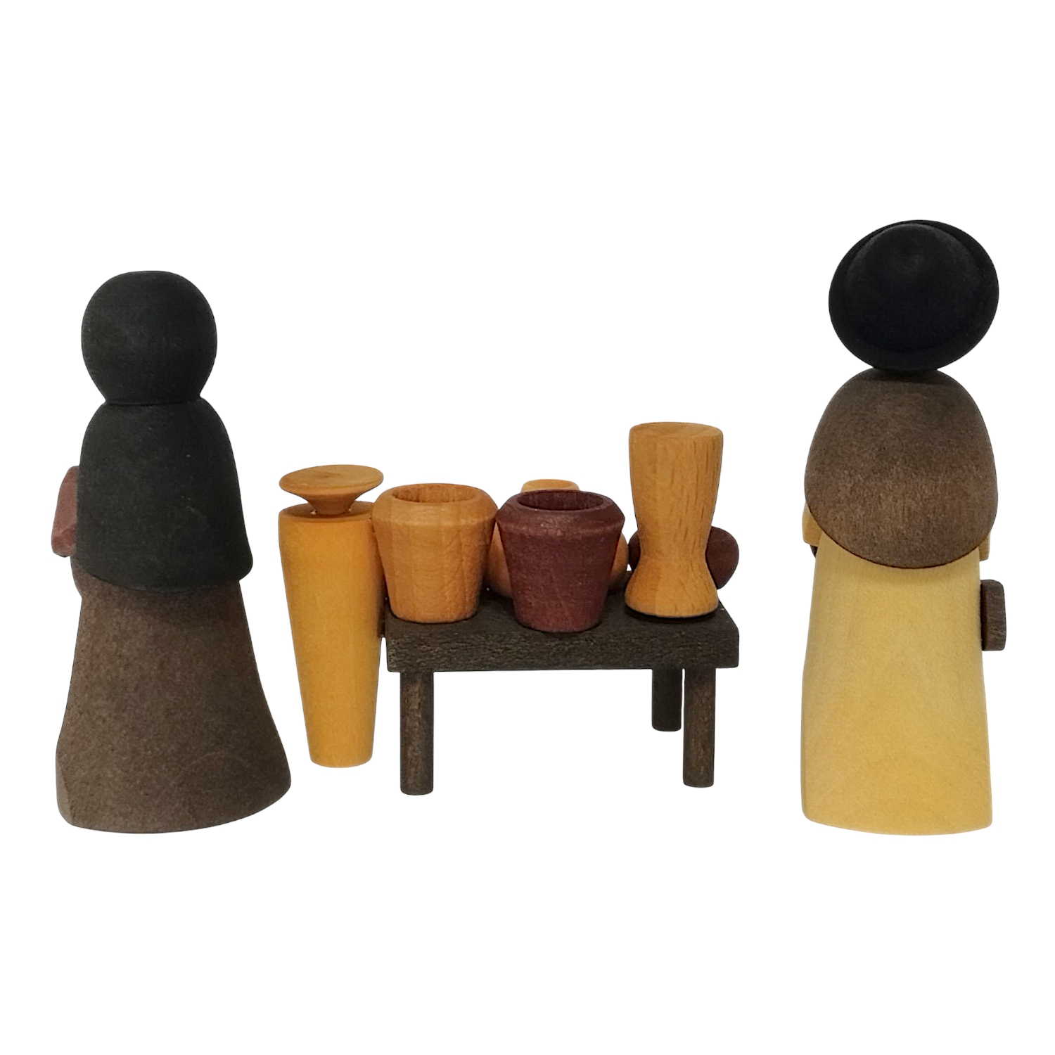 The man holds a large amphora in his arms, while the woman smiles and presents a round jug. The central market table is lavishly decorated with ceramic vessels in various shapes and colors. Bottles, jugs, bowls, and pots can be seen arranged to match the scene. The coordinated color spectrum of ochre, brown, and red brings warmth and authenticity to the overall picture. All vessels are also made of wood and precisely stained, bringing out the individual grain.