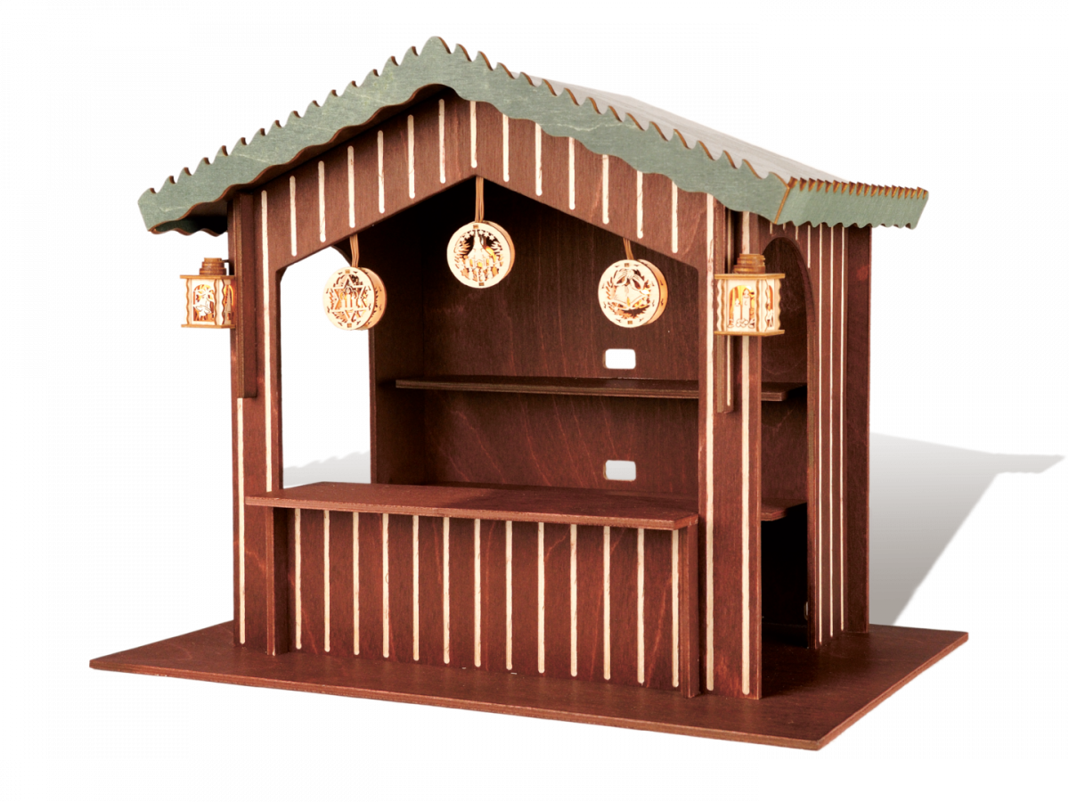 Christmas stall and accessories including electrical connection with transformer, 2 lanterns and 3 window pictures