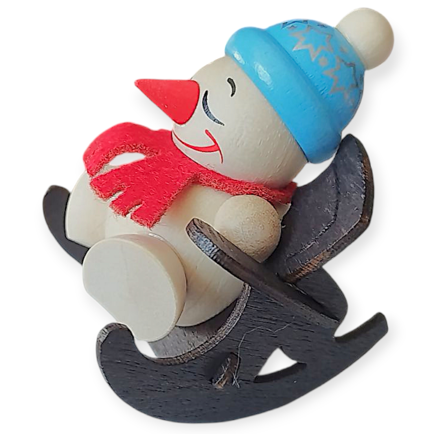 The manufacturer uses selected wood and crafts each figure by hand. The compact size of approximately five centimeters allows for flexible decoration on a table, dresser, or windowsill. His light wood contrasts pleasantly with the darker furniture and the bright blue hat and red scarf, which give him a playful touch.
