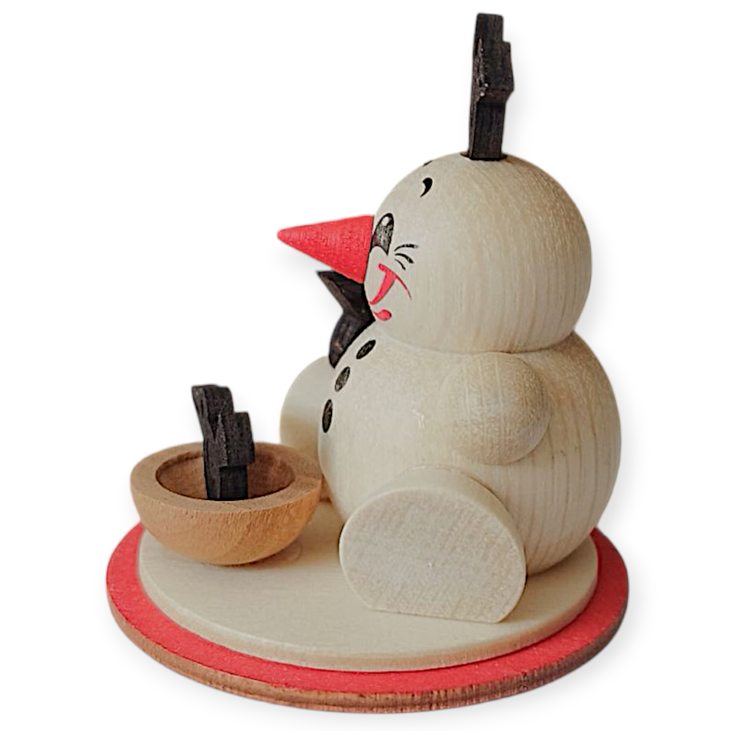 The Cool Man Bird Friend from Karsten Braune combines Erzgebirge craftsmanship with contemporary design. The spherical figure, made from select woody plants, sits cheerfully and cheerfully on a decorative wooden plate. With his red nose and broad smile, he immediately spreads good cheer. Three dark birds sit on his head, arm, and in a small wooden bowl, keeping the snowman company.