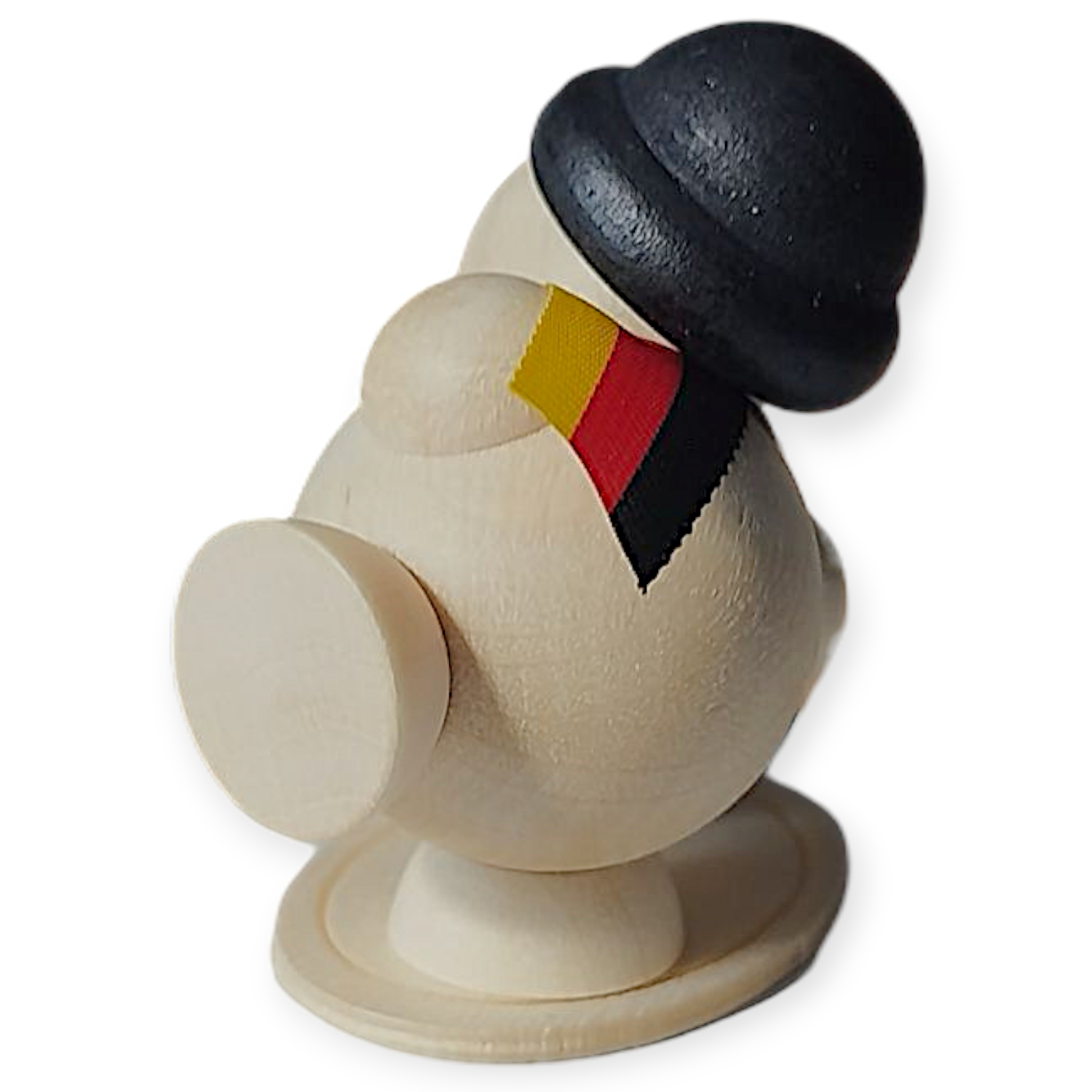 With its round, spherical shape, signature red nose, and broad smile, the snowman radiates pure joie de vivre. He wears a black hat with “COOL MAN” lettering and a scarf in the colors black, red, and yellow, creating a proud reference to German soccer. Next to him lies a meticulously painted soccer ball, which fits perfectly into the overall picture.
