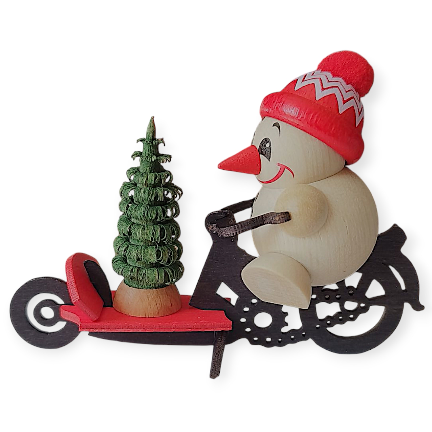 A real highlight is the black cargo bike on which the snowman sits securely. With strong hands, he holds the handlebars and skillfully transports a small, green woven Christmas tree miniature. This special cargo emphasizes the wintery, festive flair and makes the figure a unique eye-catcher. The contrast between the dark wheel, the red loading area, and the light natural wood is particularly striking, creating a harmonious interplay that immediately catches the eye.