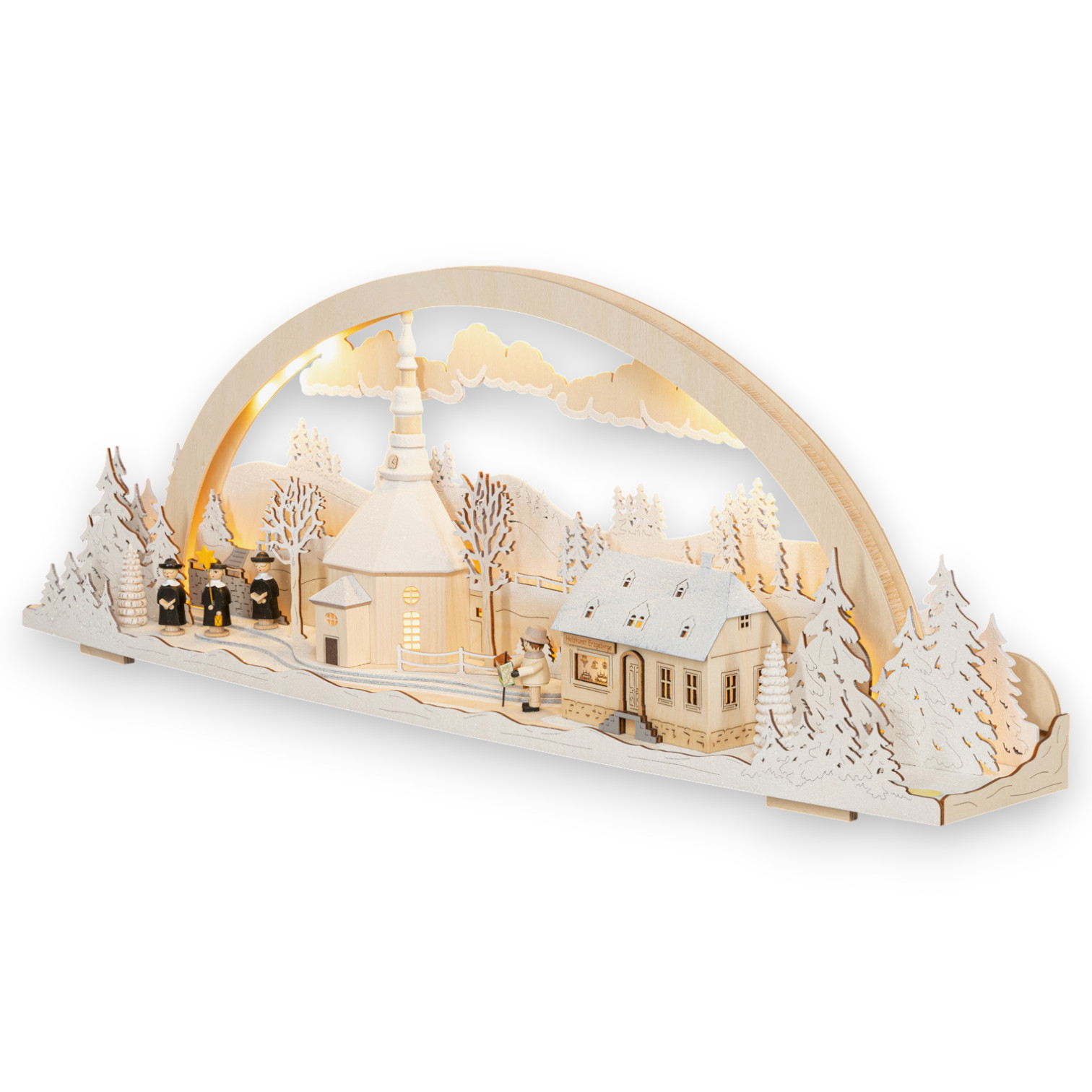 The Seiffen diorama light from Tietze impressively combines artistic Erzgebirge tradition and modern technology. The motif depicts the picturesque Seiffen church with its characteristic, pointed steeple, surrounded by a natural winter landscape of delicate firs and bare trees, all completely covered in glittering snow. Three carol singers with a star and lantern bring a festive atmosphere to the scene. Next to them stands a hiker with his dog, lending the motif additional vibrancy. A typical Erzgebirge house completes the harmonious image. The entire arrangement is crafted from 3 mm thick birch plywood and subtly airbrushed, lending the scene a warm, inviting ambiance.