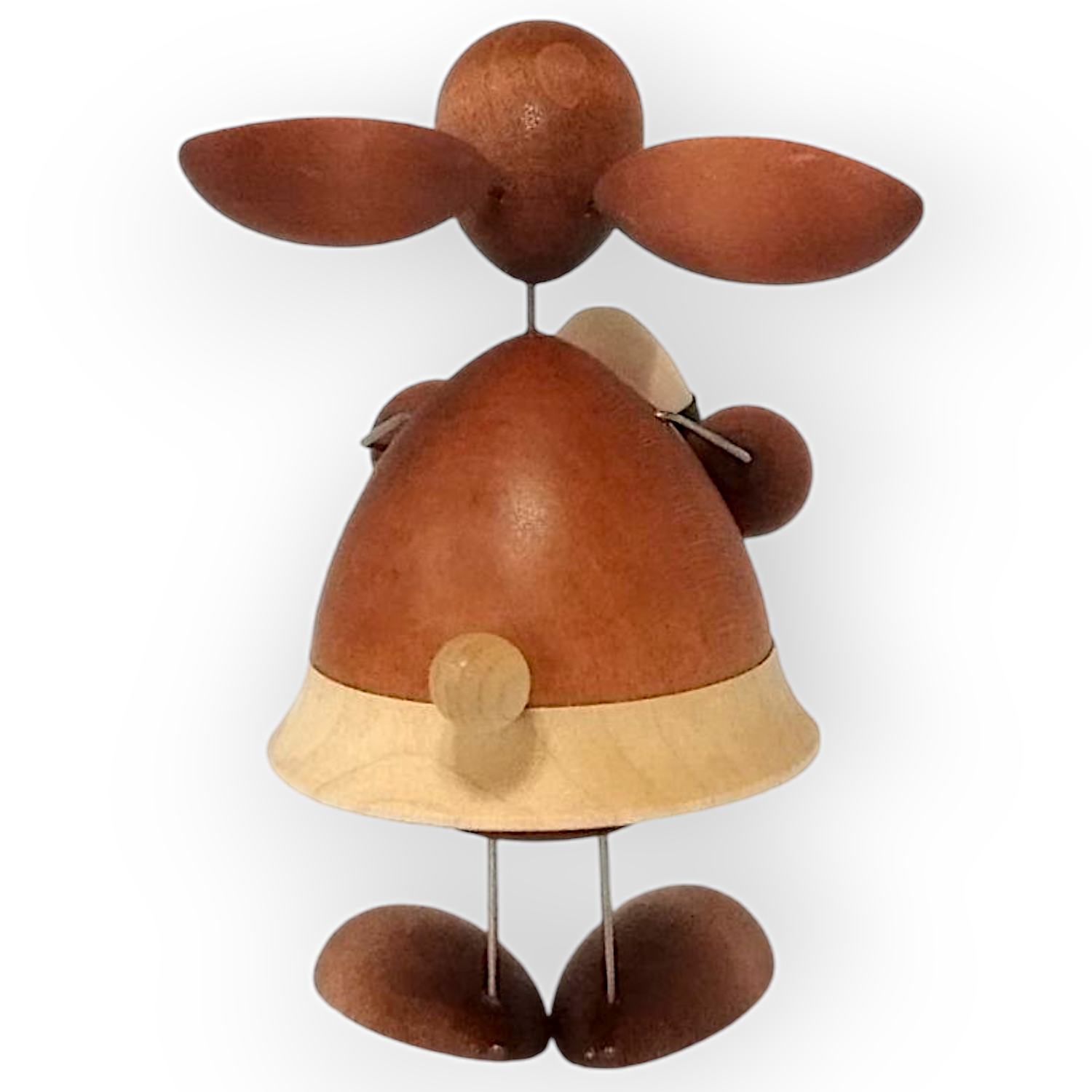 Her ears consist of two elongated wooden elements, which are asymmetrically designed and, with their light coloring, create a harmonious contrast to the brown head. The spherical head is decorated with small black dots for eyes, giving the bunny a gentle and friendly expression. Her cute buck teeth, represented by a small, light wooden element, add an additional touch of playfulness.