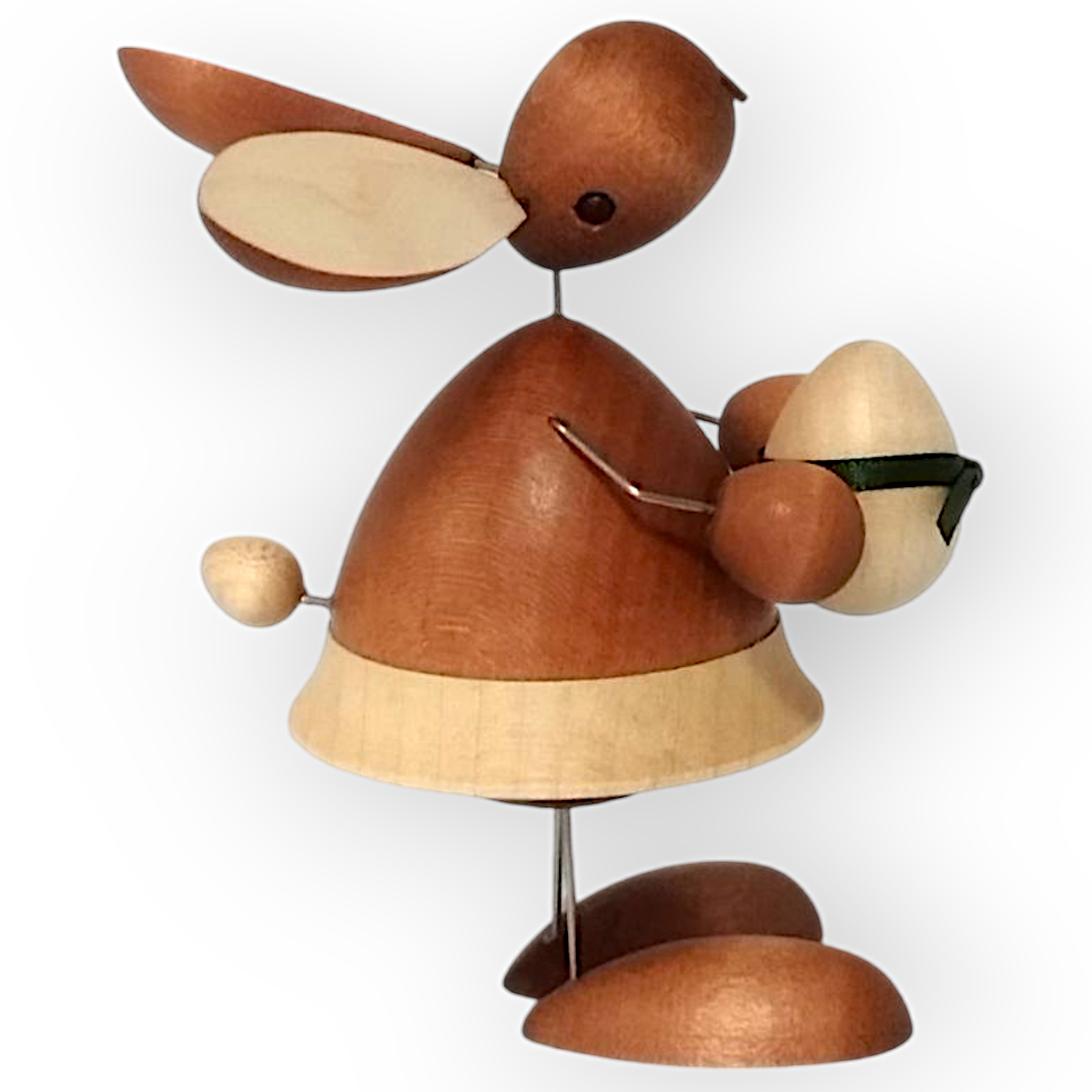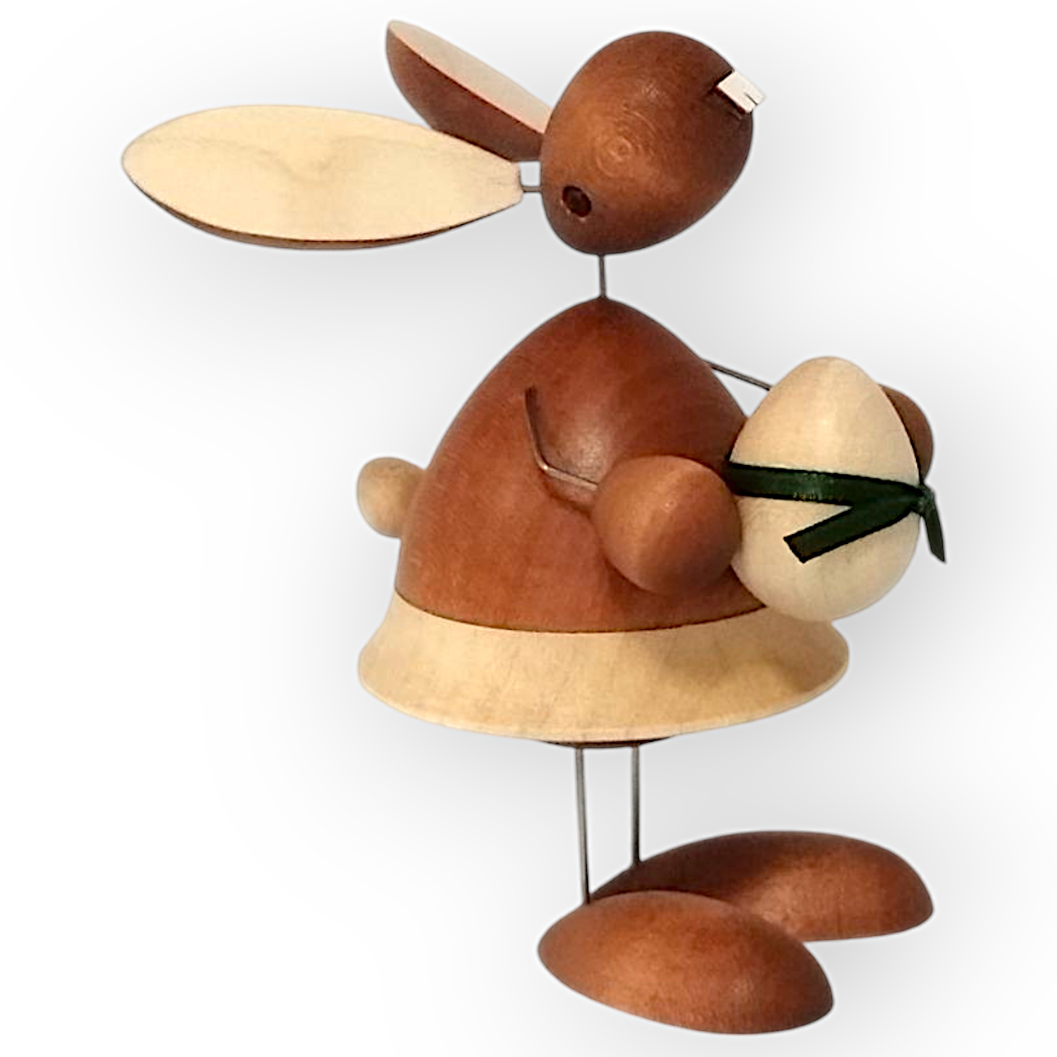 The Easter bunny with an egg is a lovingly crafted wooden figurine that captivates with its charm and attention to detail. Her body has a smooth, egg-shaped form, painted in warm brown tones, conveying a natural grace. The lower part of her body is complemented by a light skirt, emphasizing her feminine charisma.