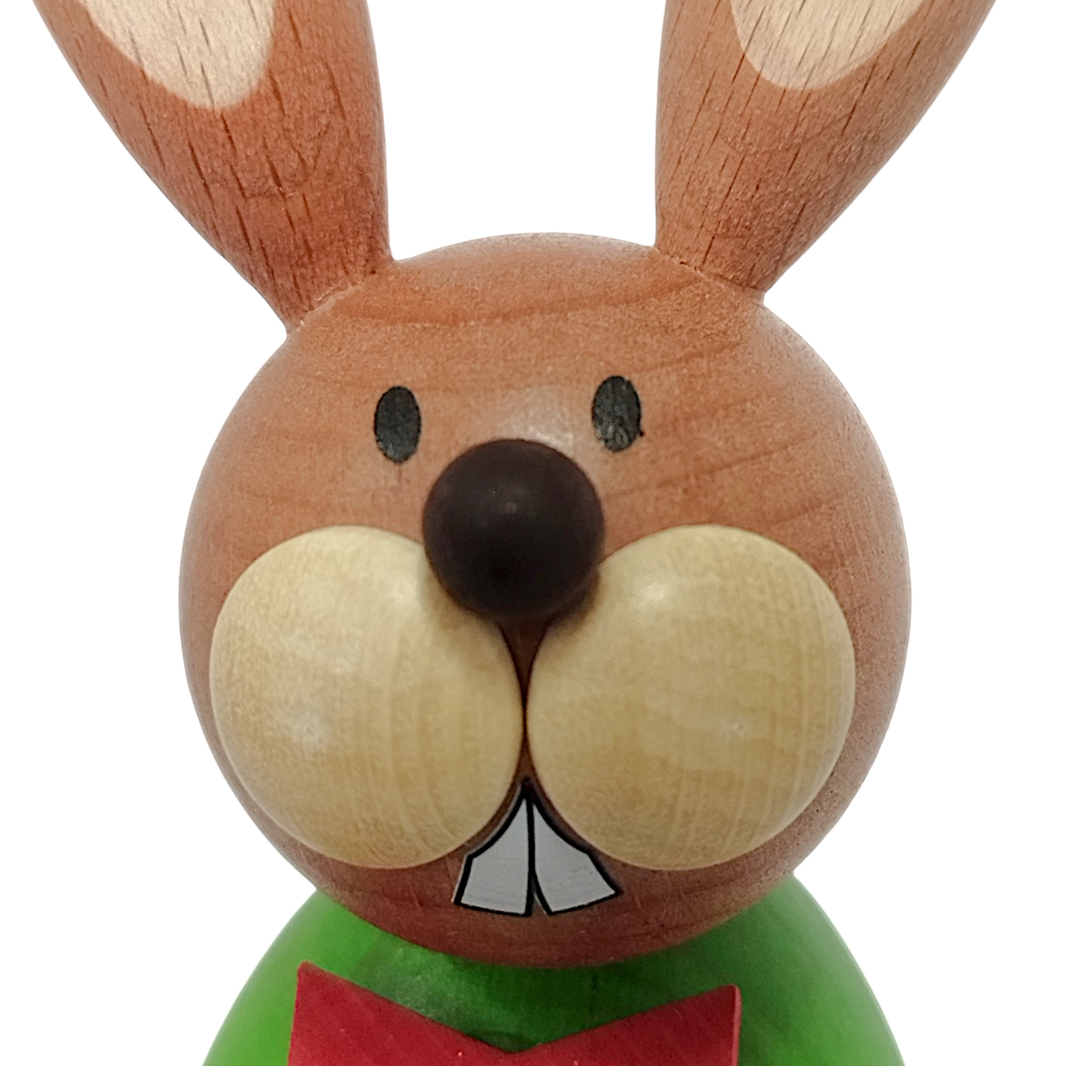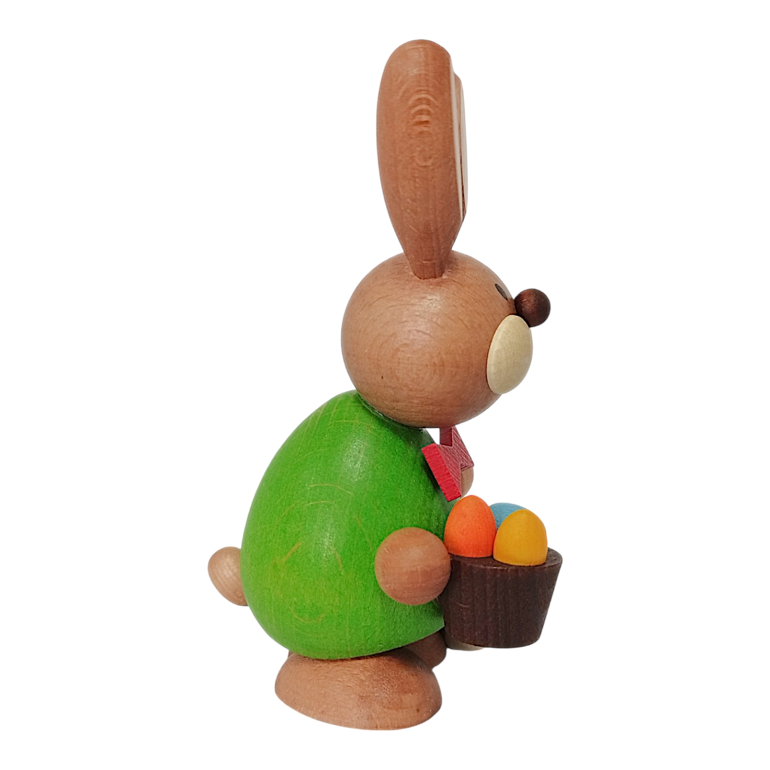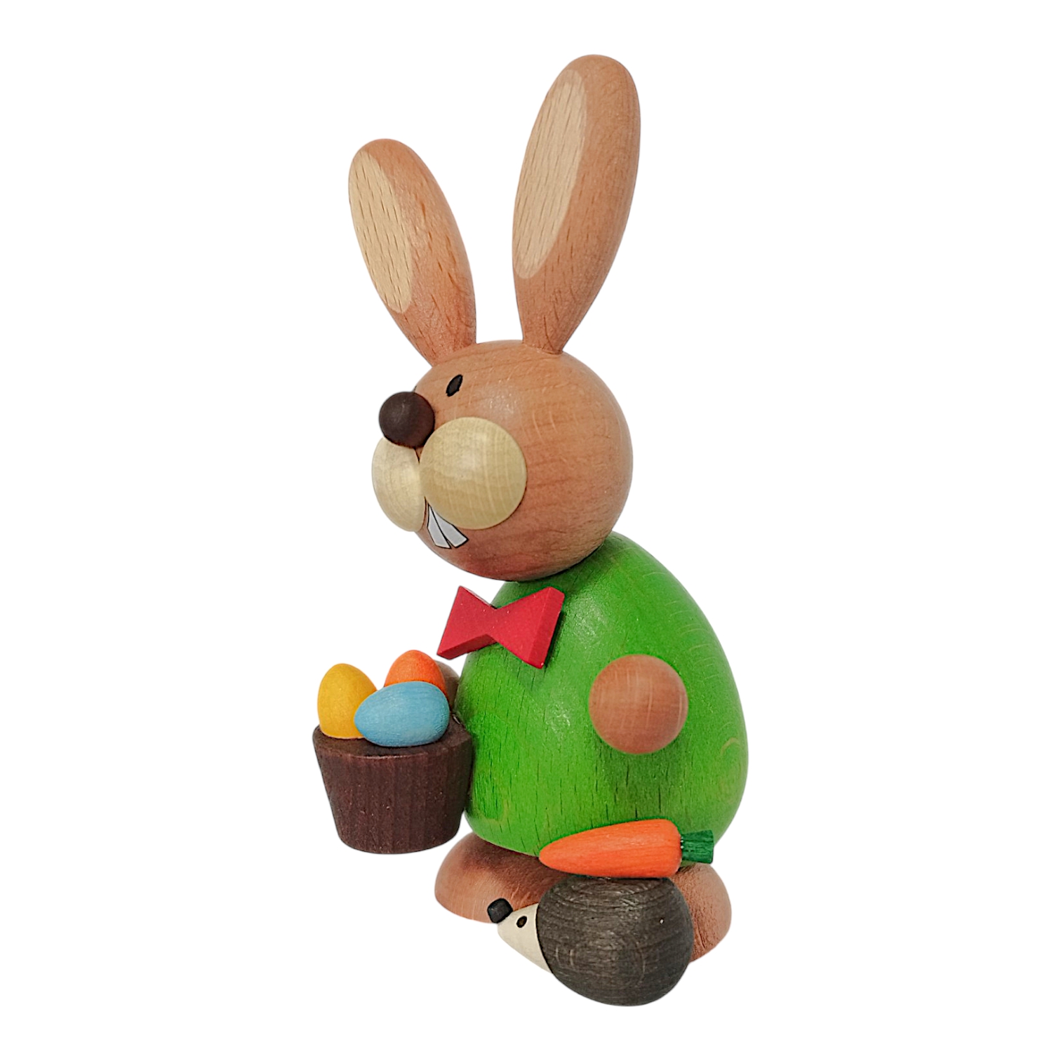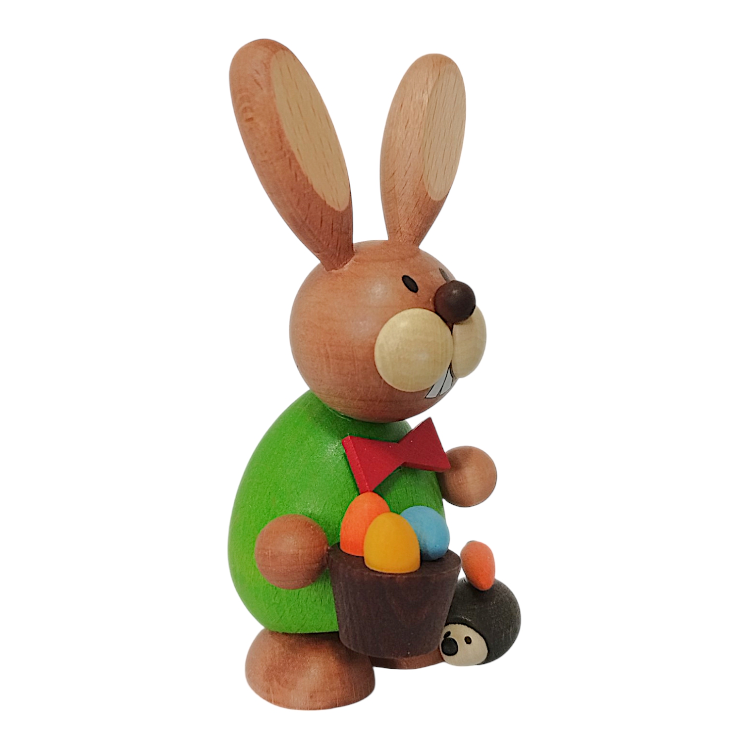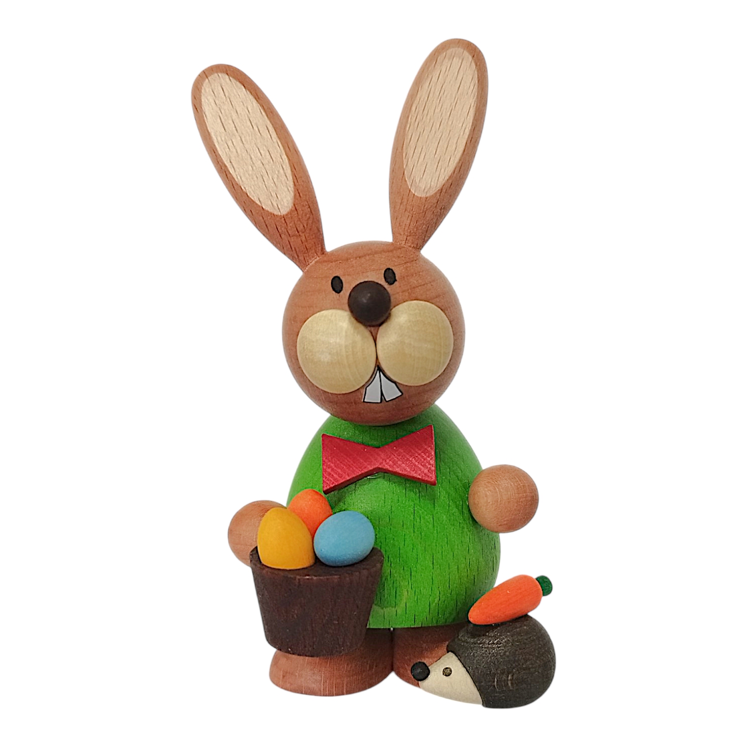 This charming Easter bunny, standing with a hedgehog and egg basket, is a lovingly crafted wooden figure that impresses with its vibrant colors and playful details. The bunny wears a striking bright green top, adding a cheerful touch of spring, while a bright red bow tie around its neck gives it a particularly festive look.