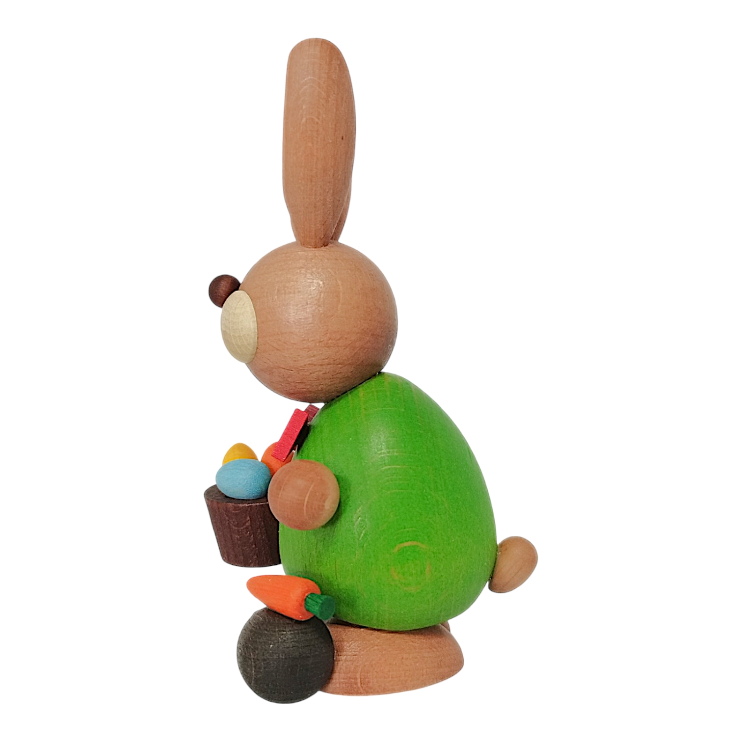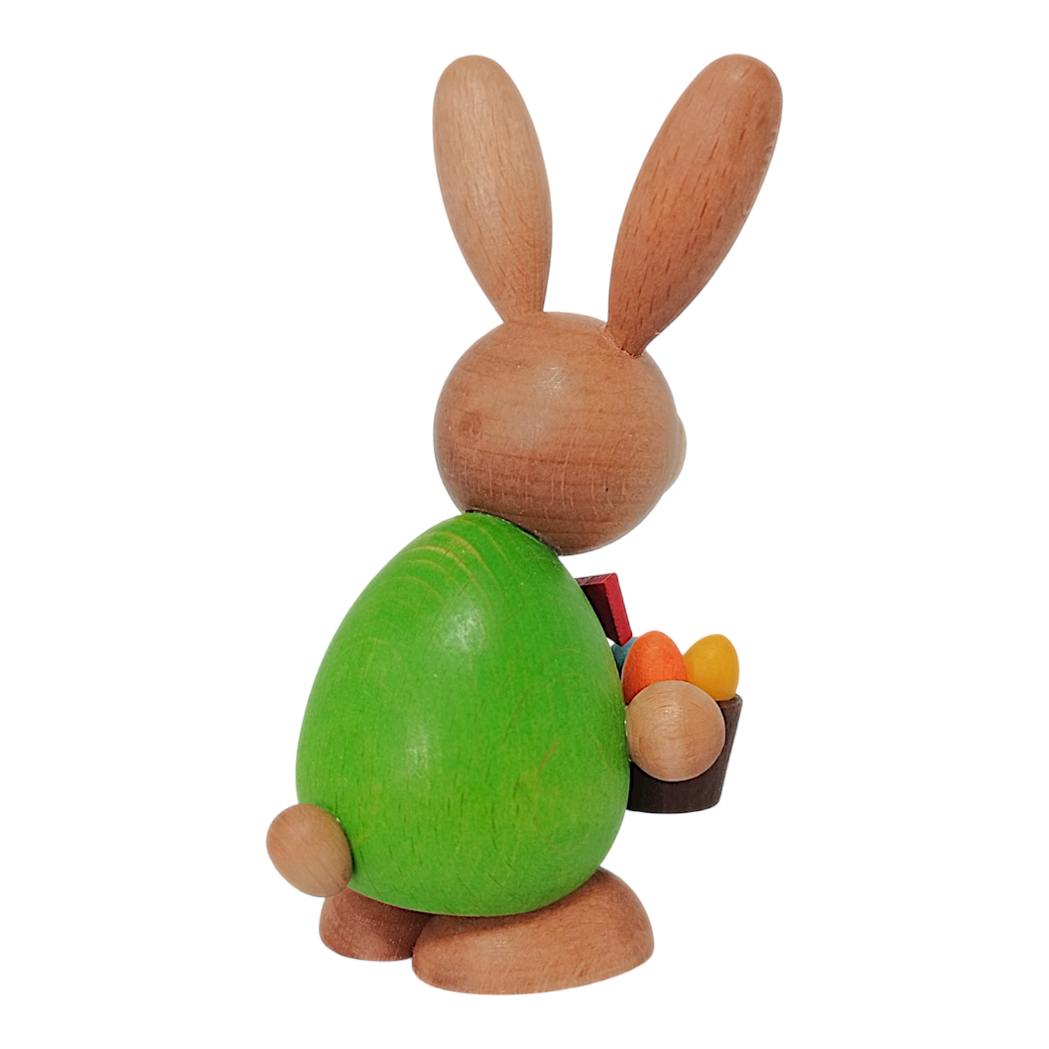 The friendly face is characterized by its large, light-colored cheeks and two typical incisors. The long ears are natural-colored with light inner surfaces, highlighting the natural look of the wood. In its paws, the bunny holds a dark brown basket filled with colorful eggs in orange, yellow, and blue.