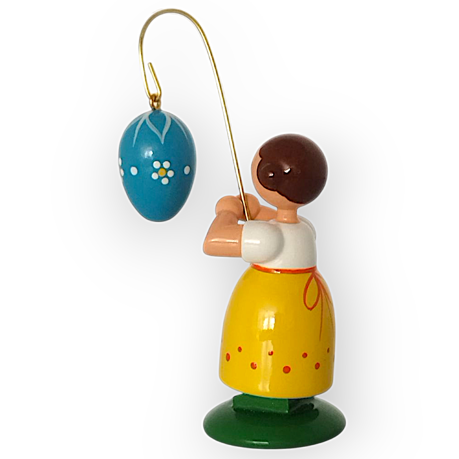 In her hands, she holds a golden stick from which hangs a blue Easter egg. The egg’s white patterns make it a real eye-catcher and complement the figurine’s colorful design. Every detail of the Easter egg appears carefully crafted and blends perfectly into the overall picture.