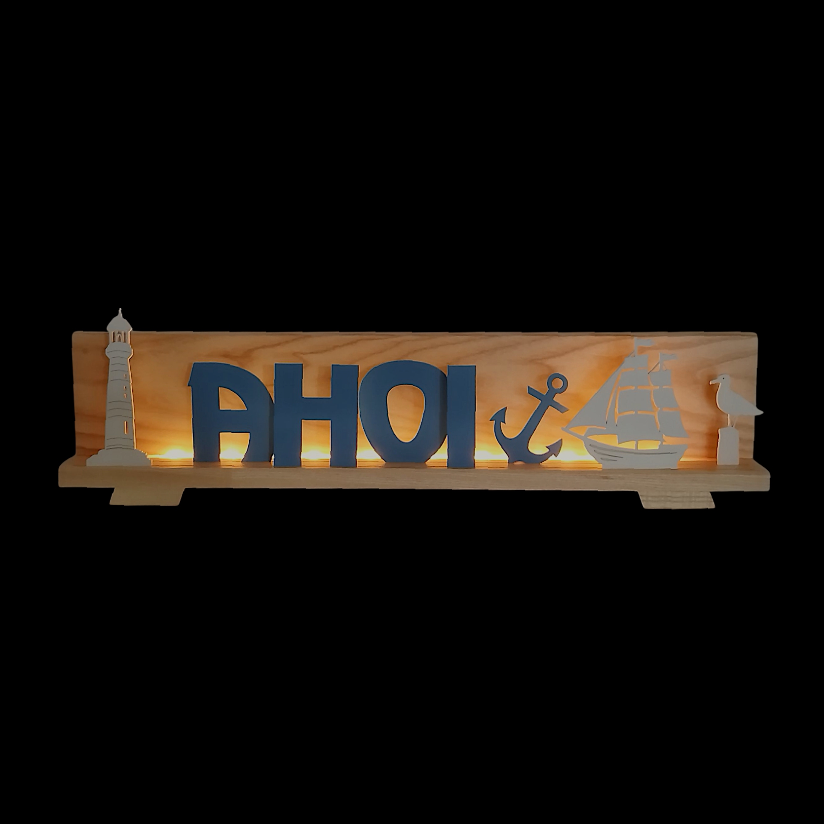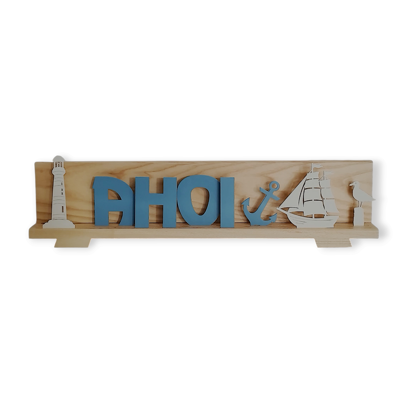 The set consists of eight individual pieces made of high-quality, 0.3 cm thick plywood in white and blue. The figurines are designed to be easily inserted into the slots of the separately available decorative base. The set includes four letters that together form the word “AHOI,” as well as an anchor, a seagull, a sailing ship, and a lighthouse. Each figurine is richly detailed and perfectly captures the maritime feeling. The dimensions of the individual figurines vary: The letters are 9.4 cm high, the anchor is 8.4 cm high, the seagull is 8.4 cm, the sailing ship is 11.3 cm, and the lighthouse is 13.6 cm.