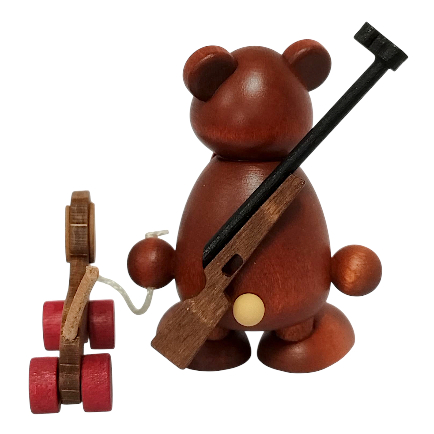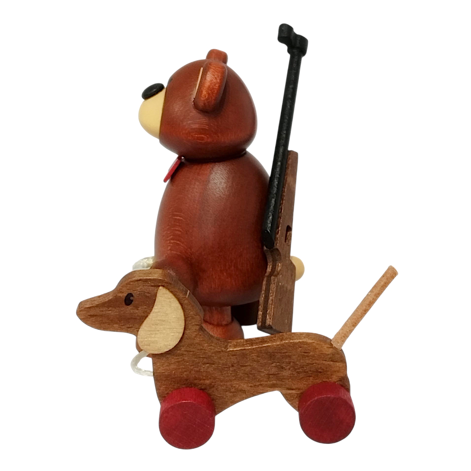 On his back, Bärnd carries a detailed rifle, marking him as a typical hunter. The warm, dark brown wood and yellow snout make his expression particularly friendly. A bright red bow tie adds a playful and festive touch. Hobler designs Bärnd with great sensitivity, ensuring each figure has a unique character. The finely polished surface feels pleasantly smooth and highlights the quality of this handcrafted bear.
