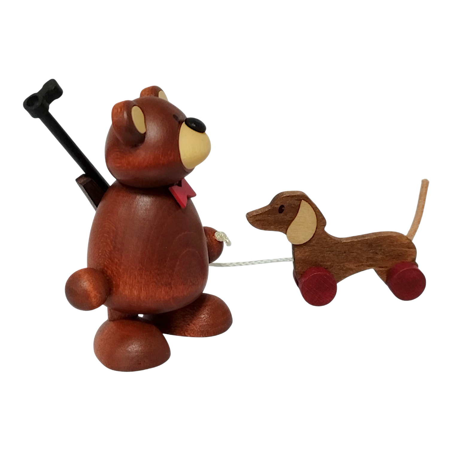 Bärnd’s light-colored snout, which, together with his large bear paws, evokes a smile, is particularly charming. The dachshund faithfully accompanies him on his journey, enhancing the cheerful scenery that delights children and adults alike. Thanks to the sturdy construction and high-quality varnish, the colors and shapes will last for many years.
