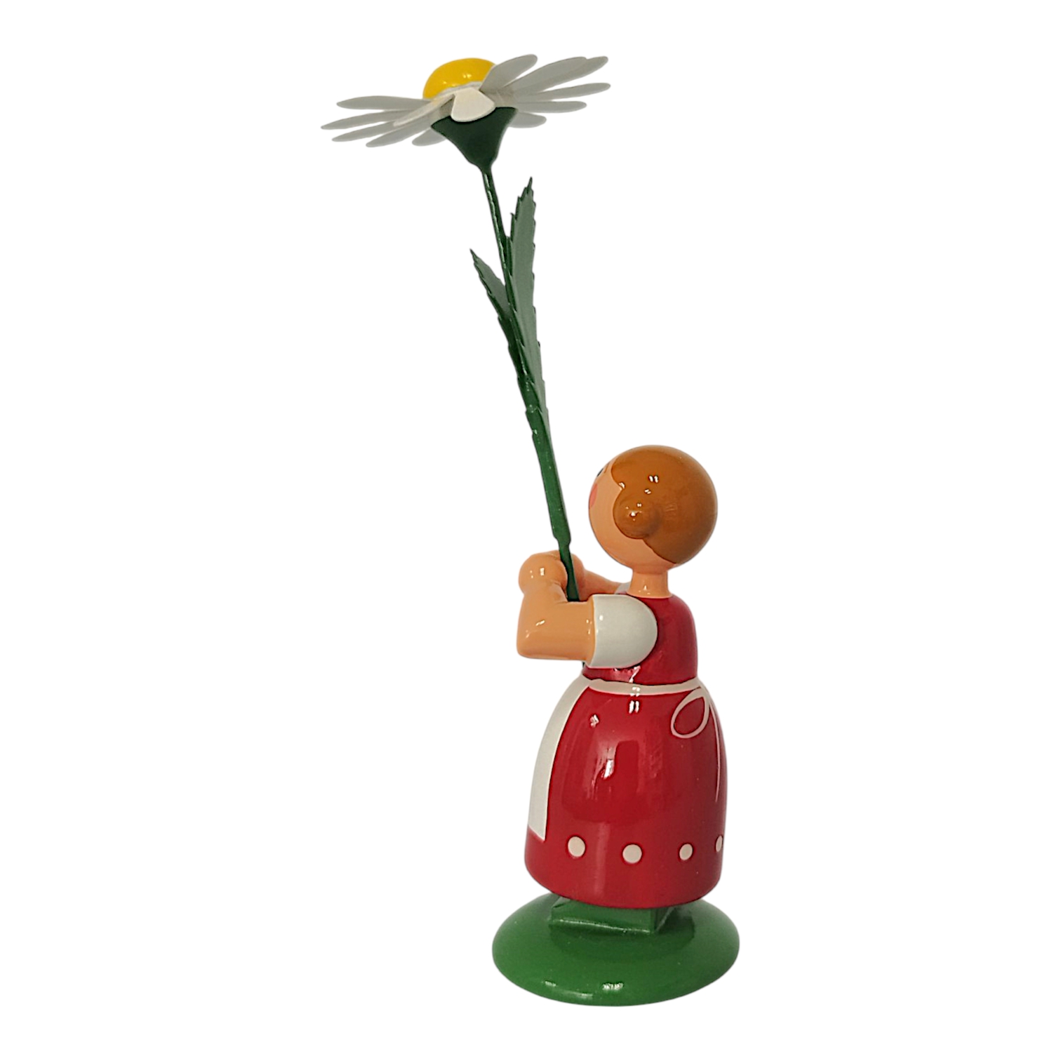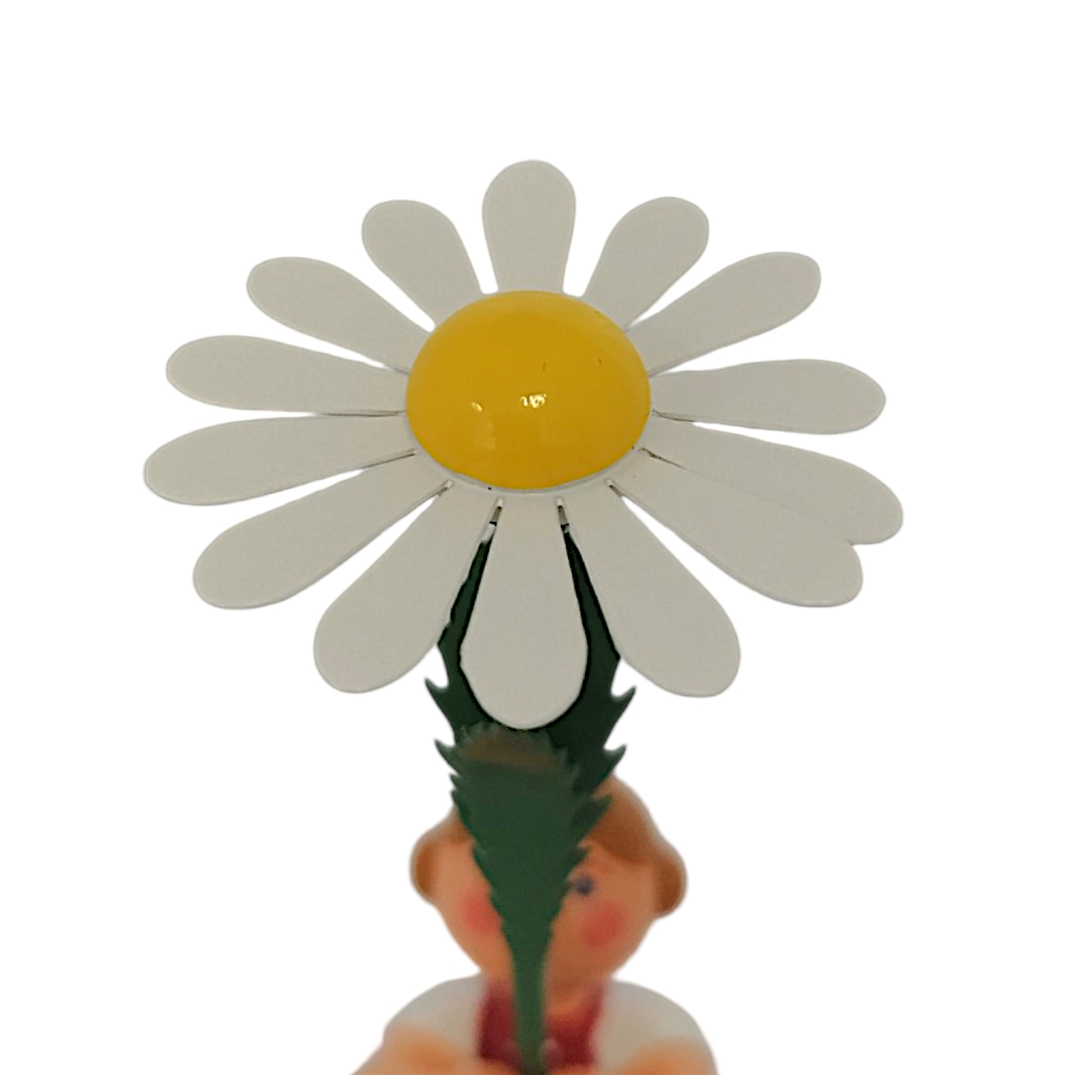 Dressed in a vibrant red dirndl with a white blouse and a bright white apron, this flower girl brings a cheerful summer atmosphere to any home. She holds a large, radiant white daisy with a bright yellow center, its long green stem and intricately serrated leaves highlighting the delicate craftsmanship. The little girl’s friendly face, with its rosy cheeks, bright blue eyes, and red mouth, is meticulously hand-painted. Her light brown hair is curled into two charming little buns, while she stands securely on a lush green base reminiscent of a summer meadow.