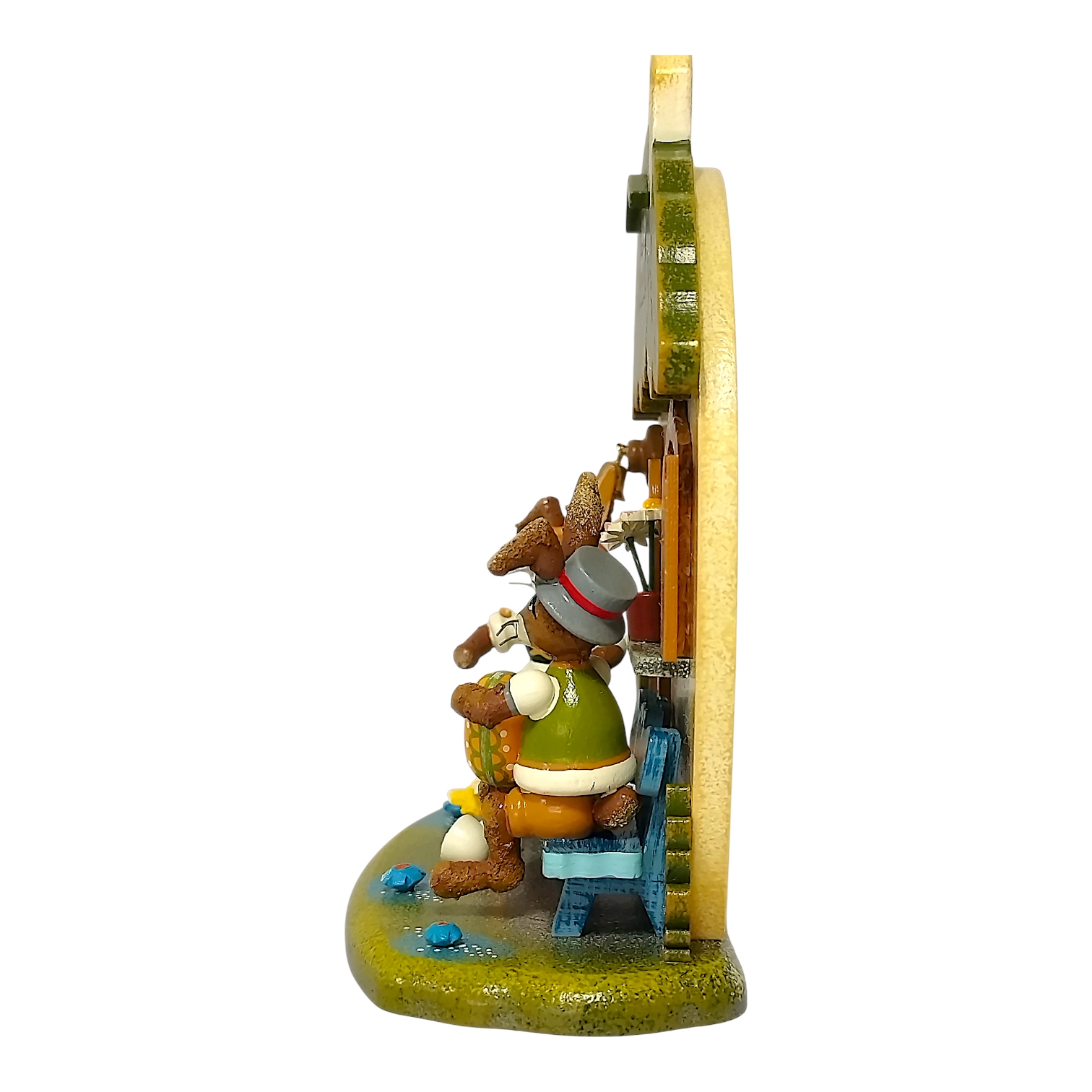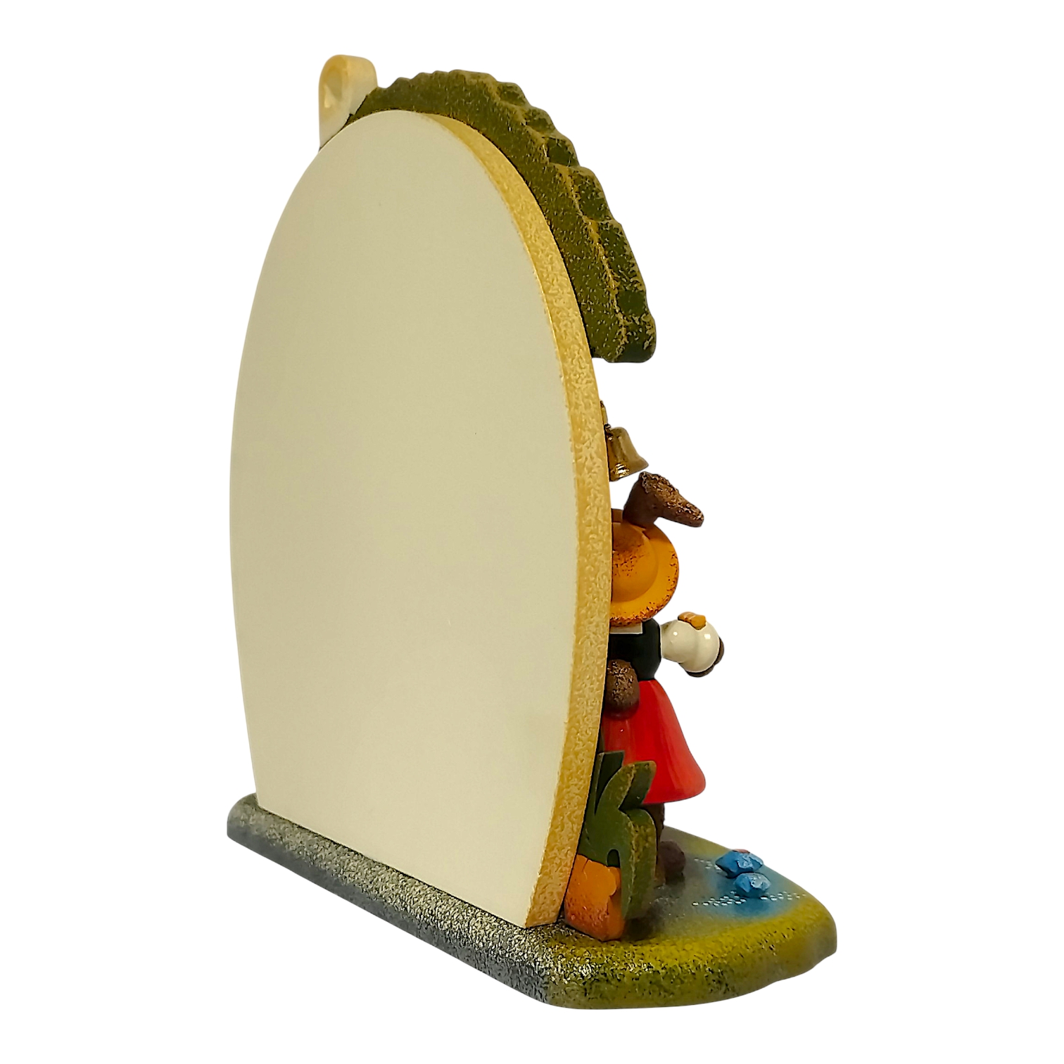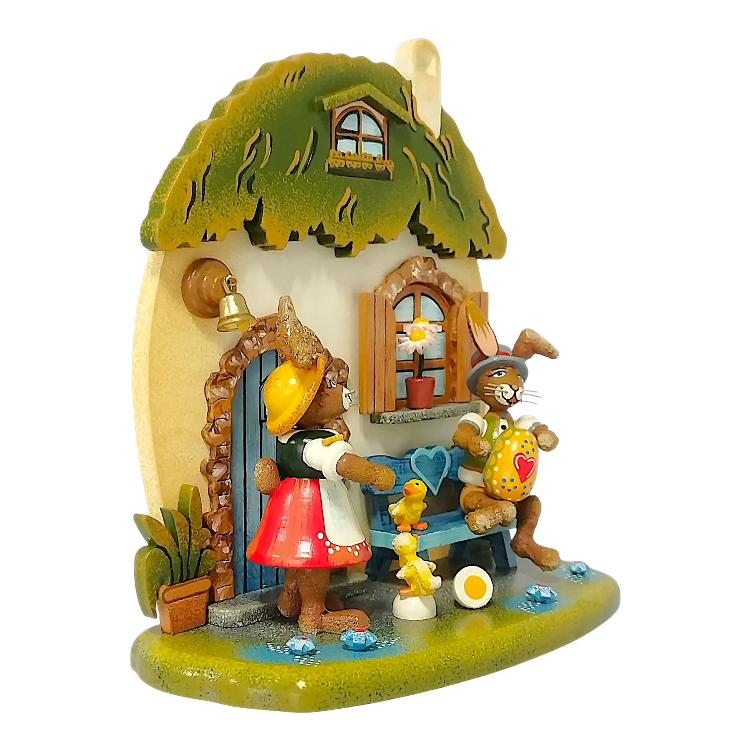 This enchanting Hubrig collectible figurine of bunny house transports you to a fairytale world full of charm and loving details. The hand-painted wooden house features a green roof reminiscent of reeds, giving it a rustic character. A cream-colored chimney rises cozily, while a small window with a flower box in the attic invites you to linger.