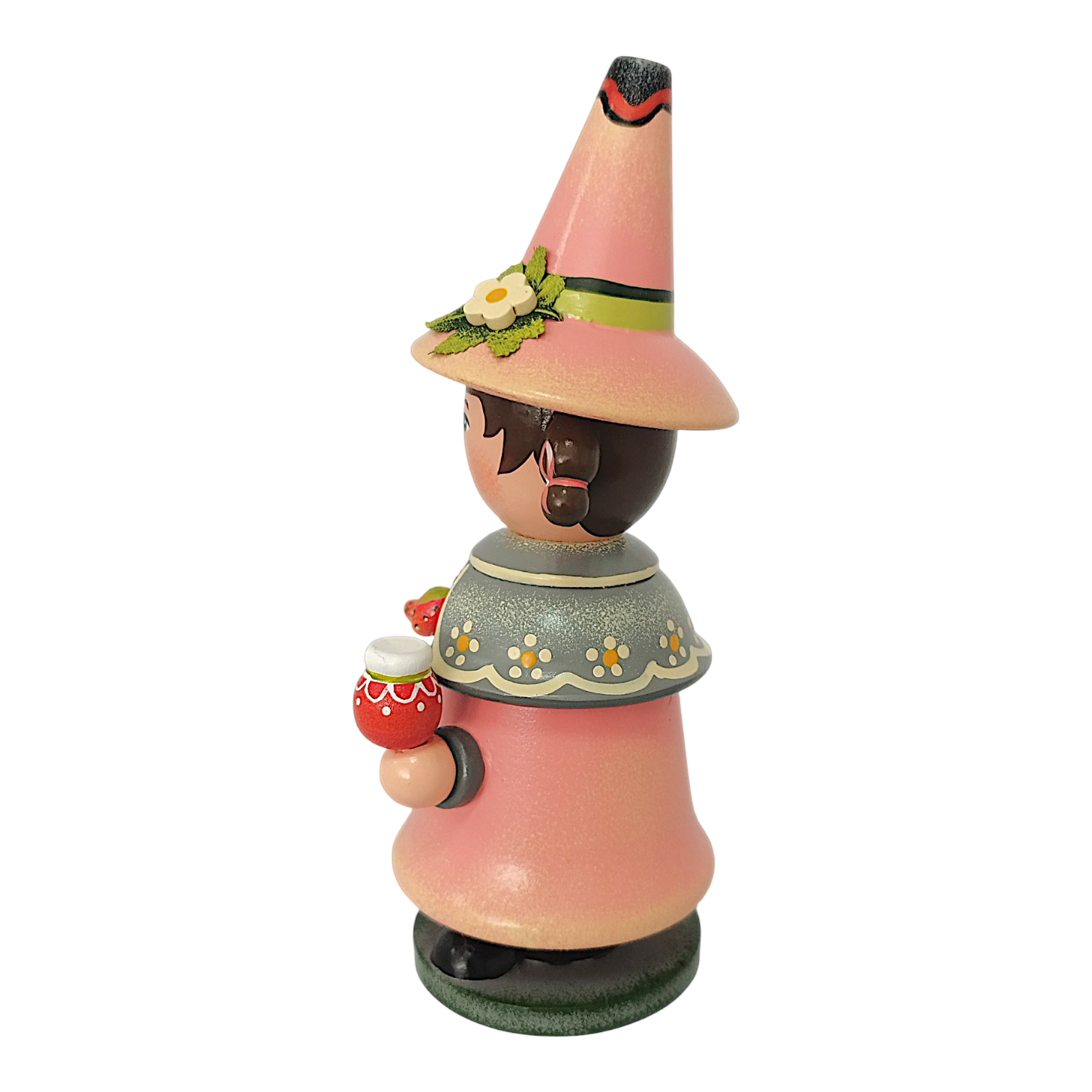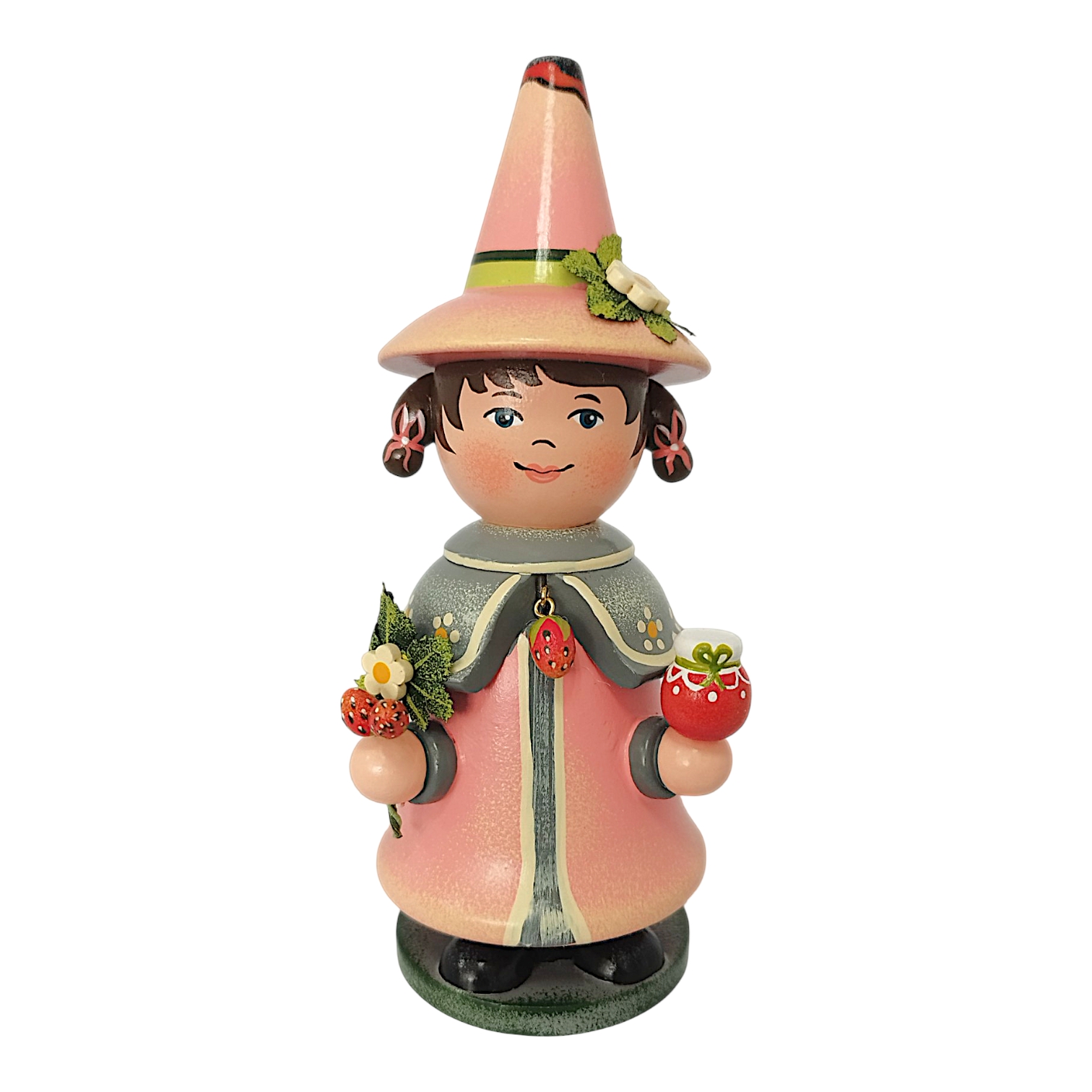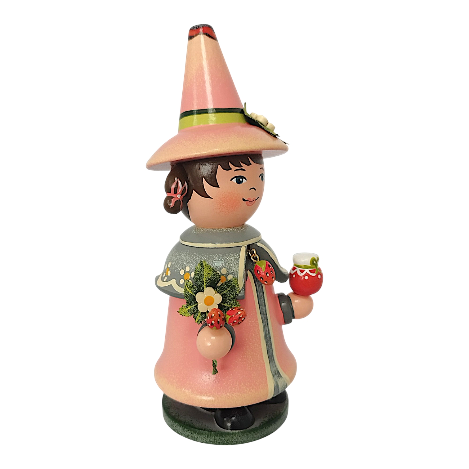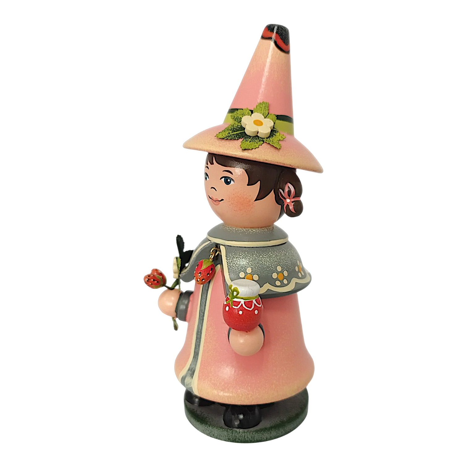 The charming Hubrig Strawberry Gnome incense smoker from Hubrig Folk Art celebrates the summery berry as a timeless treat for all year round. The figure is almost entirely in a vibrant, bold strawberry red that perfectly complements the gray accents of its robe. A special highlight is the short shoulder cape, adorned with a delicate polka dot pattern and fastened in the center by a filigree strawberry blossom brooch. In his hands, the gnome presents fruity delicacies: in his right hand, he holds a cone with three colorful scoops of ice cream, while in his left, on a small wooden tray, he serves a selection of incredibly realistic, plump strawberries.