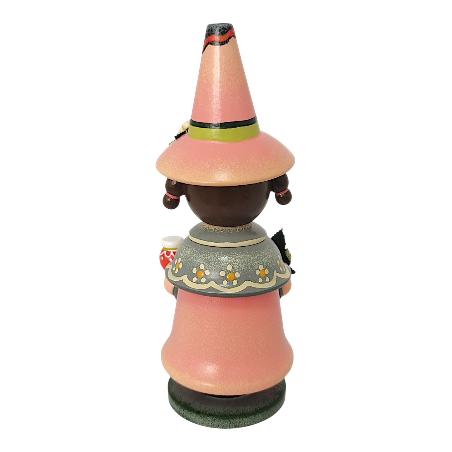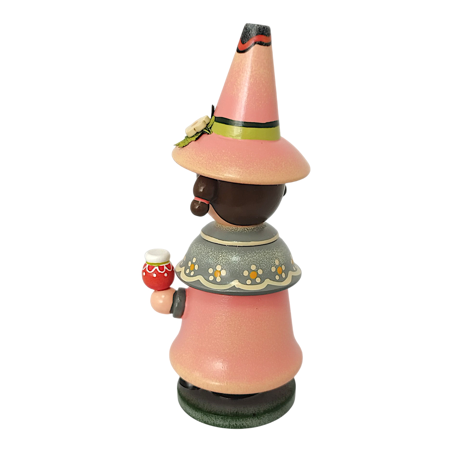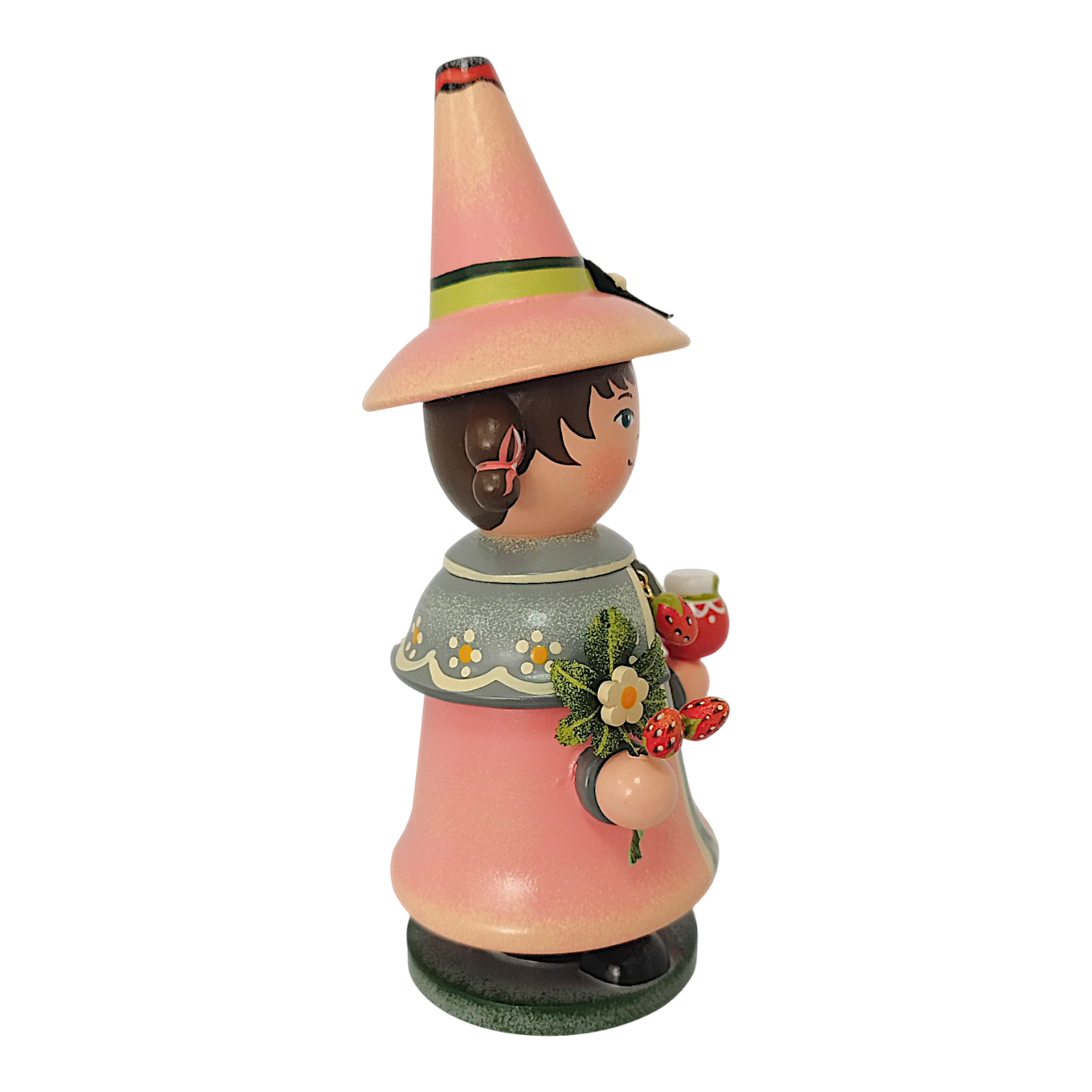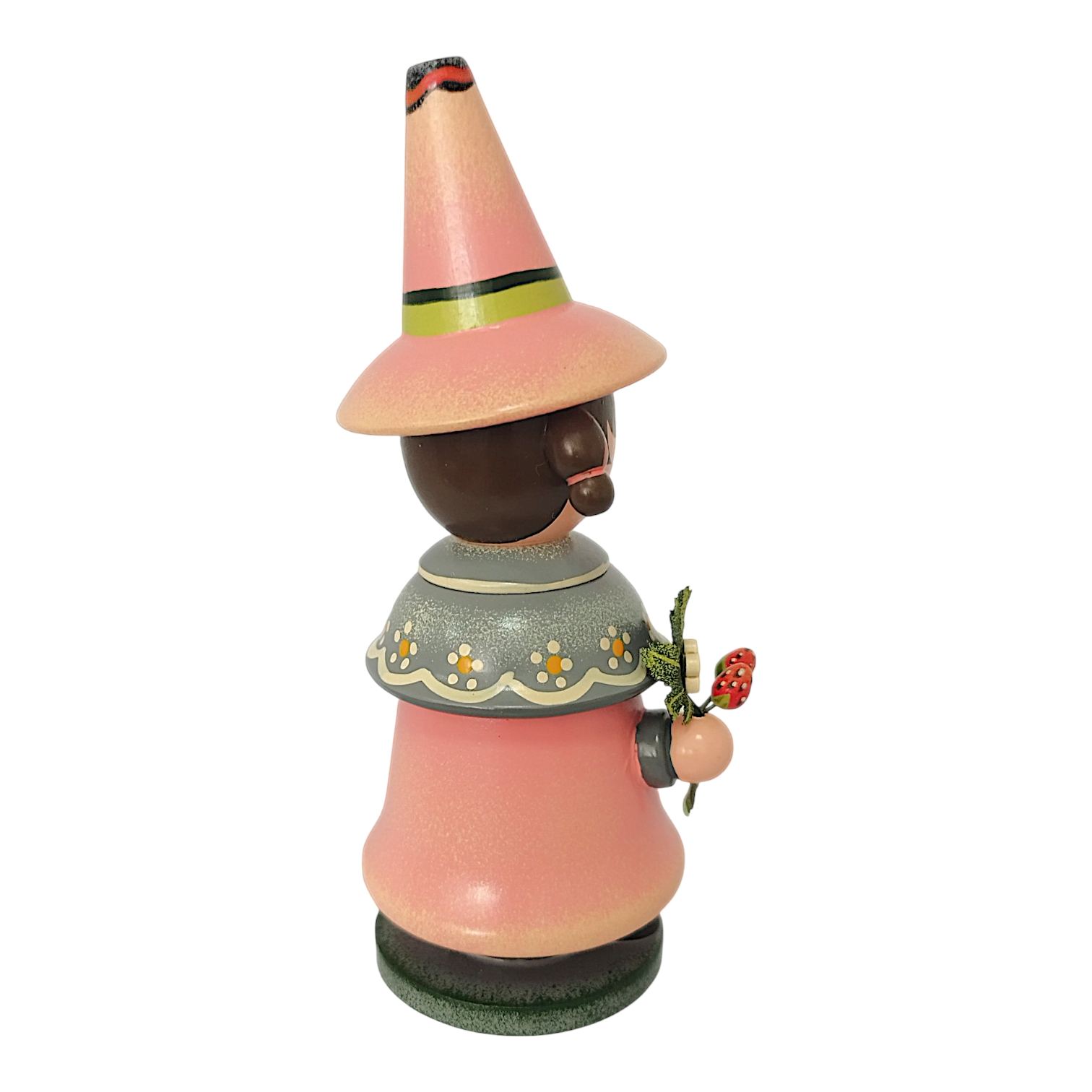 The charming Hubrig Strawberry Gnome incense smoker from Hubrig Folk Art celebrates the summery berry as a timeless treat for all year round. The figure is almost entirely in a vibrant, bold strawberry red that perfectly complements the gray accents of its robe. A special highlight is the short shoulder cape, adorned with a delicate polka dot pattern and fastened in the center by a filigree strawberry blossom brooch. In his hands, the gnome presents fruity delicacies: in his right hand, he holds a cone with three colorful scoops of ice cream, while in his left, on a small wooden tray, he serves a selection of incredibly realistic, plump strawberries.