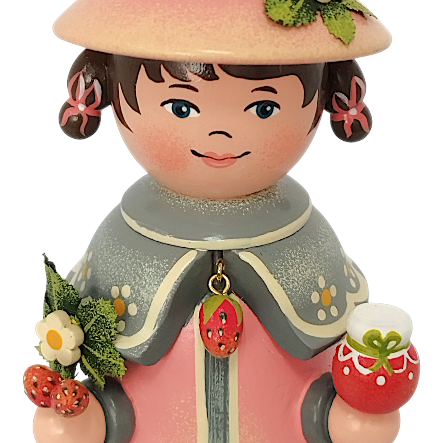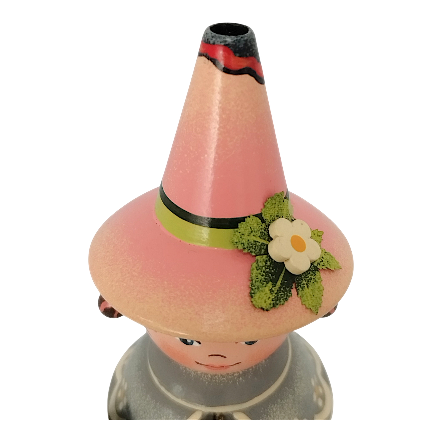 The gnome’s face radiates a warm, childlike charm so typical of Hubrig’s style. The large, deep brown eyes are highlighted with a soft shimmer, giving the gaze a lively depth, while the delicate, gracefully painted eyebrows and the small, smiling mouth emphasize the gnome’s friendly nature. The cheeks are shaded in a soft rose tone, lending the figure a healthy, radiant appearance. The hair is a rich, dark brown and frames the face perfectly with precisely painted bangs. The two small braids peeking out at the sides, each tied with a matching red ribbon, are a particularly charming detail.