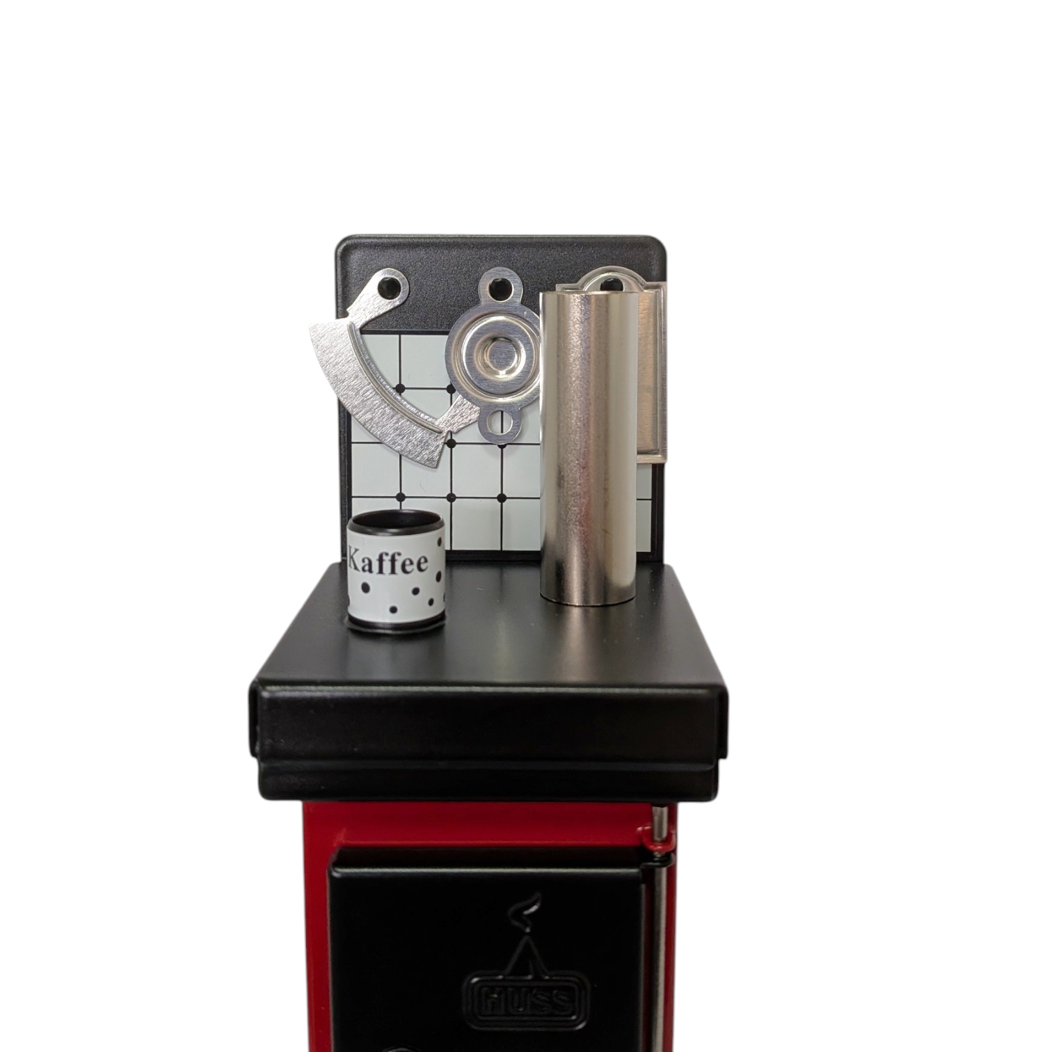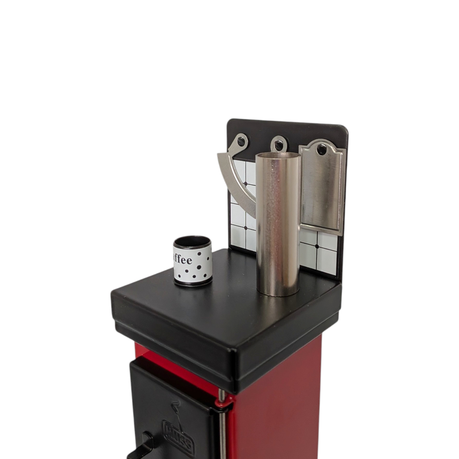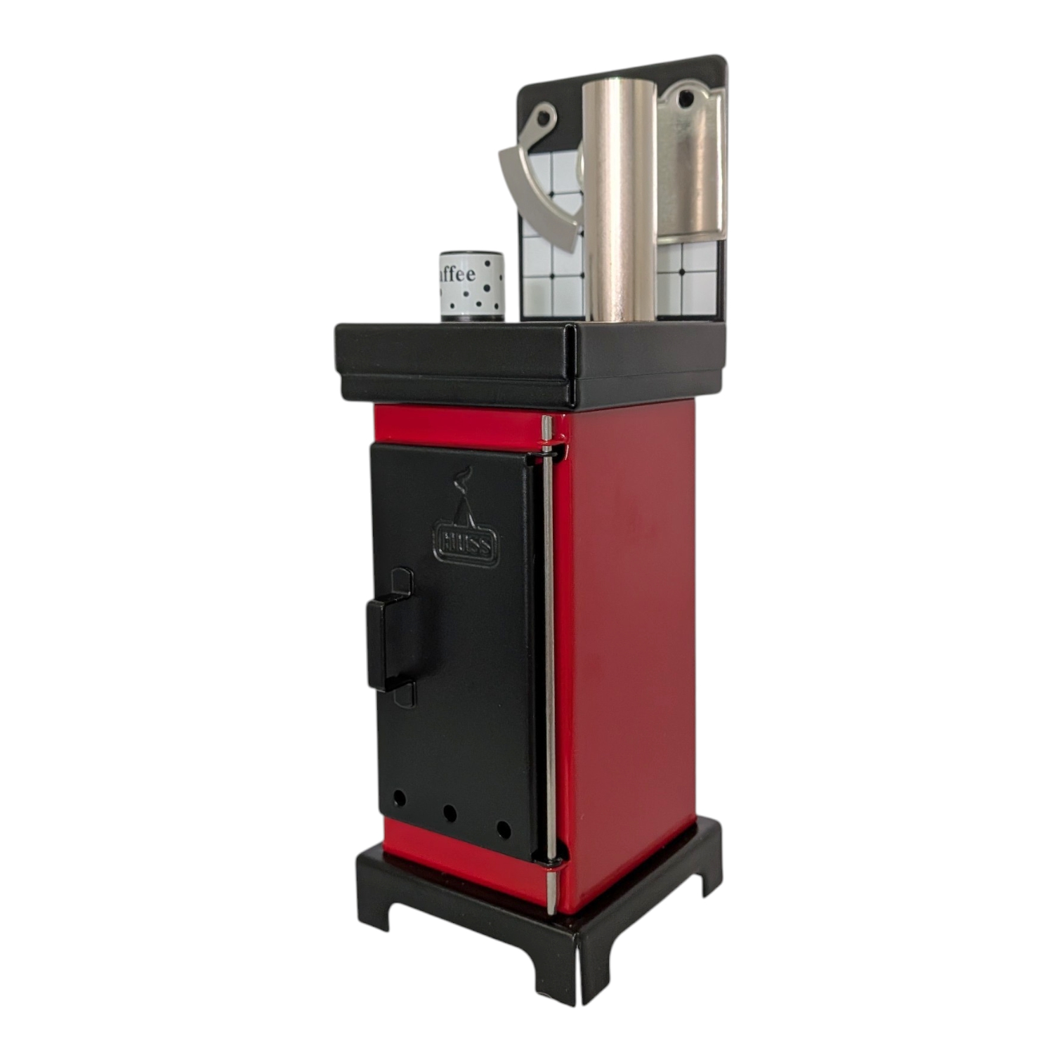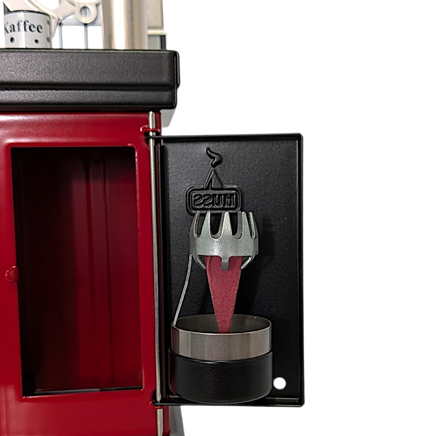 With great attention to detail made, a HUSS Incense candles oven “The classic” red/black as a small kitchen stove for the use of incense with small pieces of cutlery created for hanging on the back wall flow.