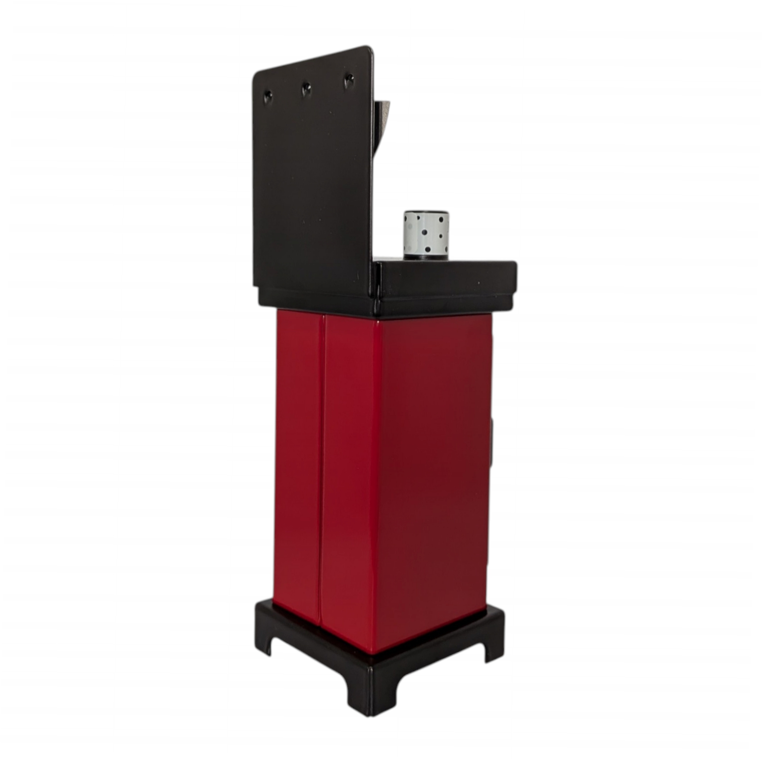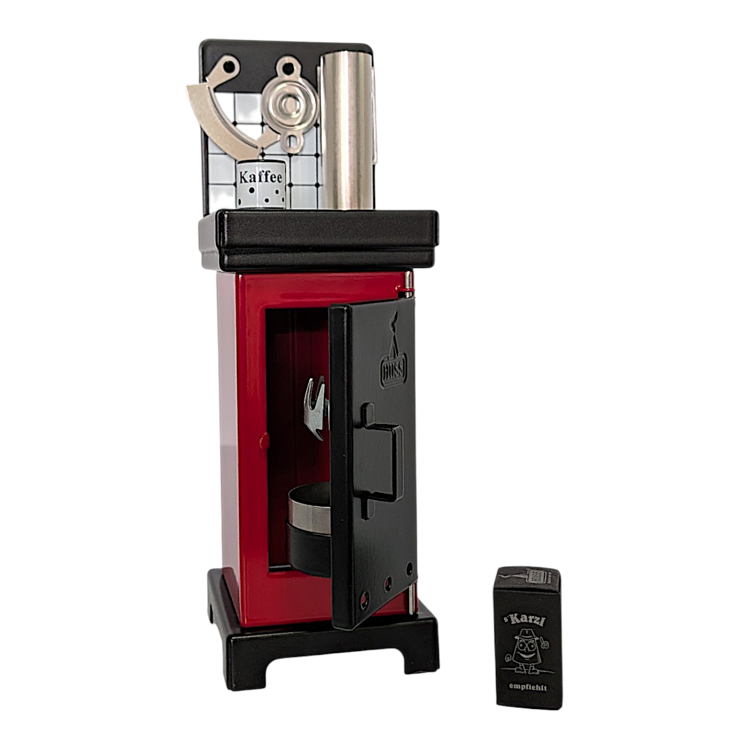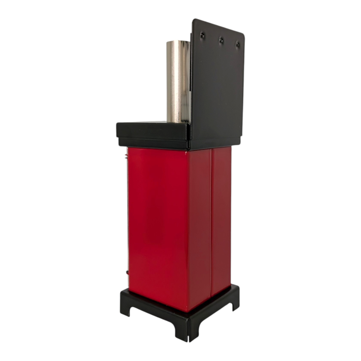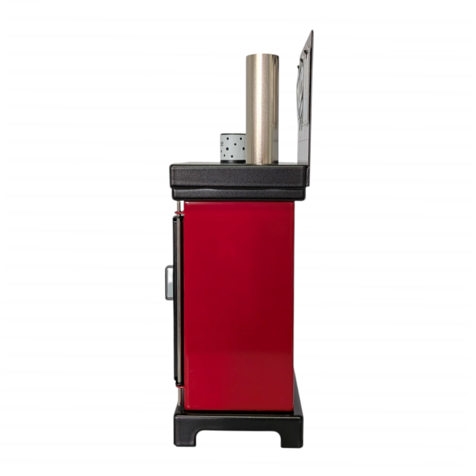 With great attention to detail made, a HUSS Incense candles oven “The classic” red/black as a small kitchen stove for the use of incense with small pieces of cutlery created for hanging on the back wall flow.