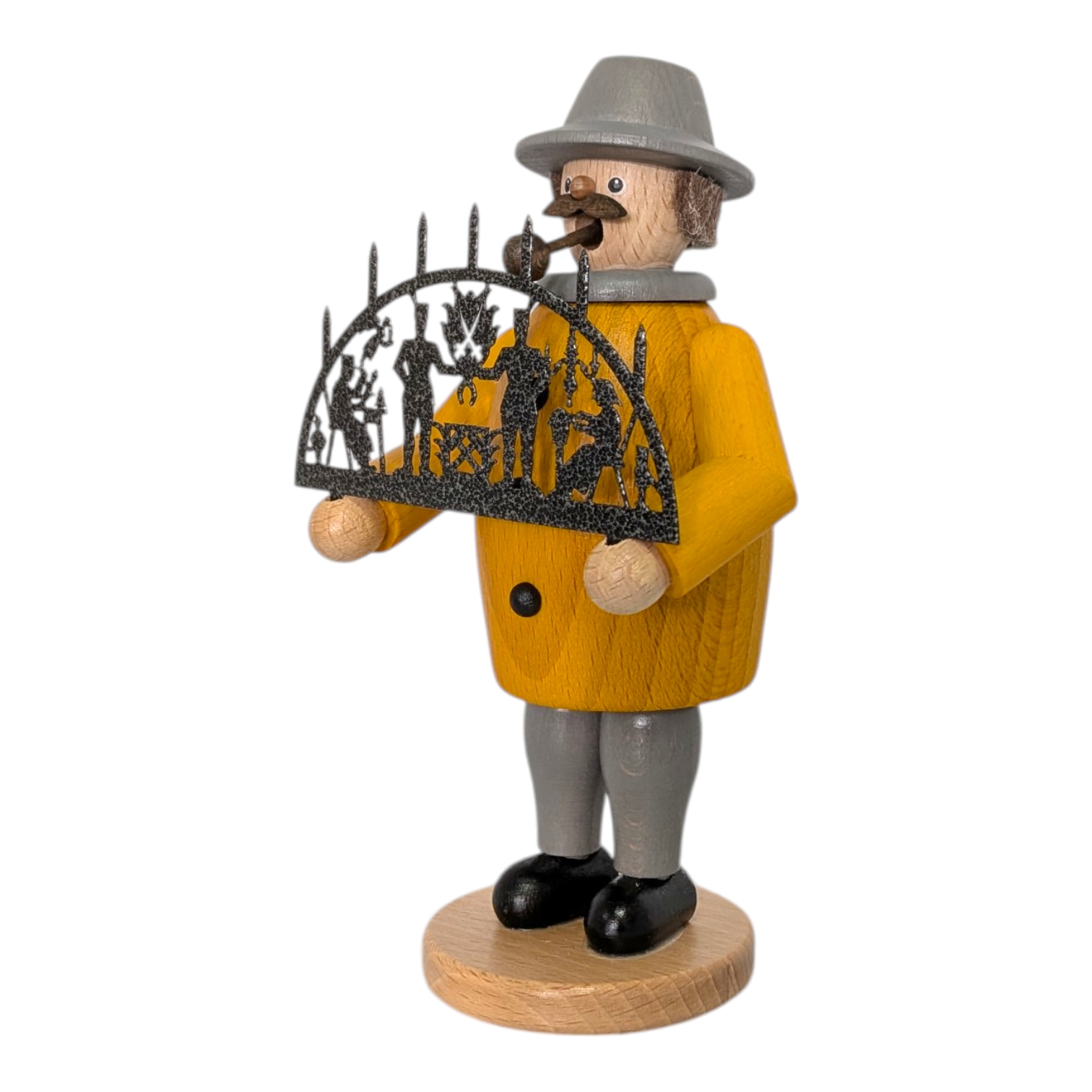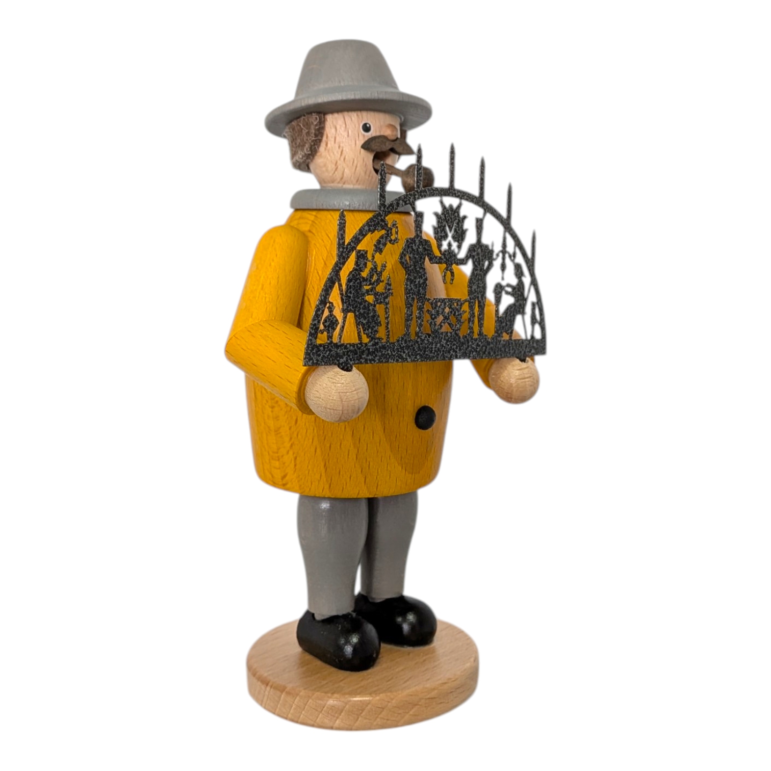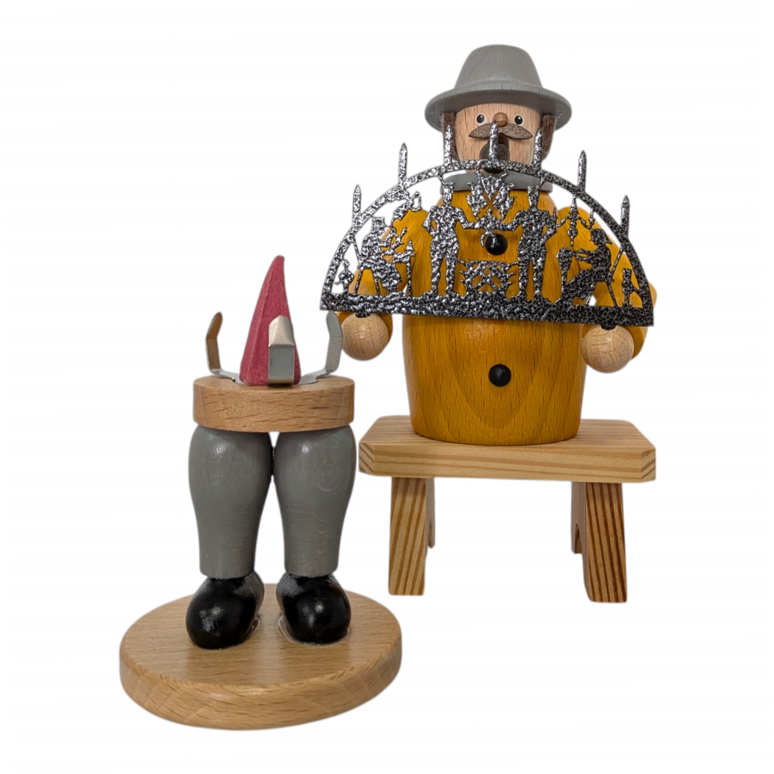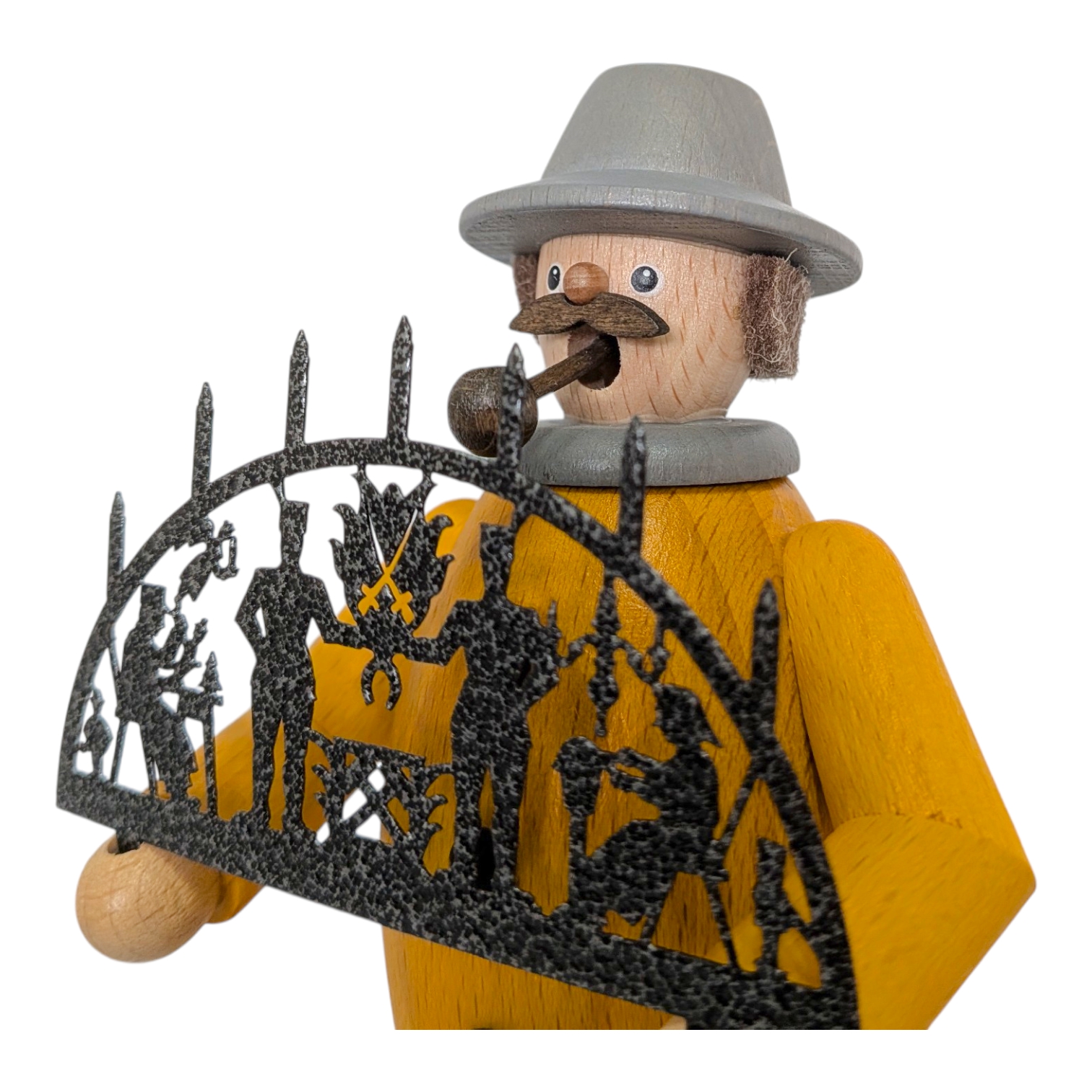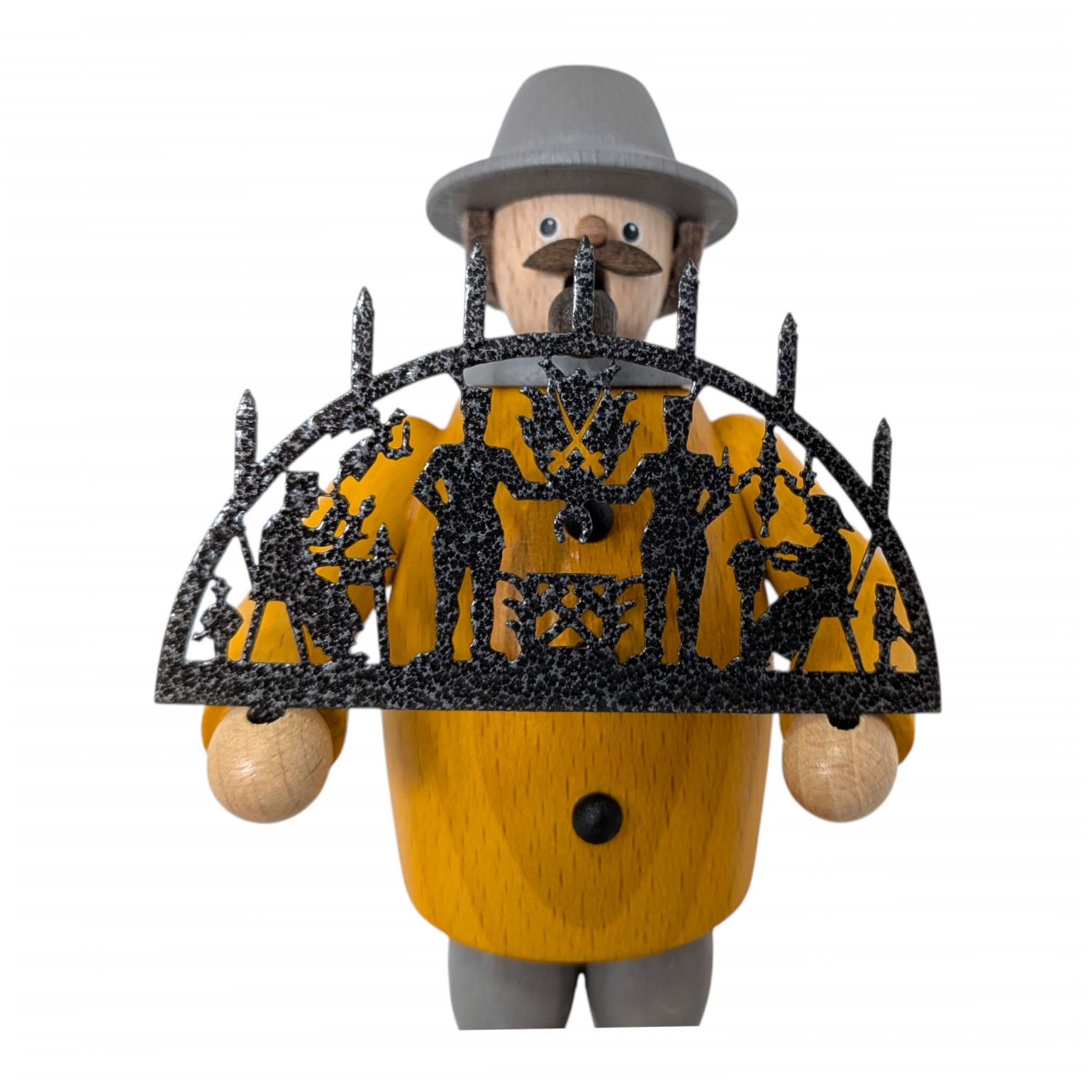 The true highlight of this figure is the intricately crafted candle arch made of dark metal, which the incense smoker proudly holds in both hands. The richly decorated arch depicts typical Erzgebirge motifs – craftsmen, miners, and Christmas scenes – and symbolizes this region’s deep connection to light, tradition, and community.