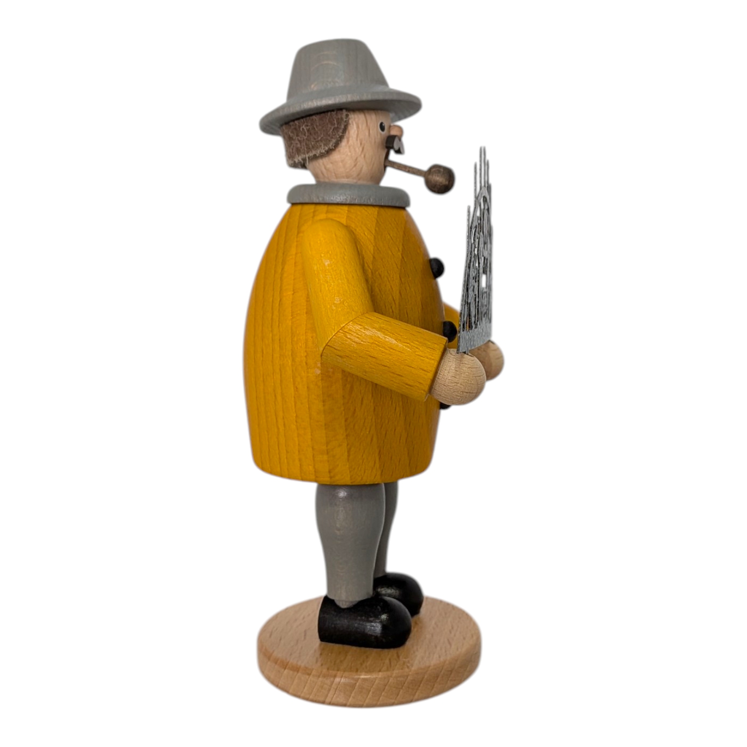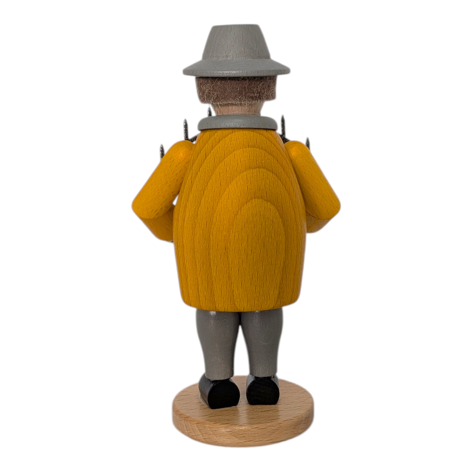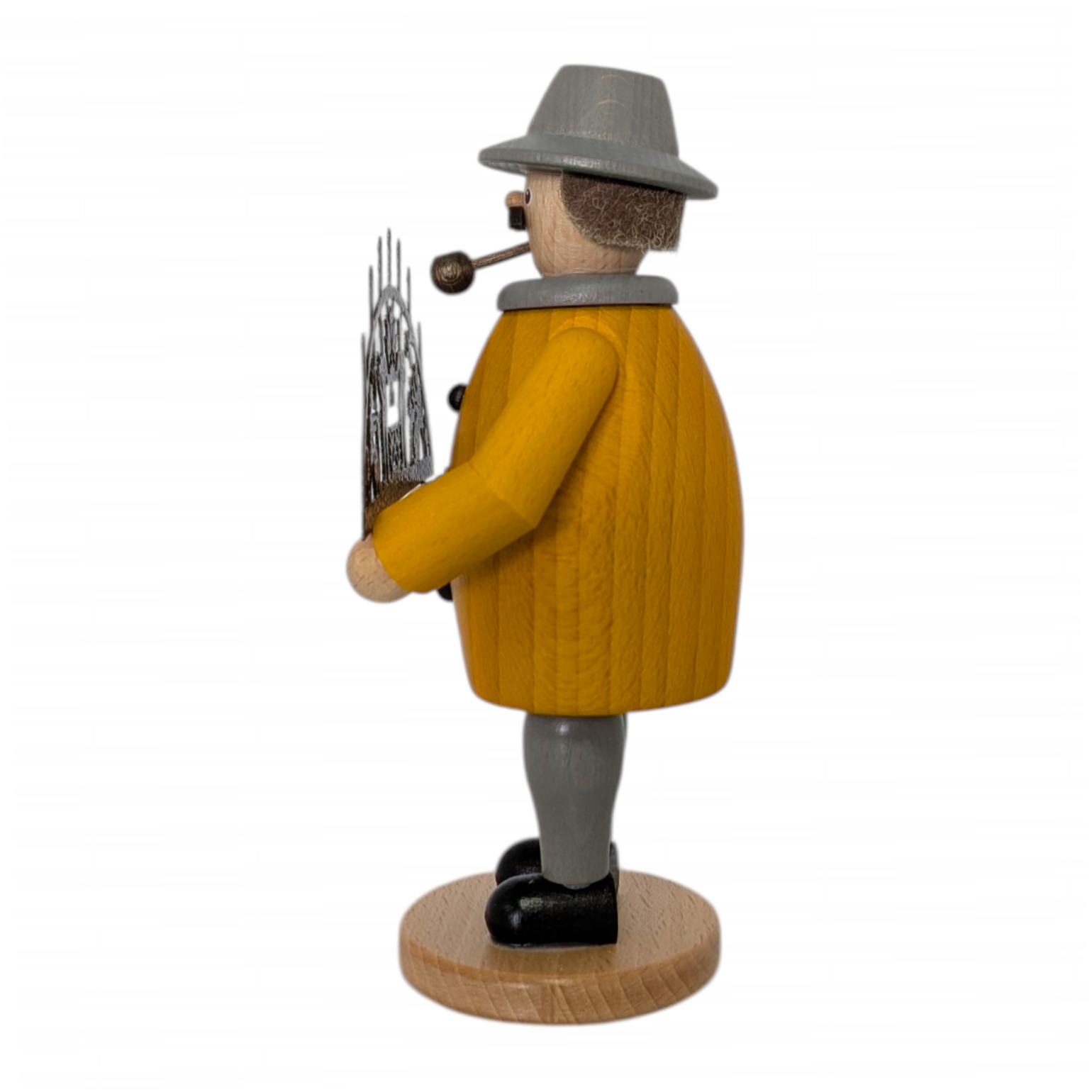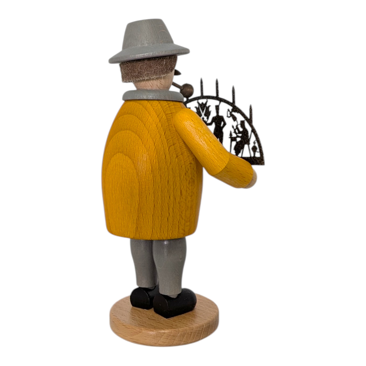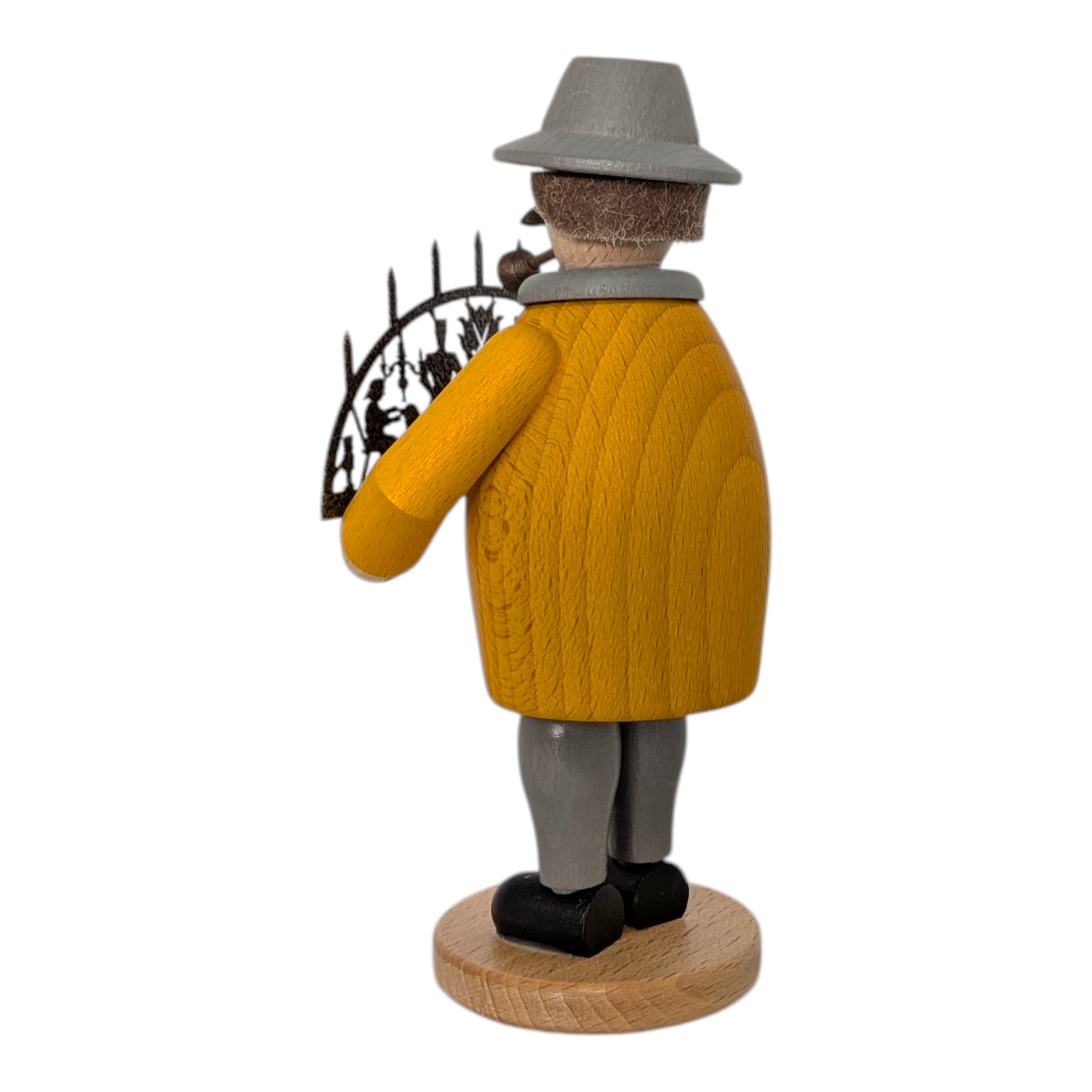 Clothed in a warm, bright yellow coat, the figure stands upright on a round, light-colored wooden base. The vibrant yellow jacket, in a rich mustard tone, beautifully showcases the grain of the local wood, giving the incense smoker its distinctive, warm character. Gray trousers and sturdy black shoes complete the rustic look.