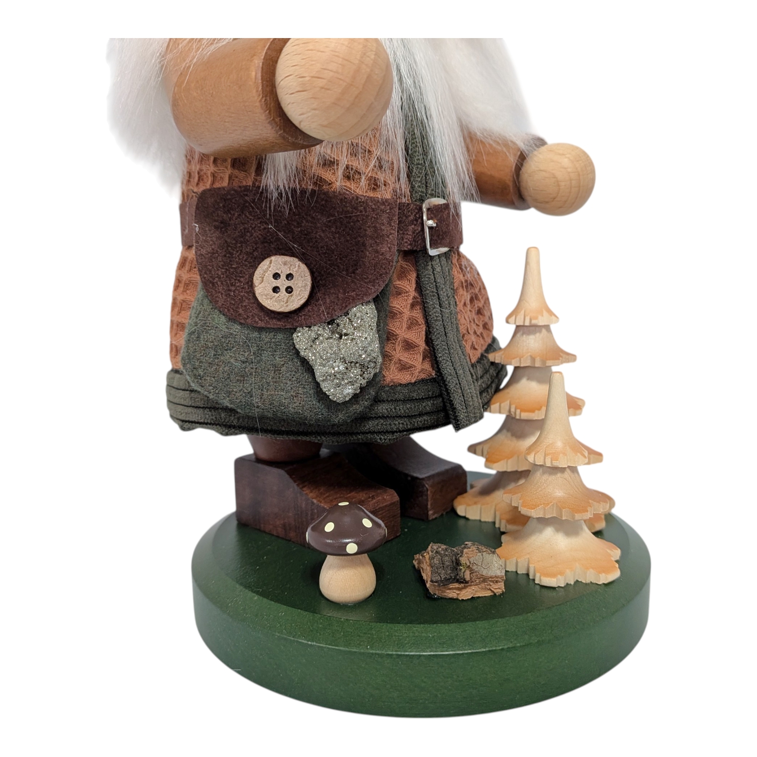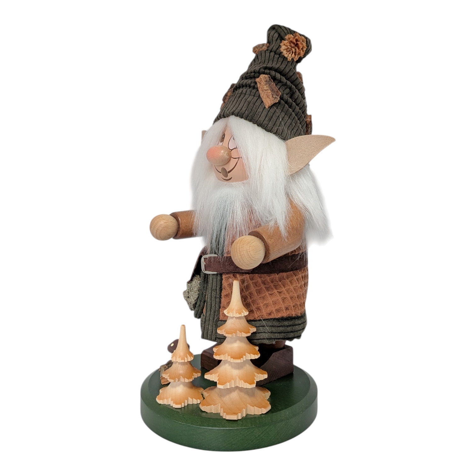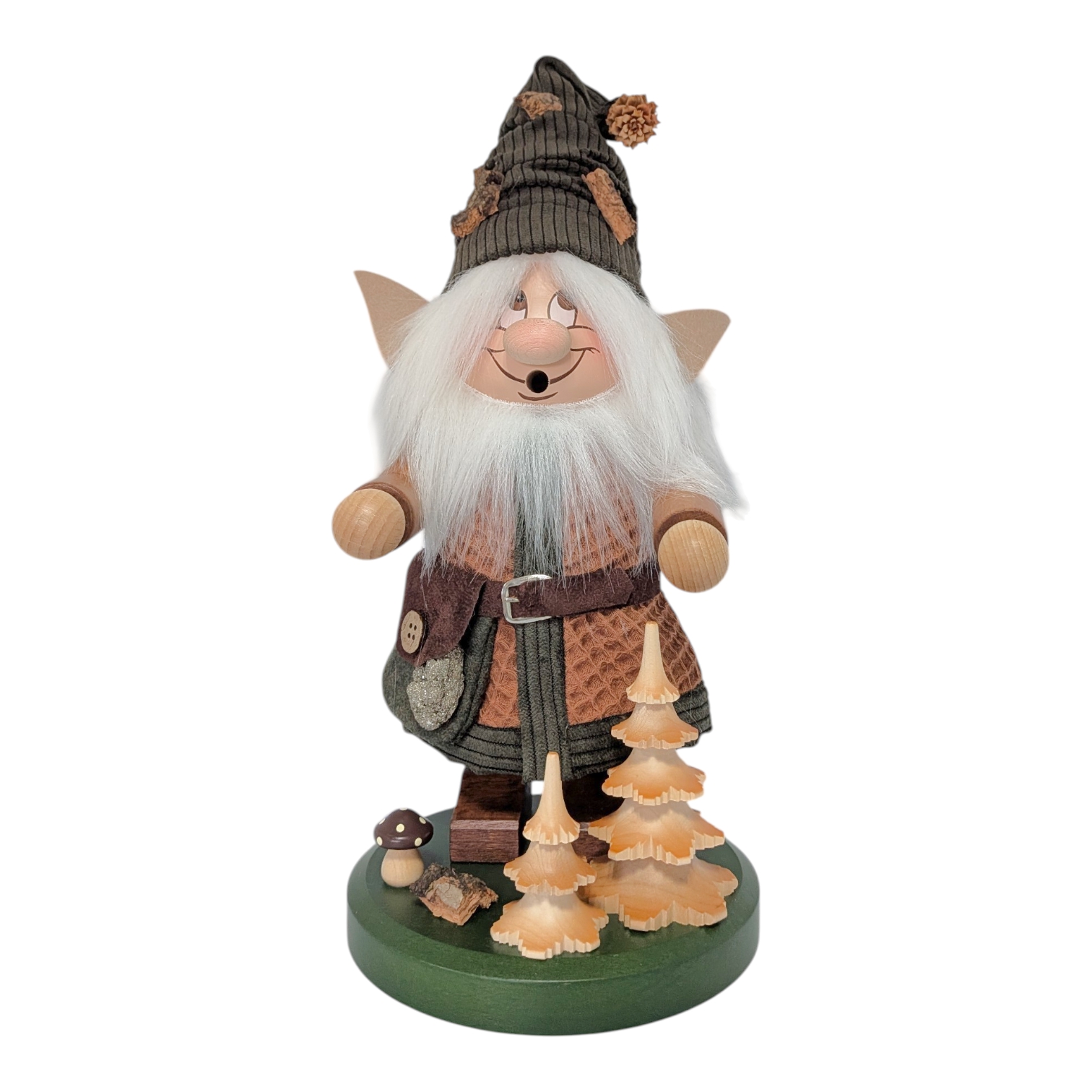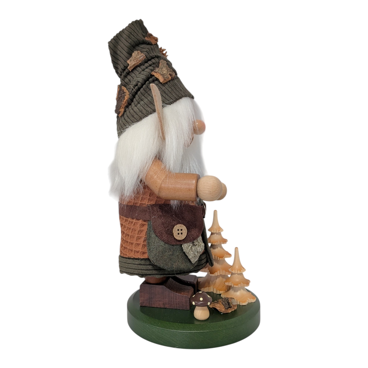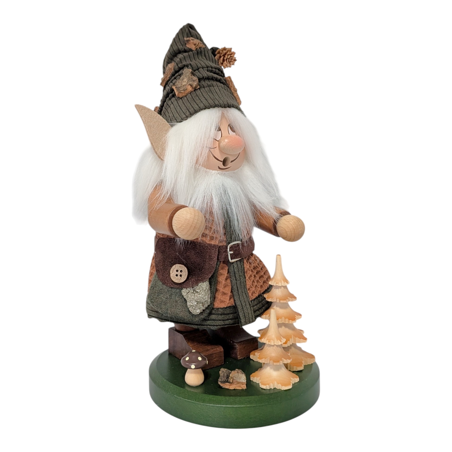 Besides its decorative function, the gnome is a genuine incense smoker: Inside, a small incense cone is placed, the smoke from which rises through the open mouth, bringing the figure to life in the traditional way. This forest elf combines Erzgebirge tradition with nature-inspired design and is an ideal gift for forest lovers and collectors alike.