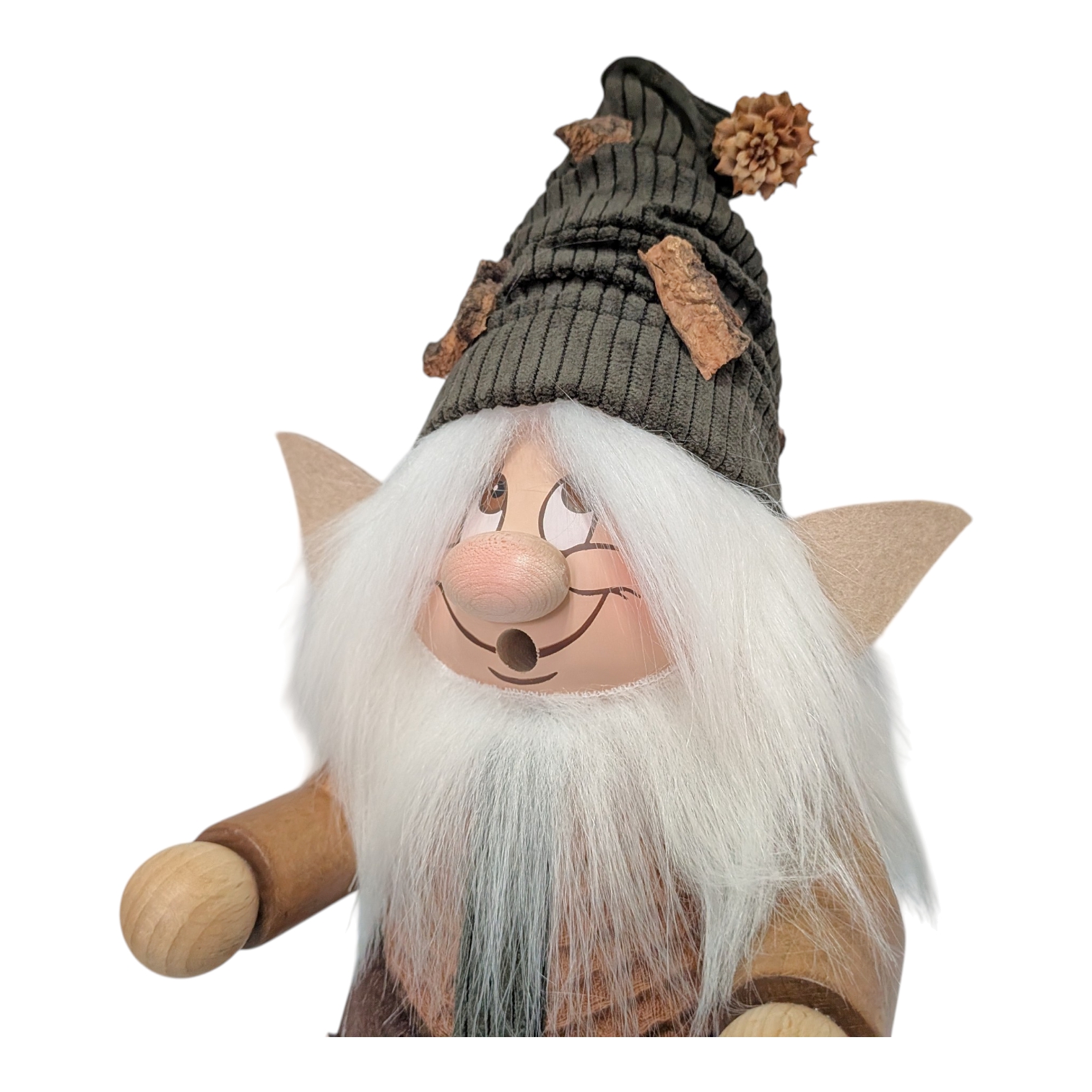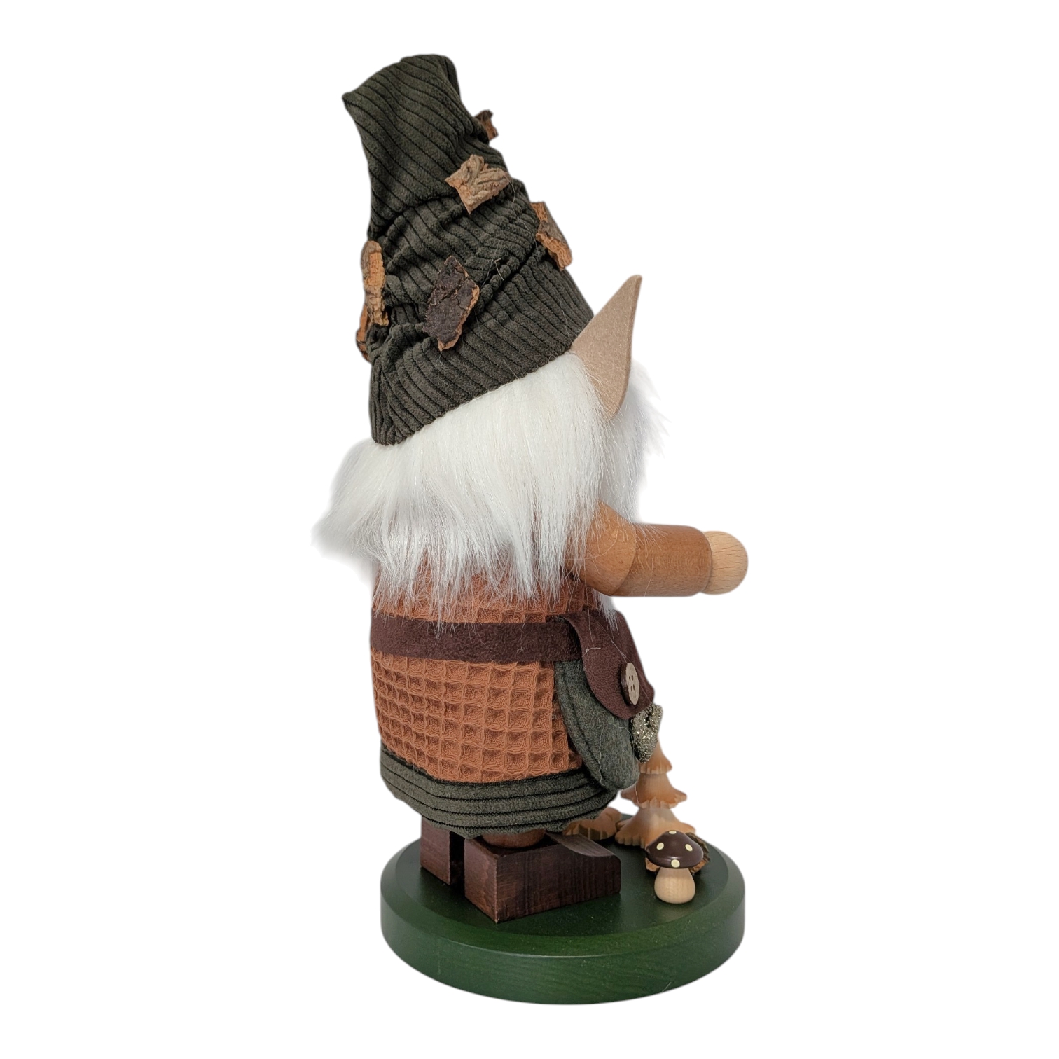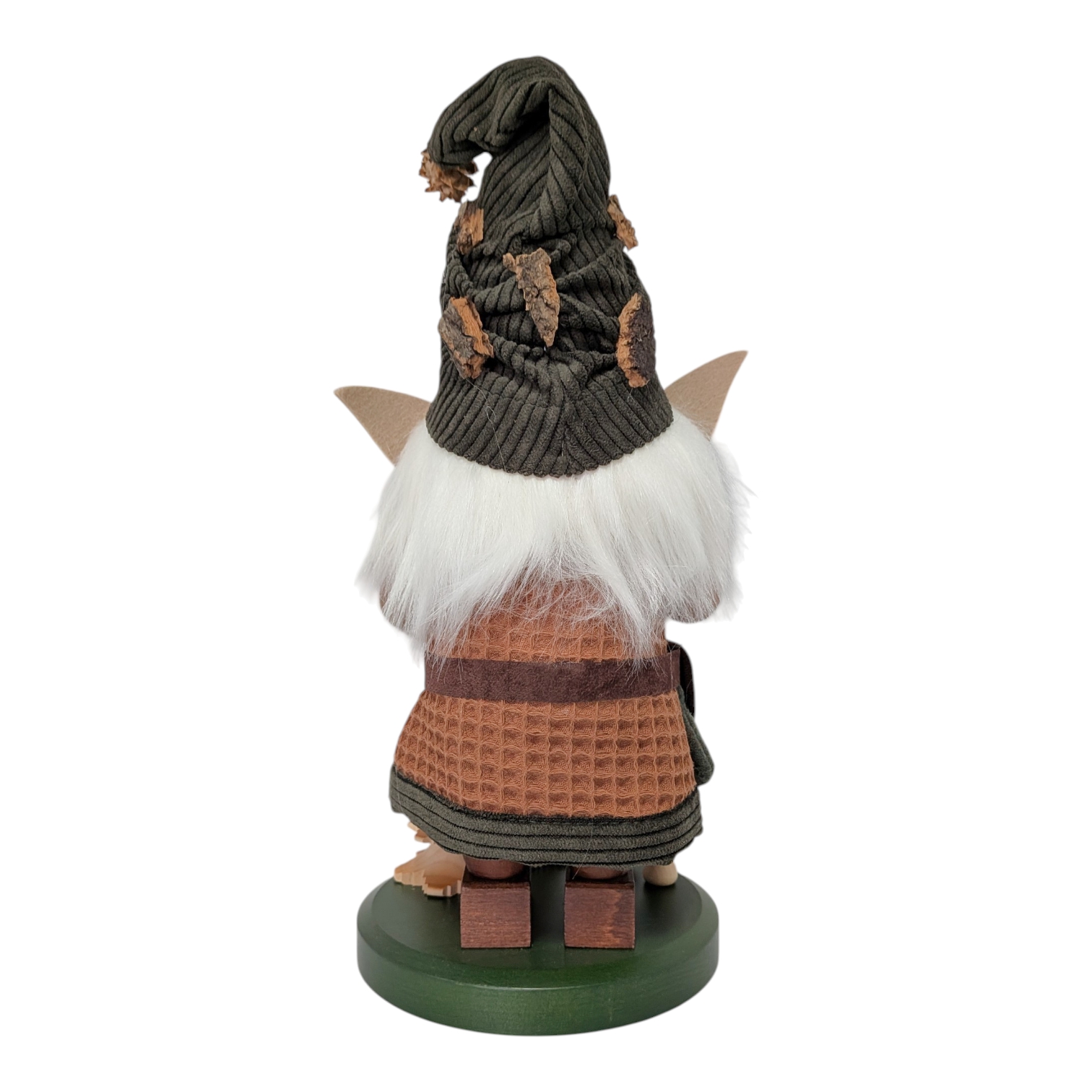 His head is adorned with a dark green pointed cap, carefully sewn from high-quality corduroy and decorated with pieces of real bark and a small pine cone as a pom-pom. No elaborate jewelry, no frills – just what the forest itself provides. Connected to nature down to the very last fiber.