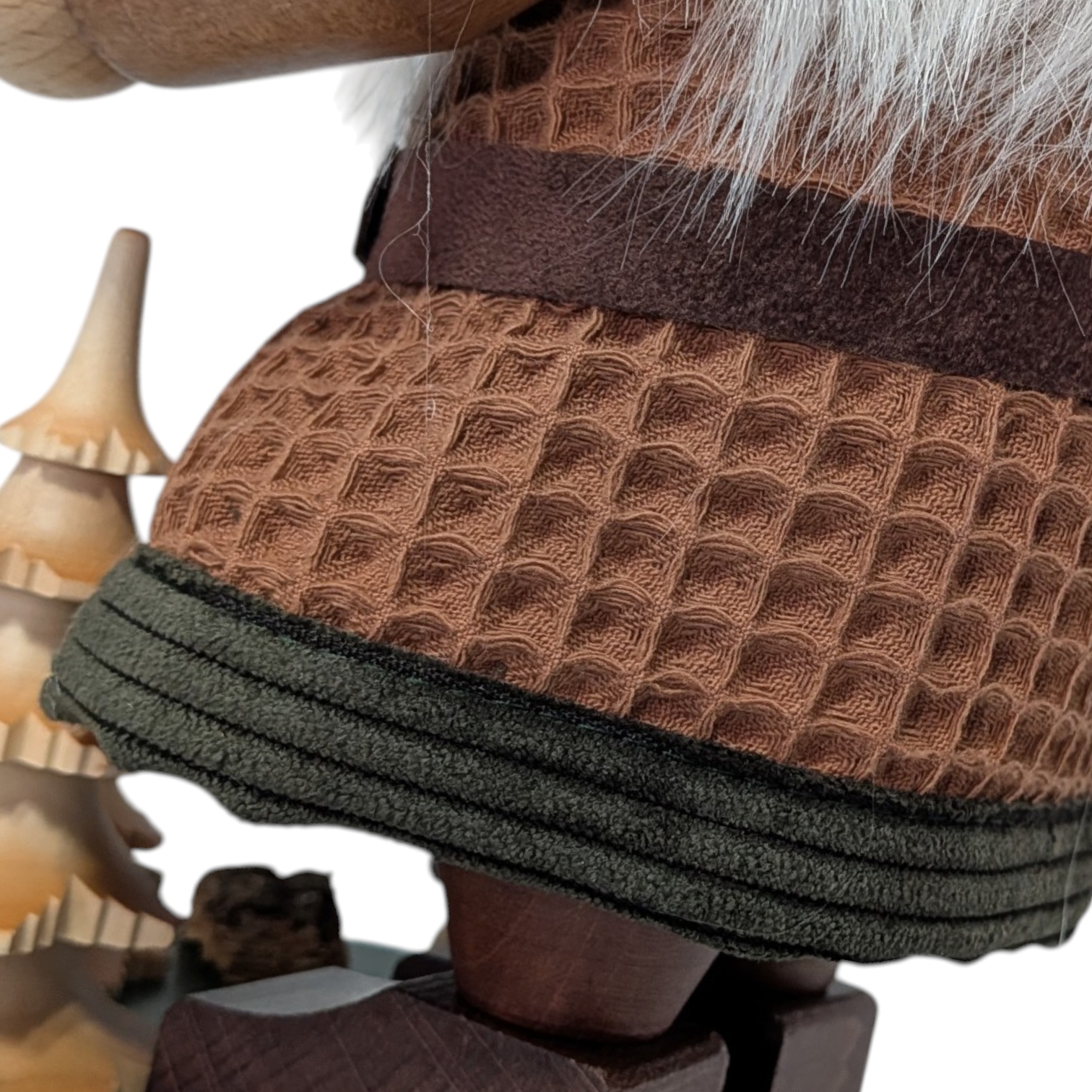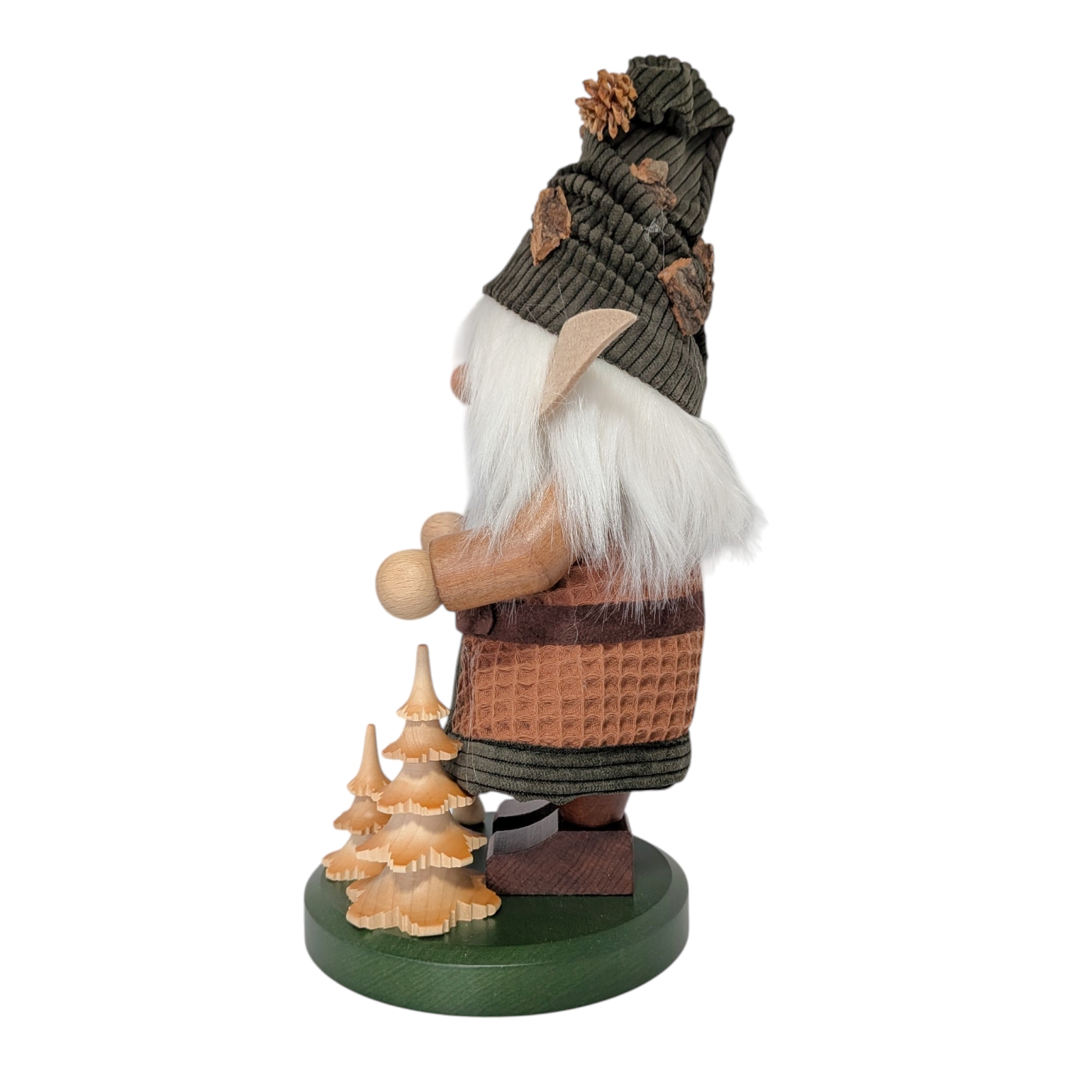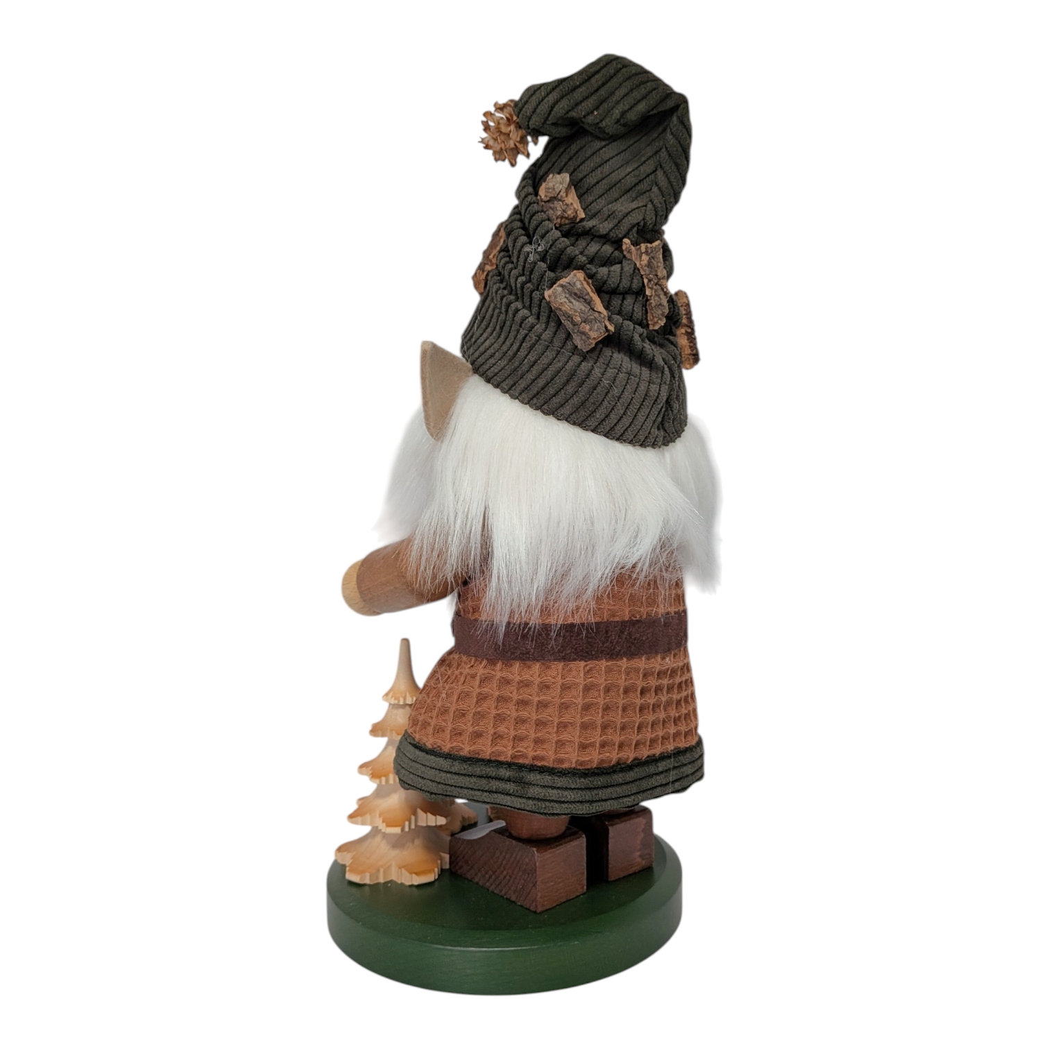 His head is adorned with a dark green pointed cap, carefully sewn from high-quality corduroy and decorated with pieces of real bark and a small pine cone as a pom-pom. No elaborate jewelry, no frills – just what the forest itself provides. Connected to nature down to the very last fiber.