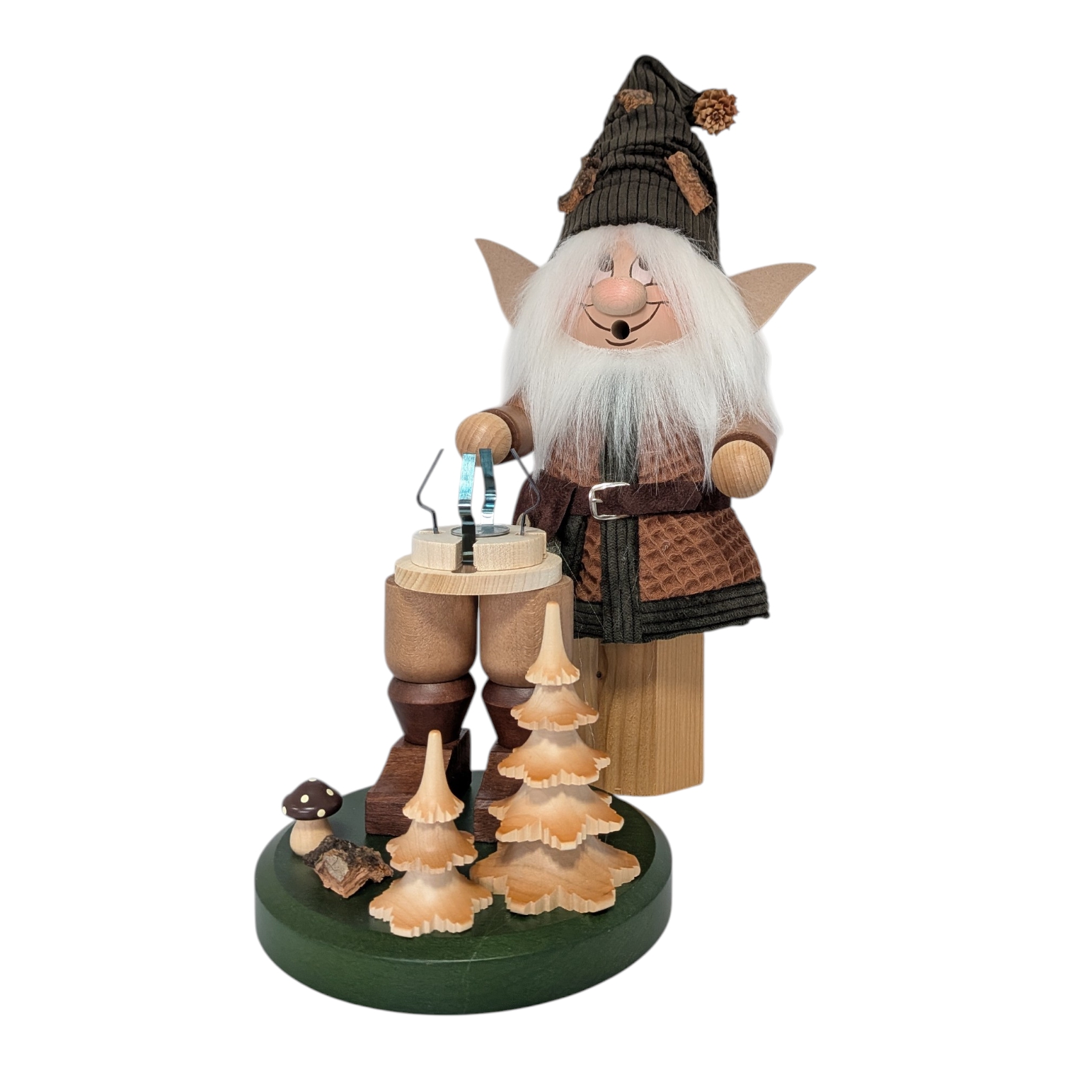 This charming incense smoker, a gnome wood elf, comes from the Christian Ulbricht workshop and is a prime example of Erzgebirge craftsmanship. Handcrafted with meticulous detail, it stands securely on a round, green base, enlivened by a small woodland scene featuring turned fir trees, a mushroom, and a piece of bark.