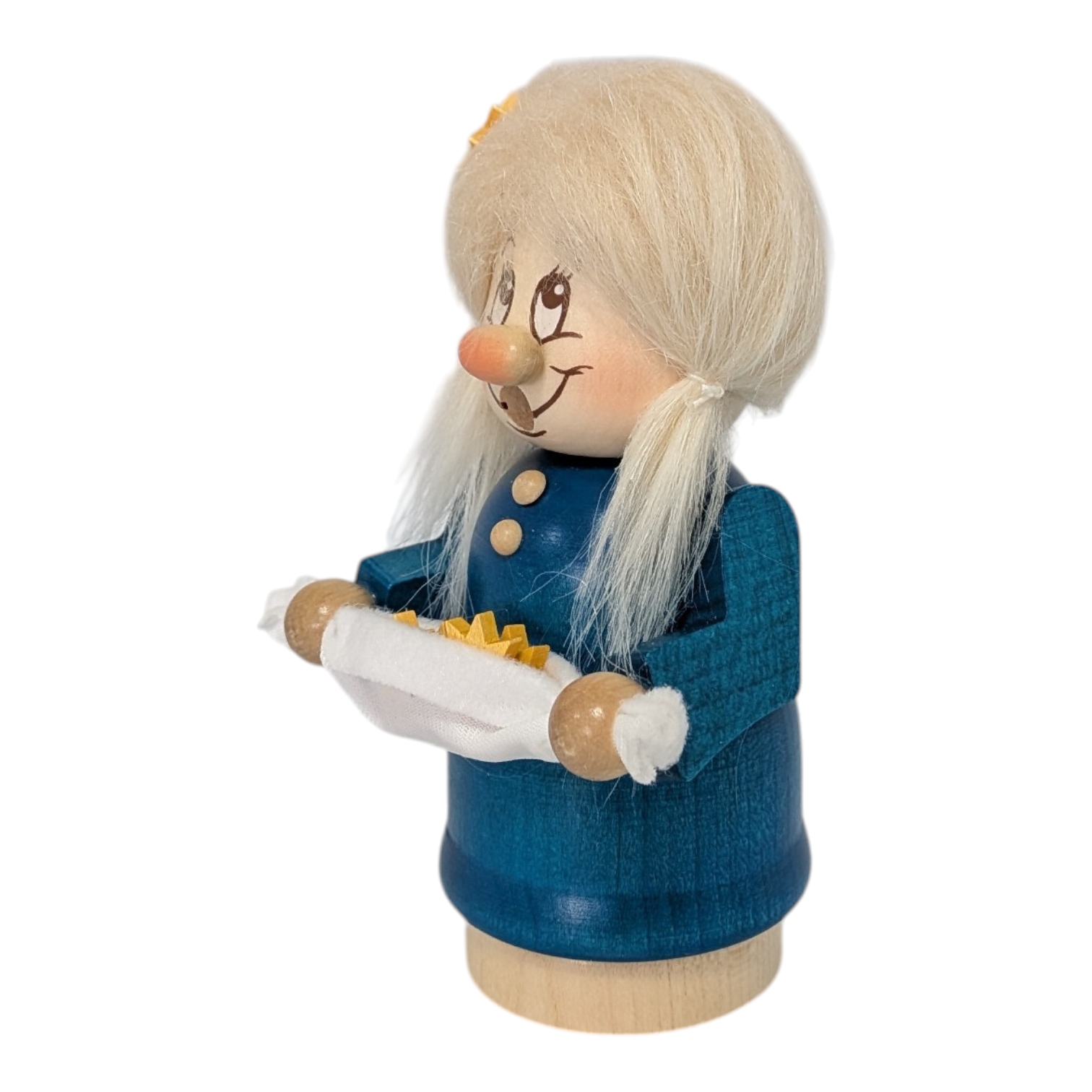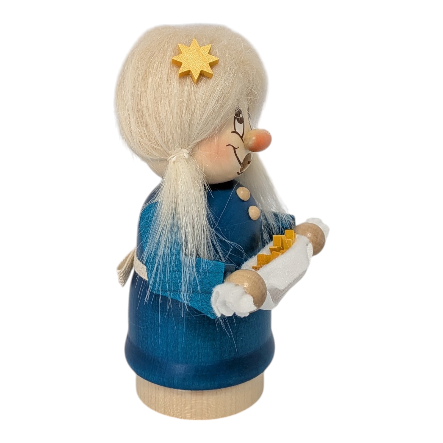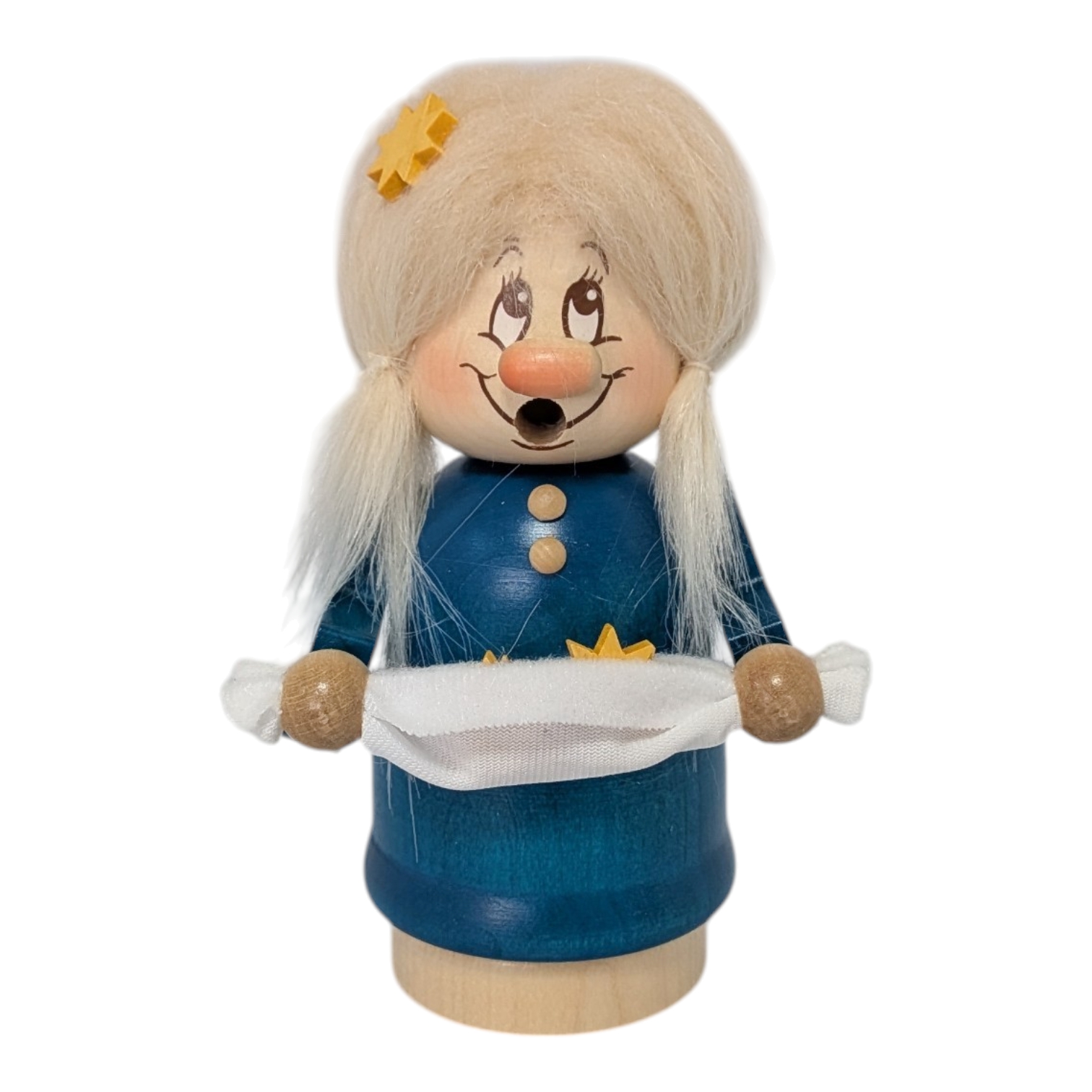Today, she carefully carries her precious stars on a white cloth, holding them lovingly in her small hands. Sterntaler is a distinctive girl with a golden star in her light, fluffy hair. Her blue dress with pretty buttons and white apron gives her a friendly and cheerful appearance, perfectly matching the radiance of the starry sky.