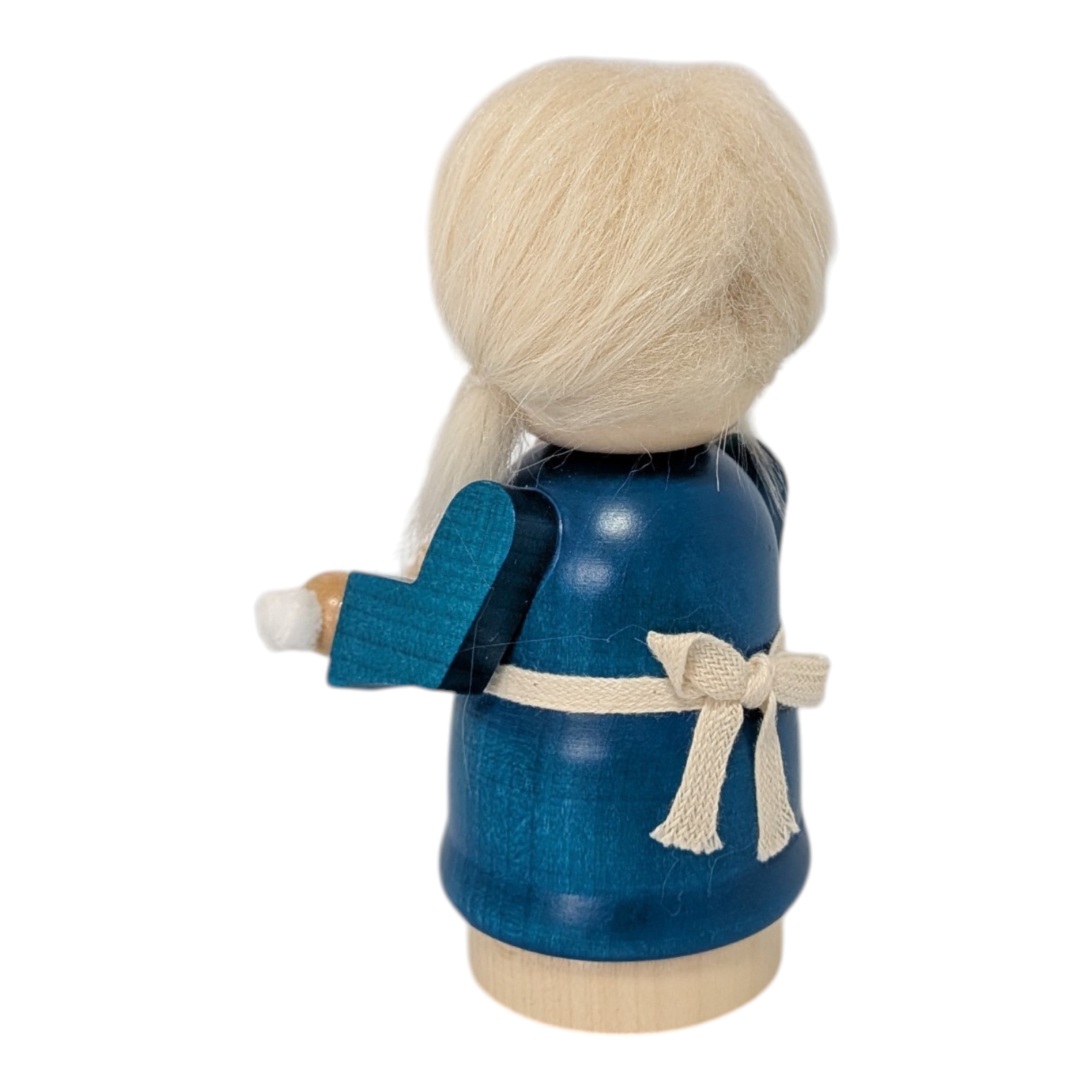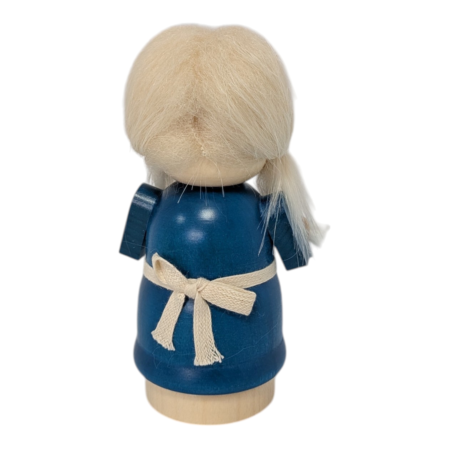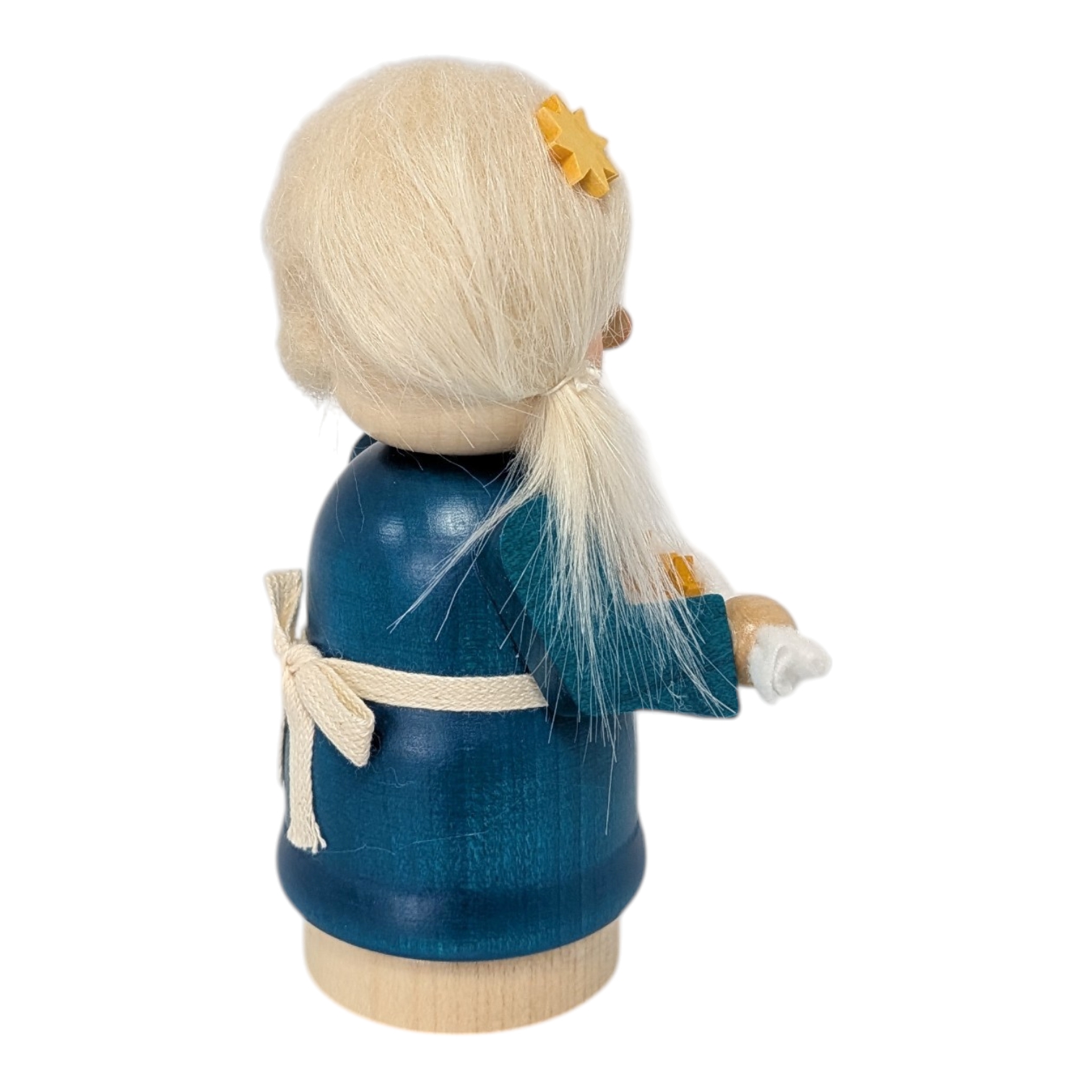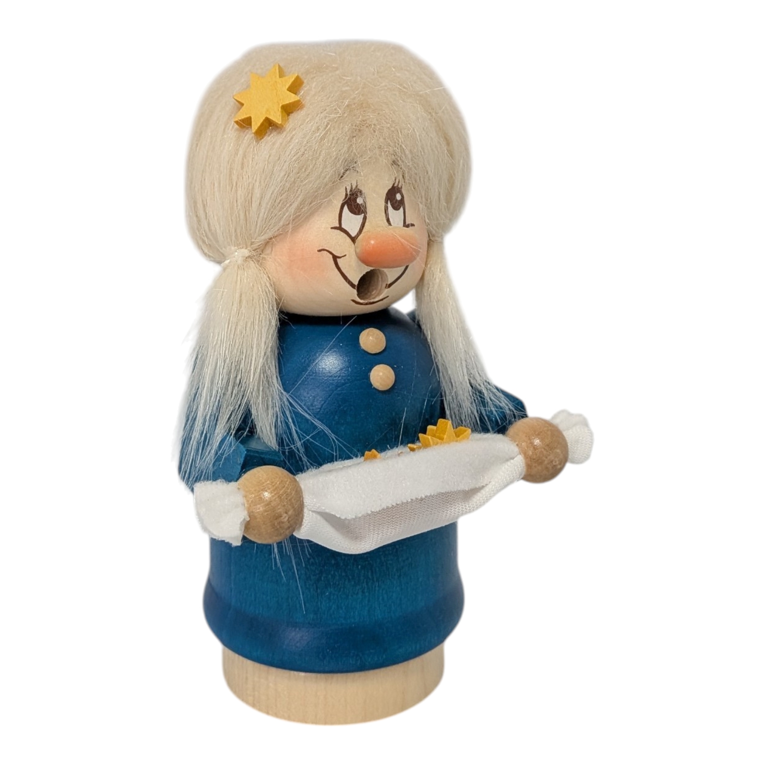 Today, she carefully carries her precious stars on a white cloth, holding them lovingly in her small hands. Sterntaler is a distinctive girl with a golden star in her light, fluffy hair. Her blue dress with pretty buttons and white apron gives her a friendly and cheerful appearance, perfectly matching the radiance of the starry sky.